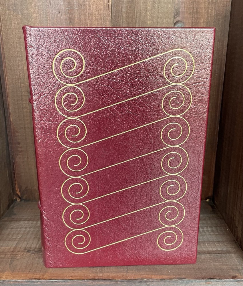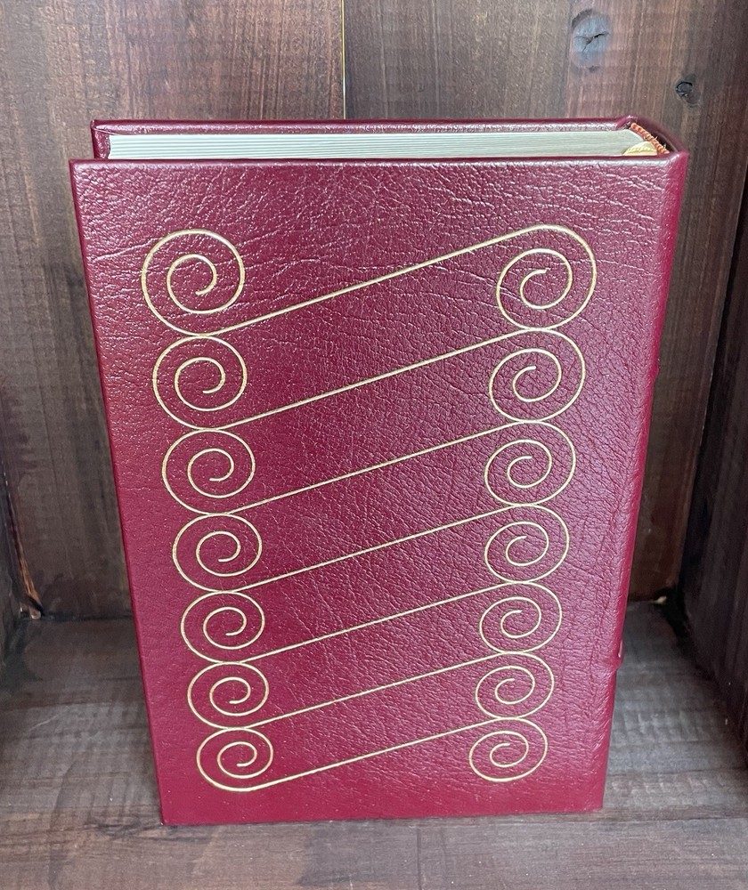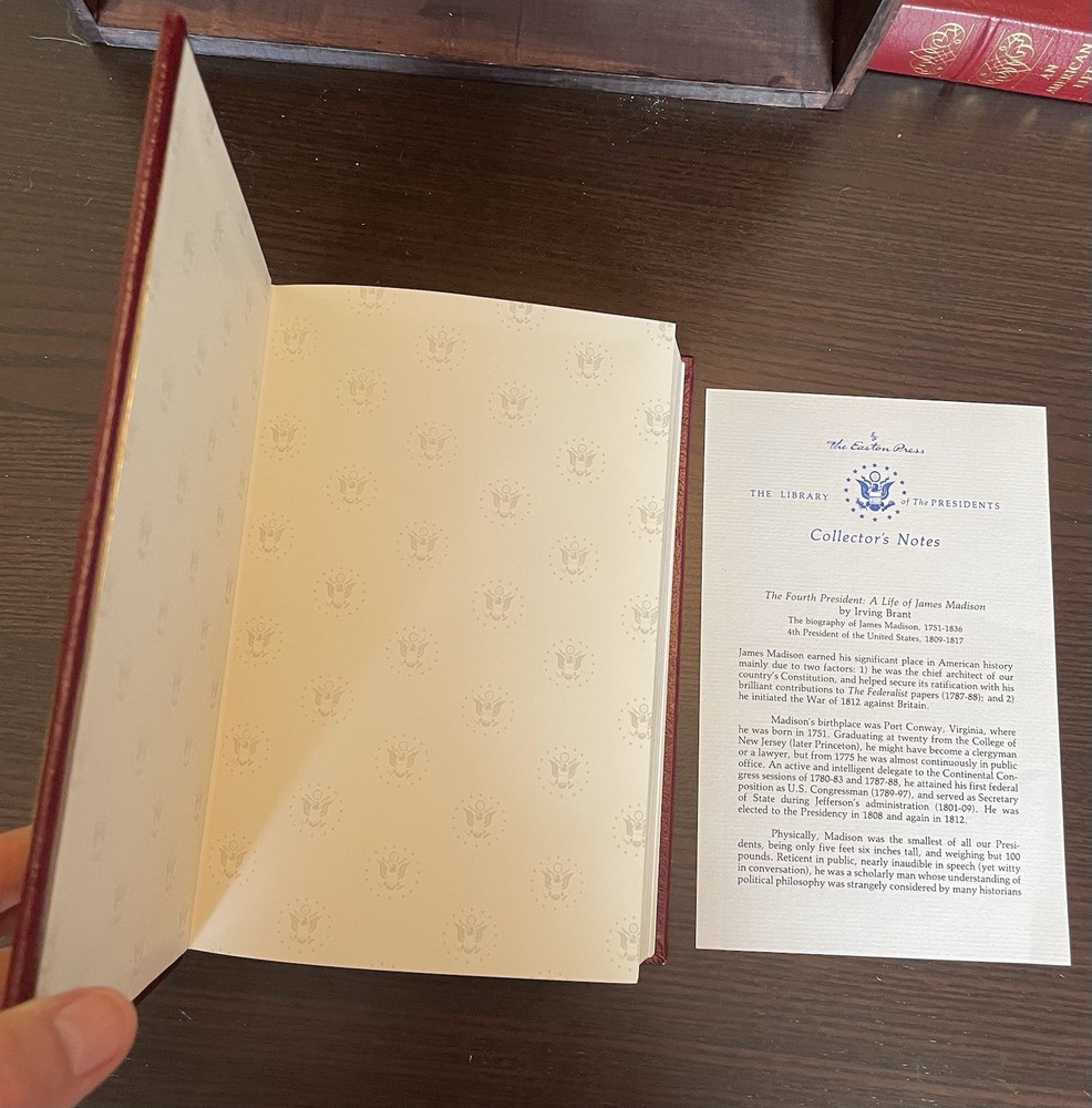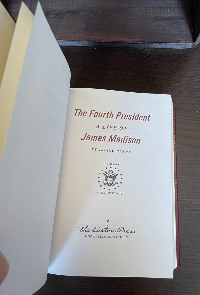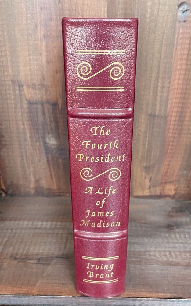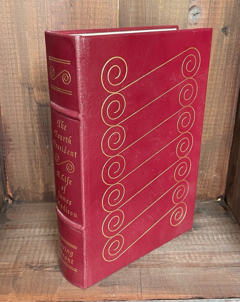 Offering this handsome deluxe leather fine binding edition of The Fourth President: The Life of James Madison by Irving Brant. Easton Press, 1985. The Library of the Presidents edition. Full leather hardcover decorated with 22k gold, and gold page edges, and attached ribbon page marker. Collector's Notes included. Some rubbing and wear to page edges (see picture). Else clean and unmarked with overall light wear. A nice copy!