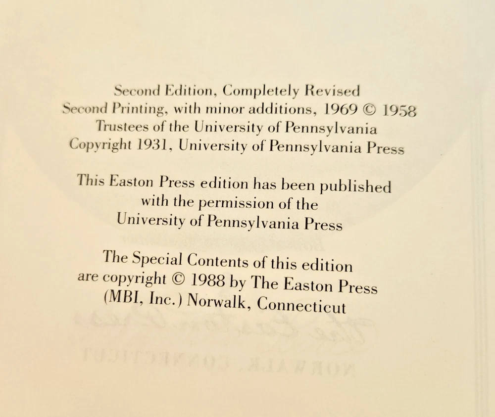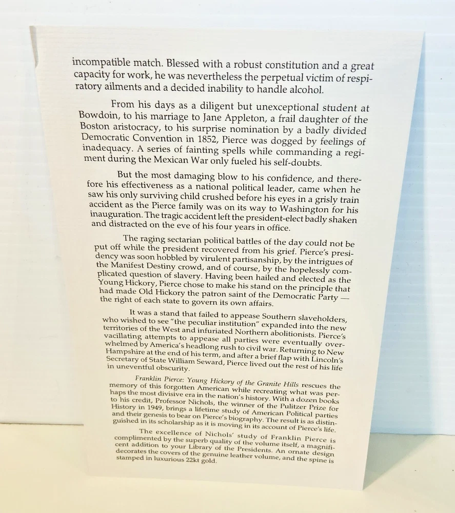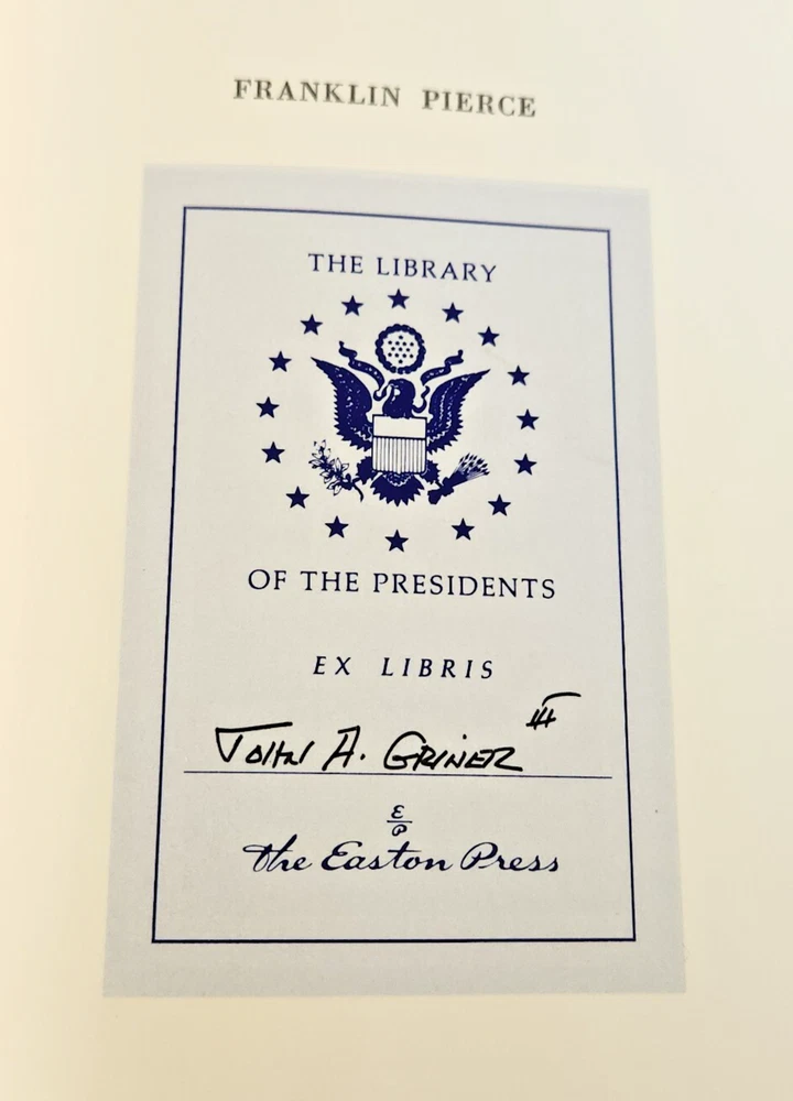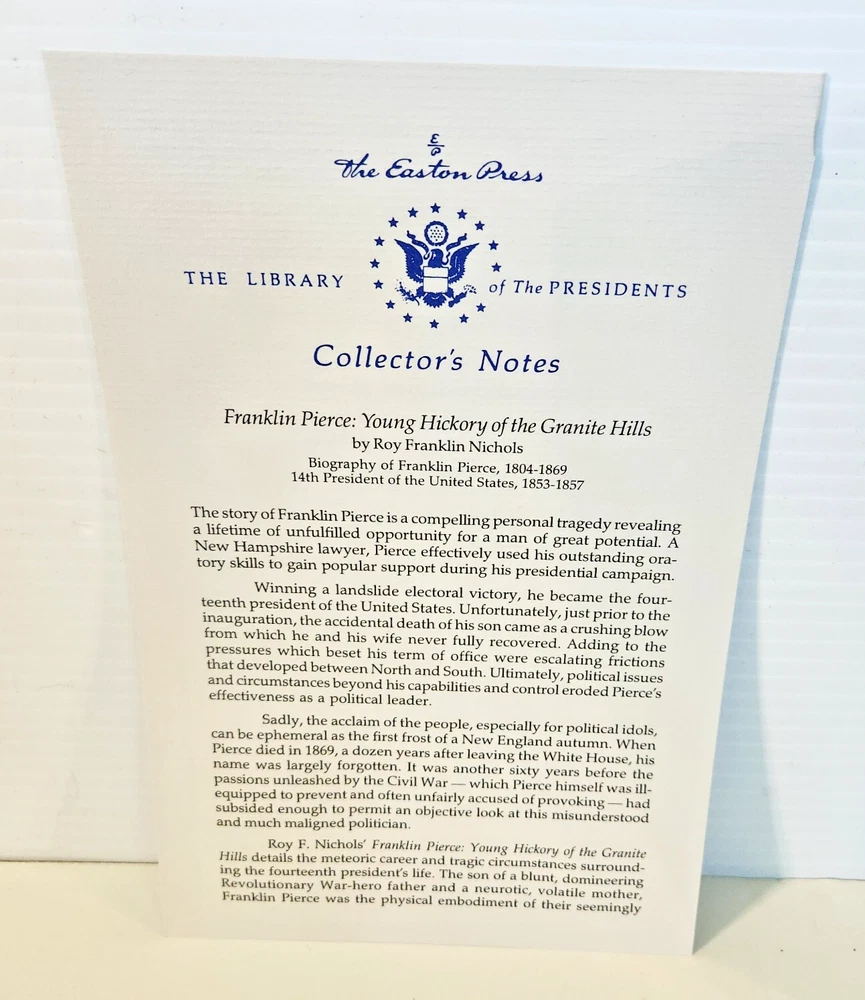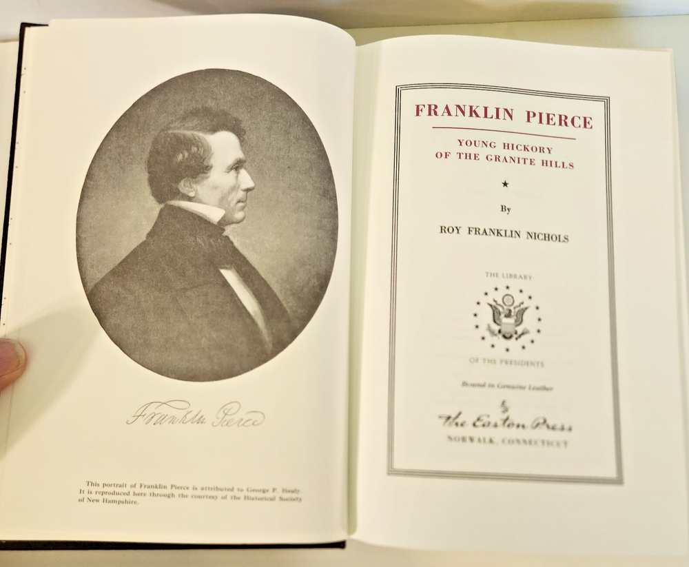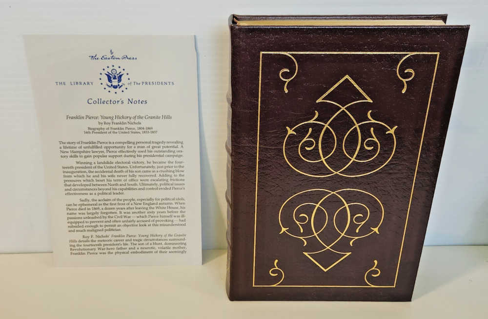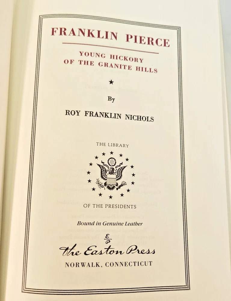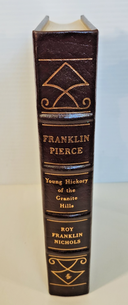 EASTON PRESS Franklin Pierce Young Hickory of the Granite Hills by Roy Franklin Nichols 1988 Leather-bound Presidents Collector's Edition Series 22kt gold accents deeply inlaid on the "hubbed" spine. Heavy duty binding boards enhance the book’s durability. Superbly printed on acid-neutral paper that lasts for generations. Sewn pages — not just glued like ordinary books. Handsome moiré end pages and a satin-ribbon page marker. Gilded page ends. Printed and bound in the USA using imported materials. Superb craftsmanship and commitment to quality. Condition – Very Good; ex Libris attached bookplate ; one light line on top gilding, may have some dust from storage. Smoke free history.