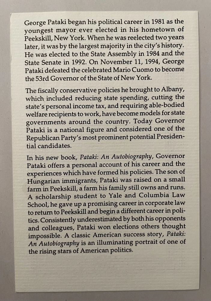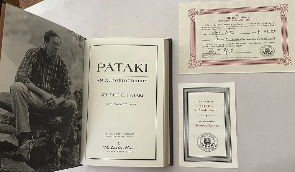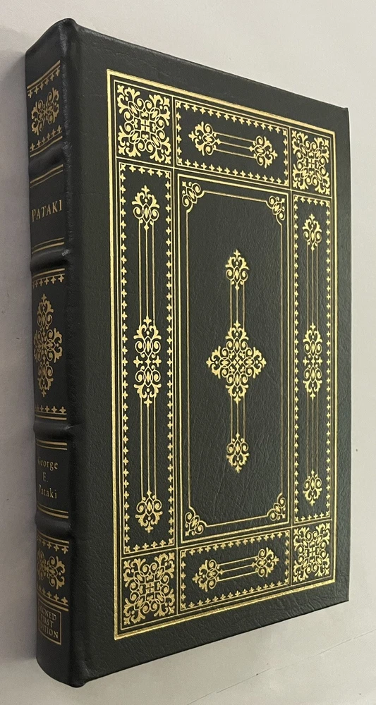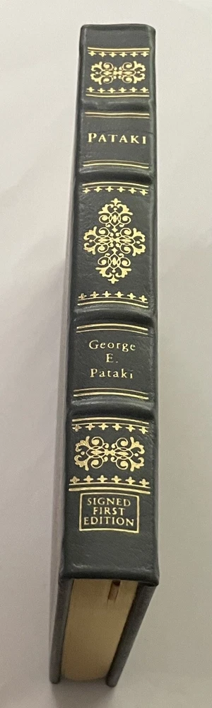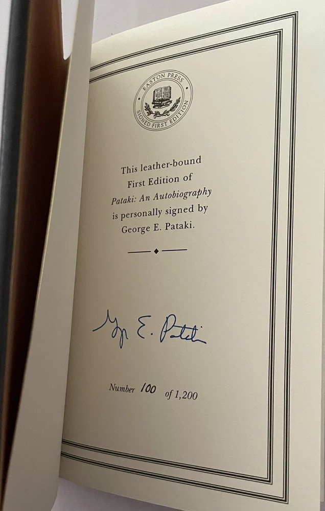Easton Press Pataki Autobiography by George E Pataki SIGNED First Edition Leather Collectors Edition Leatherbound collector’s edition features full-leather binding, 22-my gold stamping to covers and spine, silk endpapers, a satin ribbon page marker, and all edges gilt. Book is in fine condition (faint edgewear, faint wear to gilt on page edges, no marks inside, no embossed seal, no attached bookplate). Includes certificate of authenticity and note card that was supplied by Easton Press.