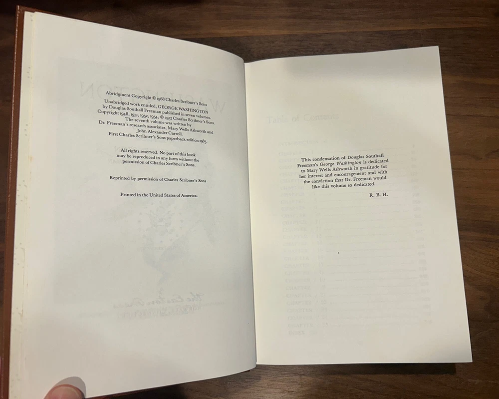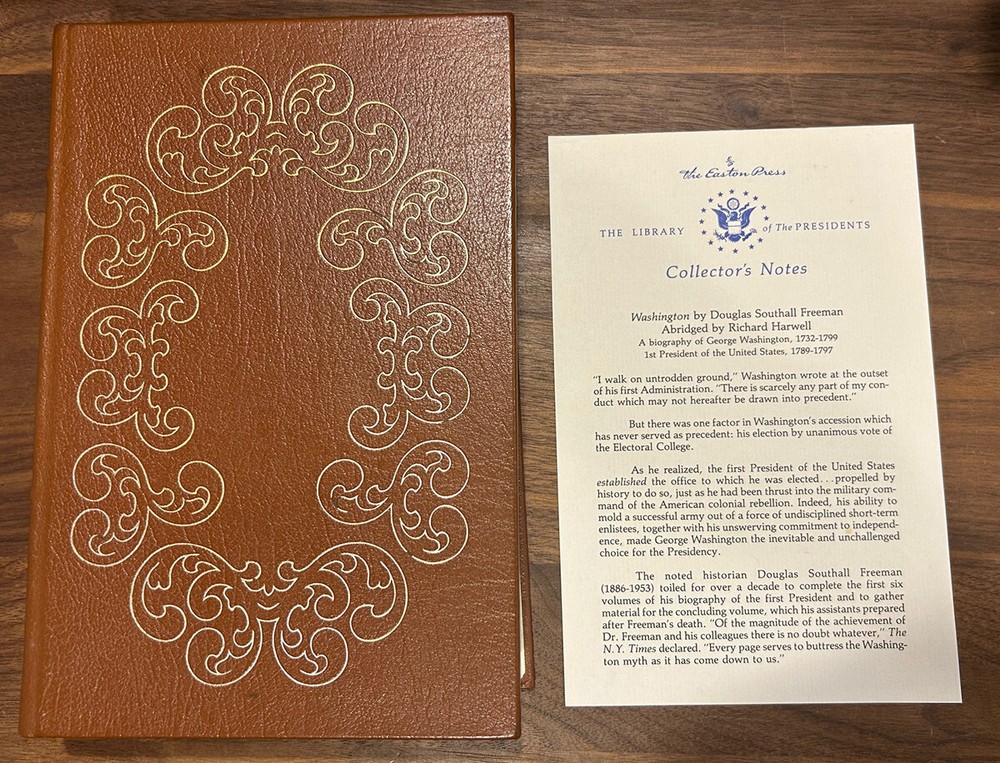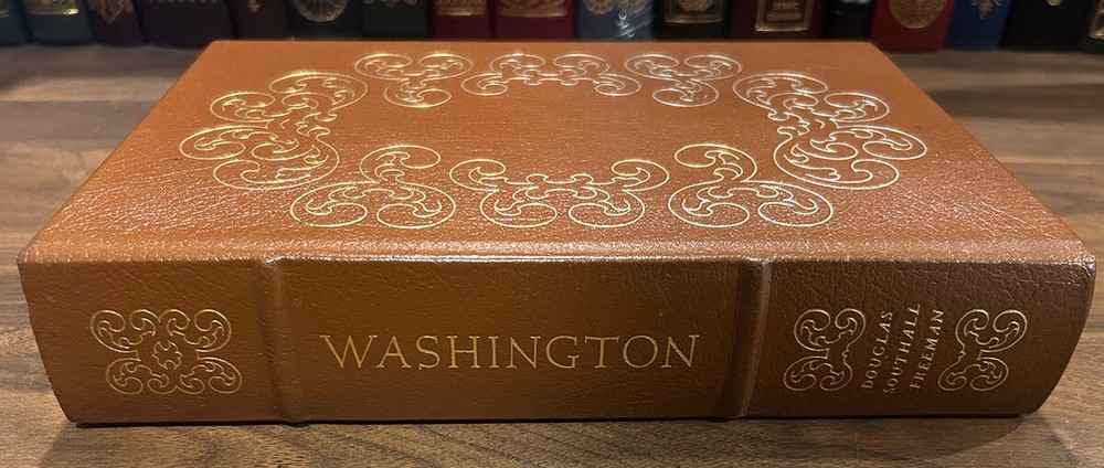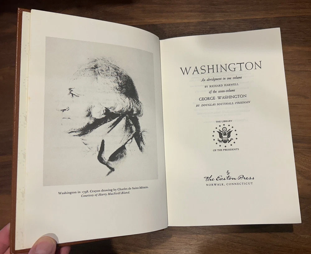 Washington - Douglas Southall Freeman - Collector's Edition / Easton Press For this Easton Press offering, the text of Freeman and Harwell's Washington has been printed on specially manufactured paper from the venerable Finch Pruyn mill in Glens Falls, NY. Each copy has been carefully bound in a rich brown leather and stamped on the spine in 22kt gold. A foliate design has been inlaid on the front and back covers. Please see pics closely for details. There is some black marks on cover and back and book has some age. Douglas Southall Freeman Washington Special Edition Bound in Genuine Leather The Easton Press The Library of the Presidents Includes Collector's Notes