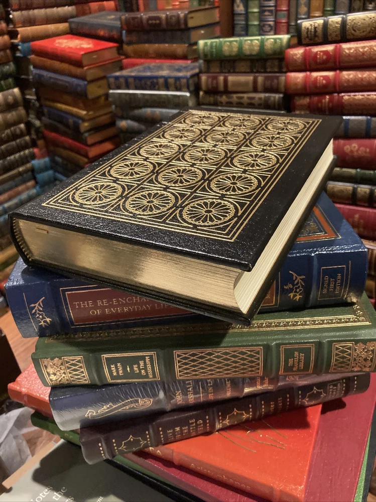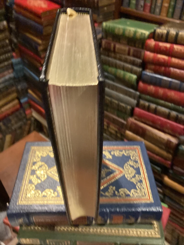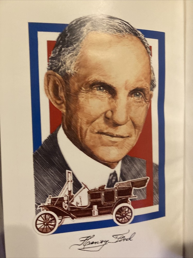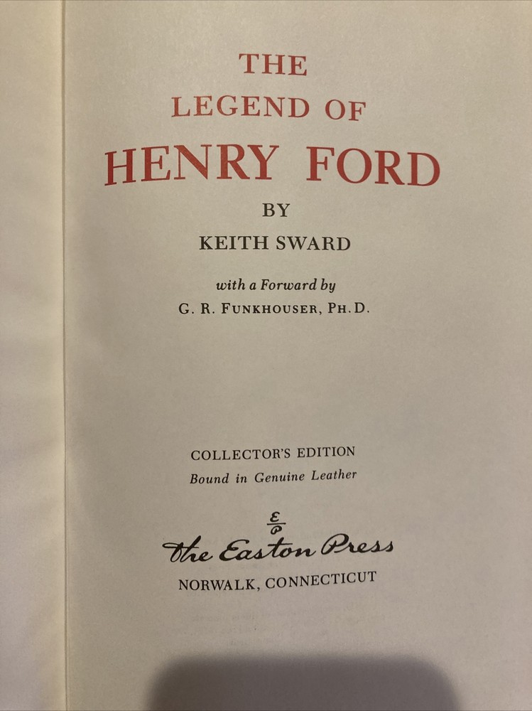 Easton Press leather edition of Keith Sward's "The Legend of Henry Ford," Foreword by G.R. Funkhouser, Ph.D., one of the LIBRARY OF GREAT LIVES series, published in 1989. Bound in hunter green leather, the book has camel tan moire silk end leaves, a satin book marker, acid-free paper, Symth-sewn binding, hubbed spine, gold gilding on three edges---in near FINE condition. COLLECTOR'S NOTE is included. Henry Ford, who lived from 1863 – 1947, was an American industrialist, business magnate, founder of the Ford Motor Company, and chief developer of the assembly line technique of mass production. By creating the first automobile that middle-class Americans could afford, he converted the automobile from an expensive luxury into an accessible conveyance that profoundly impacted the landscape of the 20th century.His introduction of the Ford MODEL T automobile revolutionized transportation and American industry. As the Ford Motor Company owner, he became one of the richest and best-known people in the world. He is credited with "Fordism," the mass production of inexpensive goods coupled with high wages for workers. Ford had a global vision, with consumerism as the key to peace. His intense commitment to systematically lowering costs resulted in many technical and business innovations, including a franchise system that put dealerships throughout North America and major cities on six continents. Ford left most of his vast wealth to the Ford Foundation and arranged for his family to permanently control it. Ford's stature as a revolutionary technologist was heightened by the fact that his corporation was family-owned. Ford was also widely known for his pacifism during the first years of World War I---threatening his employees that they would lose their jobs if they heeded President Wilson's call-up for patrol duty along the Mexican border n 1916. However, Ford supported the war effort in World War 2 when he closed his automobile factories and converted them to produce airplane parts at his Willow Run factory. Henry Ford put American on wheels, changing the nation's appearance and its way of life. In 1914, Ford began paying workers $5.00 per day when the average wage was $11.00 per week. Ford was eccentric and in the 1930s he demanded that his employees stop drinking liquor either in public or even in the privacy of their homes----or face the pain of dismissal. In 1926, he instituted the 40-hour work week. Ford was a major force in shaping modern America. He dallied with mechanized farming, became a square dance fanatic, and established an immense, eclectic museum of nostalgia---even if he did once say that "history was more or less bunk!" Ford knew the other "shakers and movers" of his time including THOMAS EDISON, HARVEY GOODYEAR, CHARLES LINDBERGH, and PRESIDENTS HOOVER, ROOSEVELT and TRUMAN. 501 pages, including an Index. I offer Combined shipping.