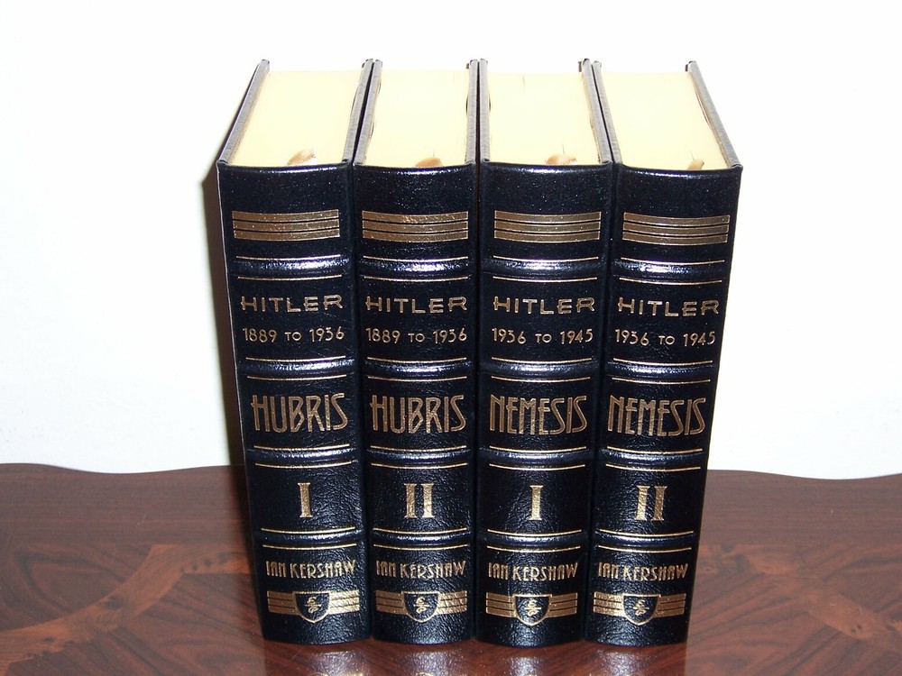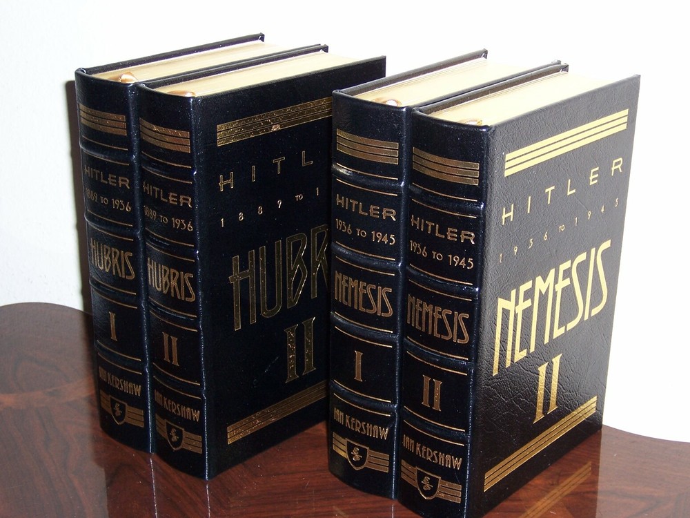 Heirloom edition Easton Press HITLER in 4 volumes by Ian Kershaw Black leather binding measured by 6 1/4" x 9 1/2" out-of-print, do not miss out this good deal Copyright by The Easton Press hubbed spine, bound in premium full leathers distinctive cover design, beautiful illustrations handsome, readable typefaces, permanent satin ribbon page marker elegant gilded page edges, endsheets of rich moire fabric thread-sewn pages for durability and strength, long-lasting high quality, acid-neutral paper LIST OF TITLES: a complete series in 4 volumes: 1. HITLER 1889 TO 1936 HUBRIS, Vol. I 2. HITLER 1889 TO 1936 HUBRIS, Vol. II 3. HITLER 1936 TO 1945 NEMESIS, Vol. I 4. HITLER 1936 TO 1945 NEMESIS, Vol. II CONDITION DESCRIPTION: Like new and unread condition, clean inside, binding is tight and gold page edging still shiny, beautiful bright endleaves and satin ribbon page marker. This set could be a precious addition to your family library. SHIPPING / HANDLING: Book(s) will be handled/packed very safely, and shipped via USPS media mail with delivery confirmation.