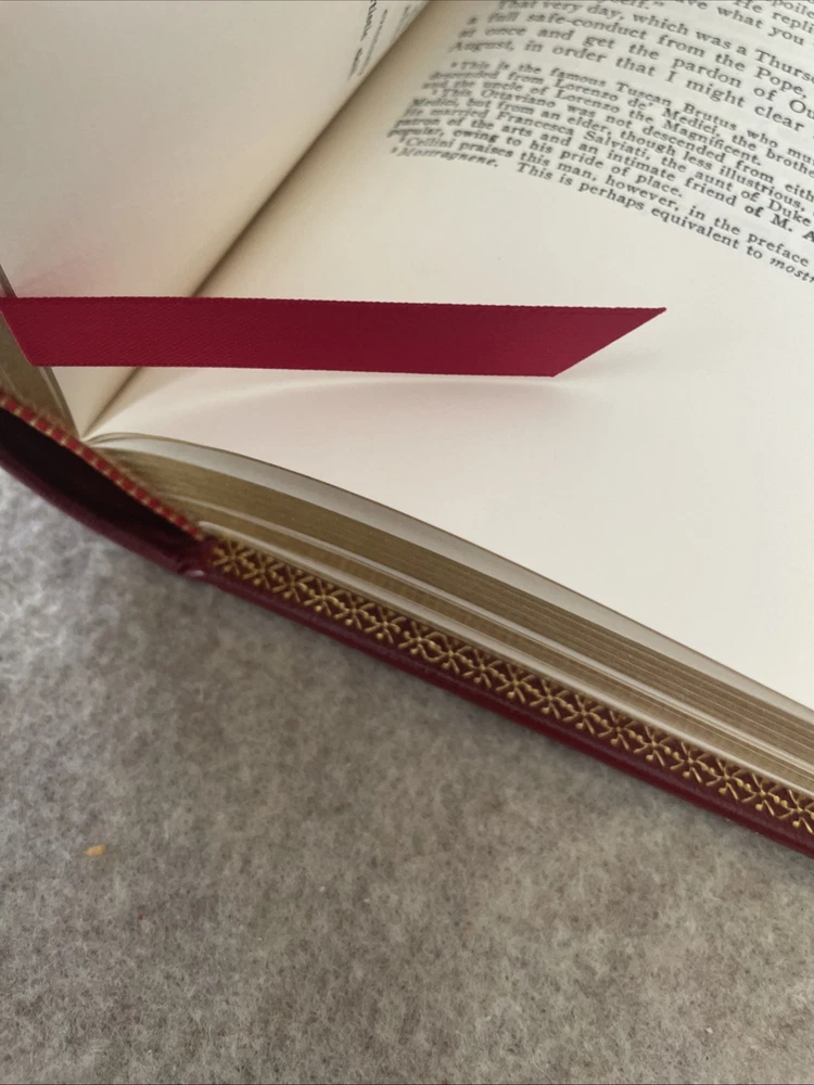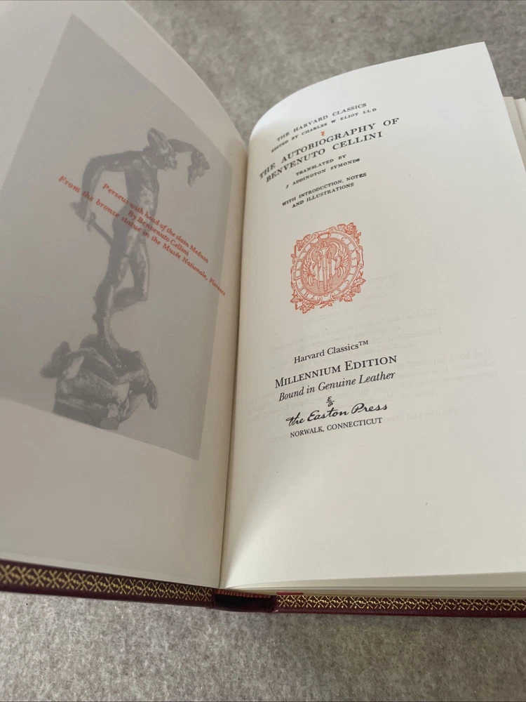 Easton Press Harvard Classics Eliot Edition The Autobiography of Benvenuto Cellini The book is full leather. There is no bookplate in the book. This book is in near mint condition with no wear. It was never read. The gold on the covers looks like new. The end pages show no fading. The gilt on the edge of the pages is in almost perfect condition with a scratch on the bottom. Please see photos. We try to describe as accurately as possible so you will be satisfied with your purchase. We have more books from this set on eBay and we would be happy to combine on shipping to save you money.