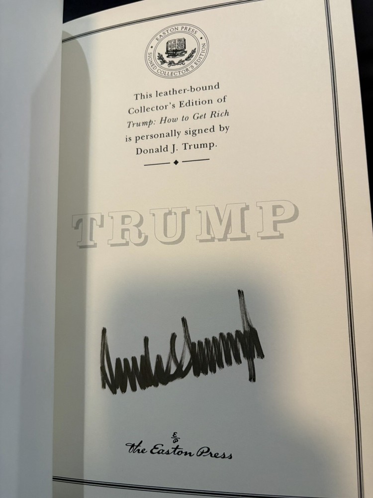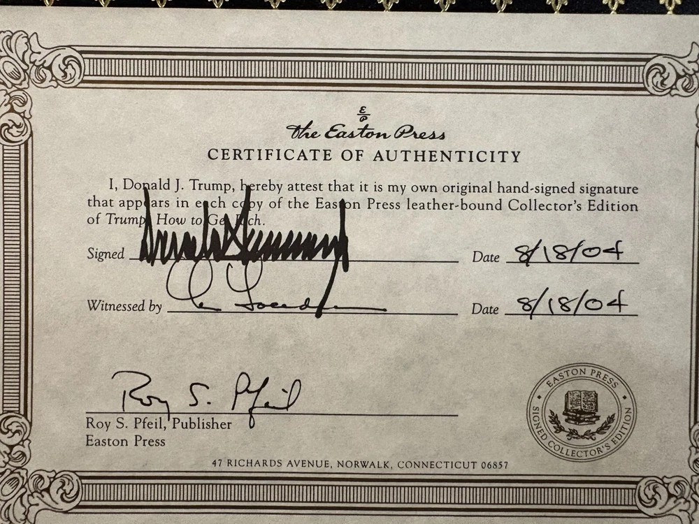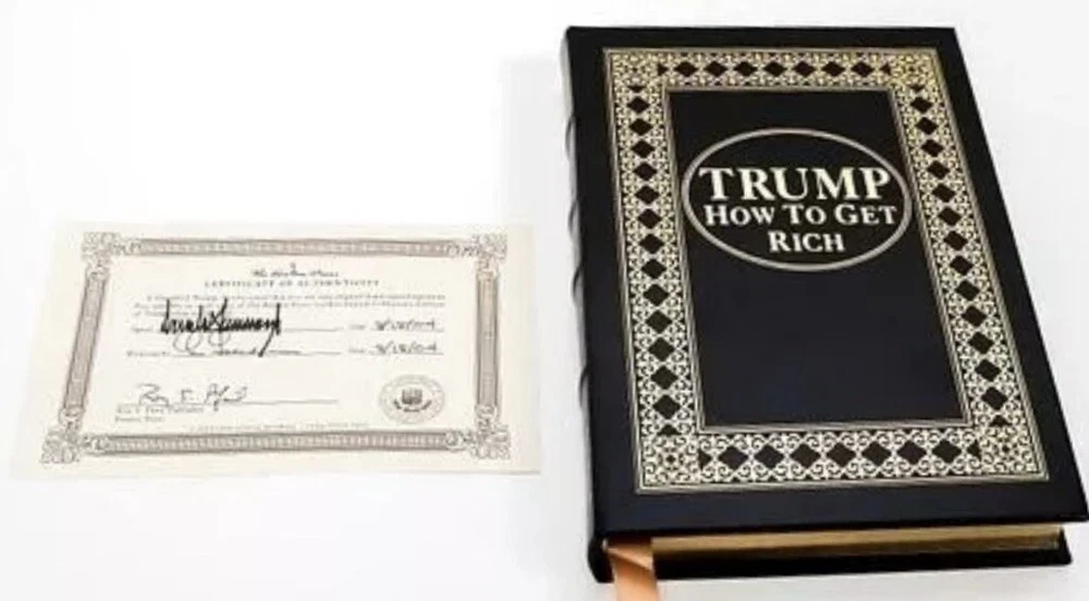 The Easton Press "How To Get Rich" book and COA are both signed by the 45th President of the United States, Donald John Trump. The book is focused on Donald Trump's fame and public image, and makes statements such as "Emphatically and categorically. While the book forms part of Trump's success creed, it more describes how Trump got richer than being a "How To Get Rich" guide. The book contains 53 short business "commandments" and finishes with a section dedicated to Trump's role in The Apprentice.