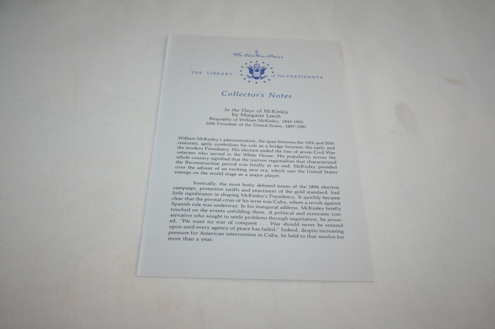 From the Easton Press Library of the Presidents Collector's Edition Series... In The Days of McKinley by Margaret Leech Copyright 1986 by The Easton Press Bound in Premium Full Leather! This volume contains all of the classic Easton Press trimmings: Premium Leather Decorated Endleaves Distinctive Cover Design Hubbed Spine, Accented in Real 22KT Gold Satin Ribbon Page Marker Gilded Page Edges Long-lasting, High Quality Acid-neutral Paper Smyth-sewn Pages for Strength and Durability A very scarce title in any condition, this copy is in Absolute Fine and Unread condition. The front and back covers are both in Perfect condition and the gilded page edges show no wear at all! The binding is tight and square without spine lean. This book is part of the Library of Presidents published by Easton Press and comes complete with a Collector's Notes and attached bookplate from the former owner. It would be a beautiful addition to your Easton Press collection. Overall, this copy is a grade collector's book. This book is very elusive in this superior condition, as only a limited number of them were ever published, so now is the time to act. Hopefully you can add this book to your collection and enjoy it in the years to come... Please Email Me With Any Questions You Might Have! Shipping Info: Buyer to Pay Shipping and Handling International Bidders Pay Extra Shipping Forms of Payment Accepted: Paypal Good luck and happy bidding! Powered by eBay Turbo Lister The free listing tool. List your items fast and easy and manage your active items.