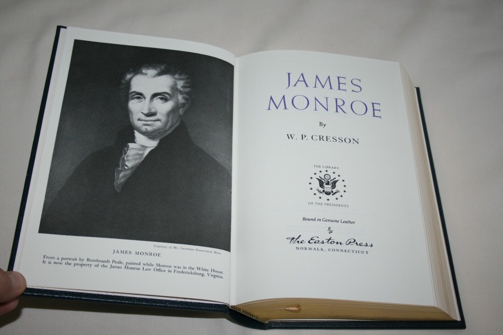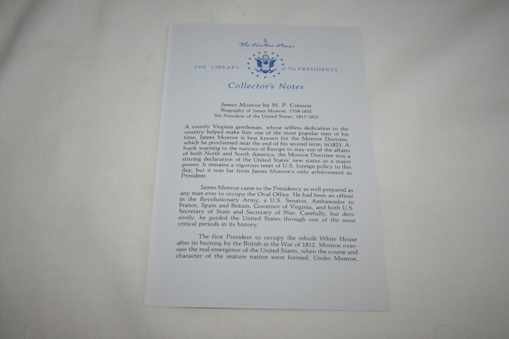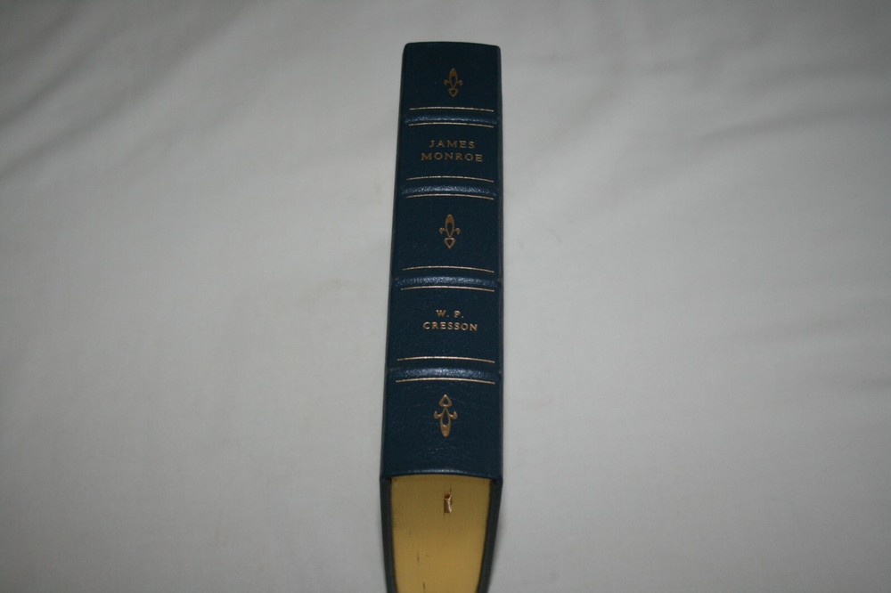 From the Easton Press Library of the Presidents Collector's Edition Series... James Monroe by W. P. Cresson Copyright 1986 by The Easton Press Bound in Premium Full Leather Collector's Edition This volume contains all of the classic Easton Press trimmings: Premium Leather Decorated Endleaves Distinctive Cover Design Hubbed Spine, Accented in Real 22KT Gold Satin Ribbon Page Marker Gilded Page Edges Long-lasting, High Quality Acid-neutral Paper Smyth-sewn Pages for Strength and Durability A very scarce title in any condition, this copy is in Fine and Unread condition. The front and back covers are both in Perfect condition and the gilded page edges show hardly any wear at all! The binding is tight and square without spine lean. There are no marking, bookplates, or other signs or prior ownership. This book is part of the Library of Presidents published by Easton Press and comes complete with a Collector's Notes. It would be a beautiful addition to your Easton Press collection. Overall, this copy is a grade collector's book. This book is very elusive in this superior condition, as only a limited number of them were ever published, so now is the time to act. Hopefully you can add this book to your collection and enjoy it in the years to come... Please Email Me With Any Questions You Might Have! Shipping Info: Buyer to Pay Shipping and Handling International Bidders Pay Extra Shipping Forms of Payment Accepted: Paypal Good luck and happy bidding! Powered by eBay Turbo Lister The free listing tool. List your items fast and easy and manage your active items.