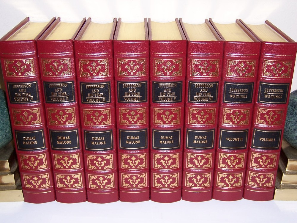 Pulitzer Prize-winning biography Easton Press 1993 JEFFERSON AND HIS TIME in 6 volumes Plus: Thomas Jefferson's Writings in 2 volumes by Dumas Malone with maps and illustrations Uniform wine red leather hardcover binding BOUND IN GENUINE LEATHER Copyright by Easton Press Hubbed Spine, Bound in Premium Full Leather Distinctive Cover Design, Profusely Illustrated Moire Endleaves, Satin Ribbon Page Marker Accented in Real 22KT Gold, Gilt Page Edges Smyth-sewn Pages for Strength and Durability Long-lasting, High Quality Acid-neutral Paper LIST OF TITLES: complete in eight volumes: Vol I : Jefferson the Virginian Vol II : Jefferson and the Rights of Man Vol III: Jefferson and the Ordeal of Liberty Vol IV: Jefferson the President -First Term, 1801-1805 Vol V: Jefferson the President -Second Term, 1805-1809 Vol VI: The Sage of Monticello Vol I : Autobigraphy A Summary View of the Rights of British America Notes on the State of Virginia Public Papers Address, Messages, and Replies Miscellany Vol II: Letters CONDITION DESCRIPTION: this set is in like new and unread condition: clean inside page, and binding is tight, beautiful bright endpapers and satin ribbon page marker. SHIPPING / HANDLING: The book will be shipped via USPS media mail with delivery confirmation, special care will be taken during packing to ensure you receive the books as described.