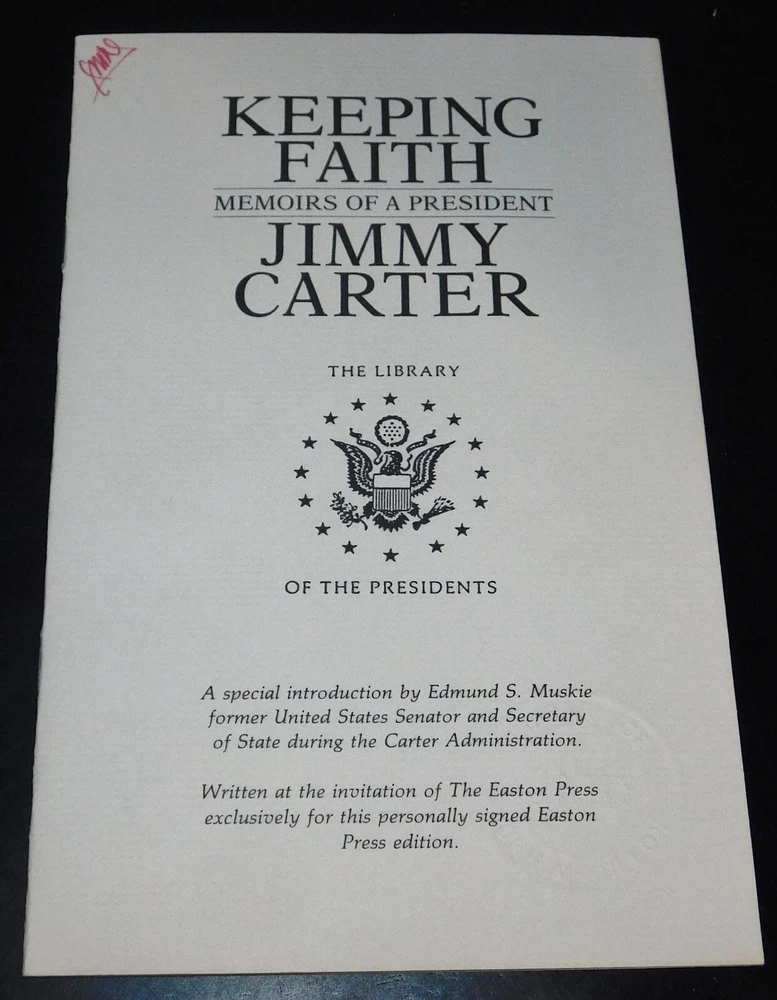 KEEPING THE FAITH Memoirs of a President by Jimmy Carter Easton Press Signed by Jimmy Carter Published by Easton Press, this is a beautiful, leather bound hardcover edition from Easton Press' "The Library of the Presidents" collection. The spine is ribbed and the page edges have a gold gilt. The spine, boards, and page edges are decorated with 22k gold gilt. There is a a satin page ribbon/marker and decorated end-papers. The pages are clean. There are a few light marks on the gilded page edges. Also included with this listing is the introductory pamphlet (written by Edmund S. Muskie) and an unused bookplate specific to the "The Library of the Presidents" collection. The pamphlet has a previous owner's initials written in red ink on the top left corner of the front page. From a smoke-free home. See pictures I will package the book well, using bubble wrap in a box to ensure they arrive the same way they look now.