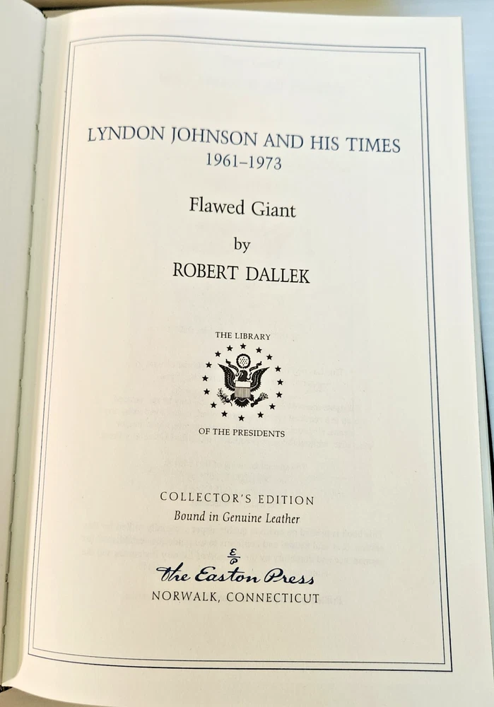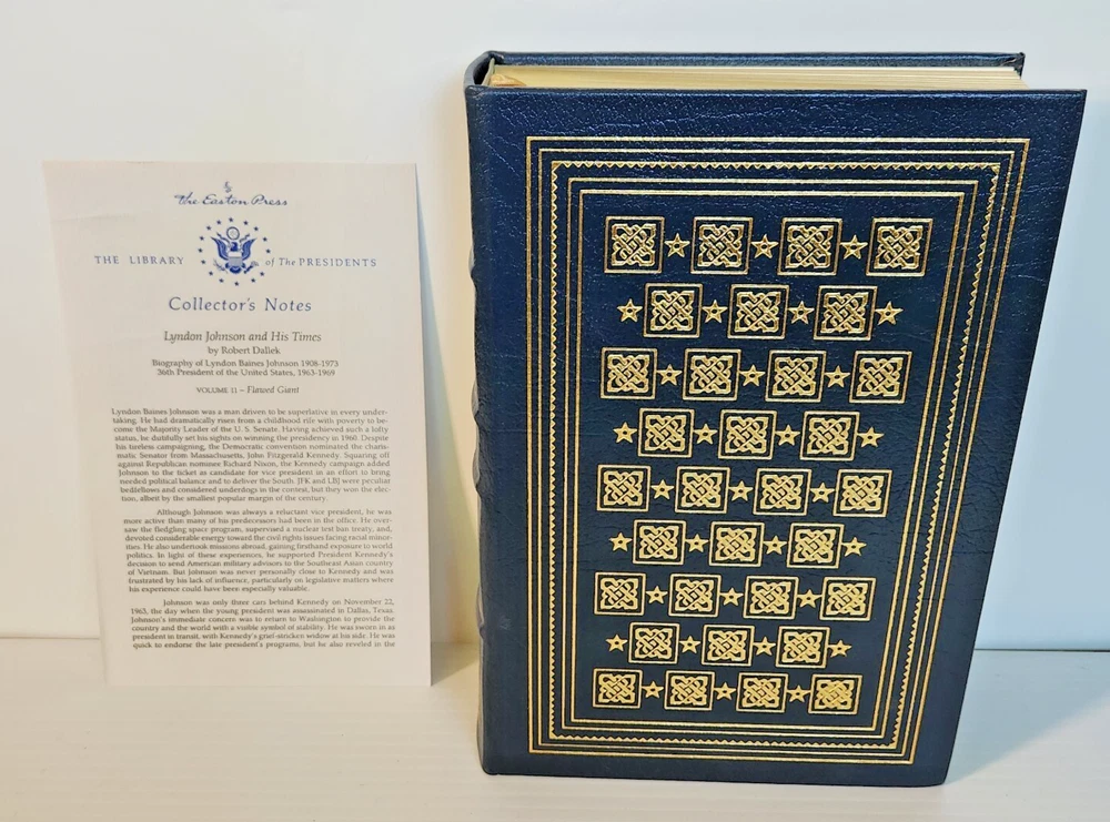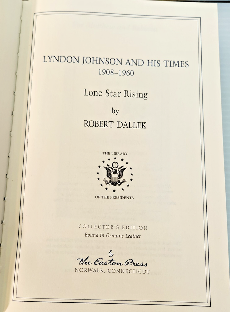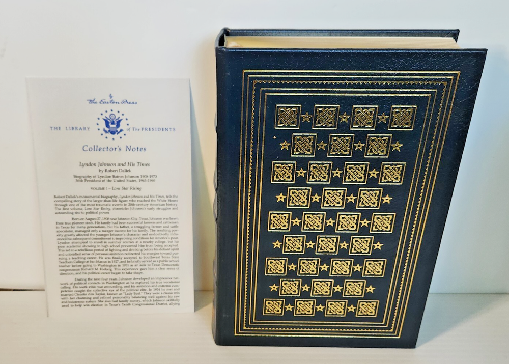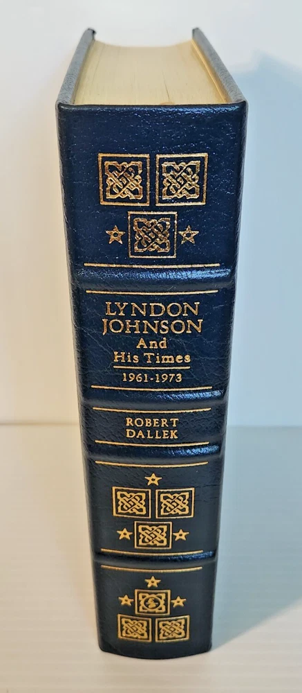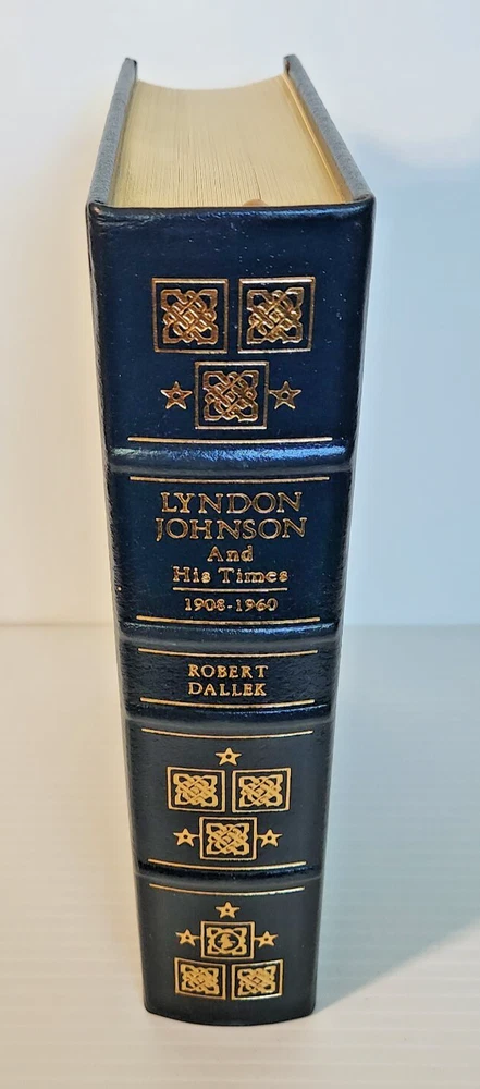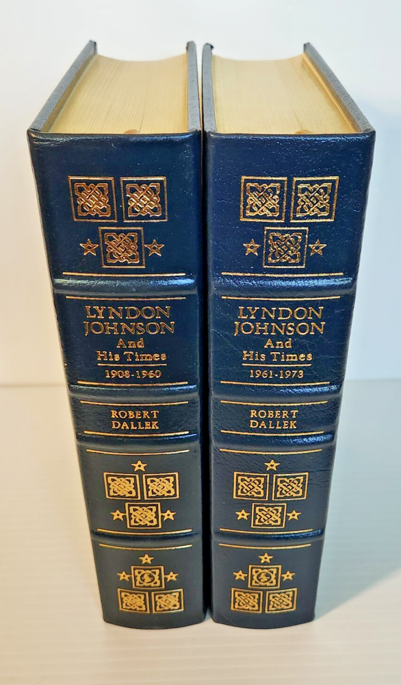 Easton Press Lyndon Johnson and His Times: 1908- 1960 and 1961-1973 (Two Volume Set) by Robert Dallek 2001 Leather-bound Presidents Collector's Edition Series 22kt gold accents deeply inlaid on the "hubbed" spine. Heavy duty binding boards enhance the book’s durability. Superbly printed on acid-neutral paper that lasts for generations. Sewn pages — not just glued like ordinary books. Handsome moiré end pages and a satin-ribbon page marker. Gilded page ends. Printed and bound in the USA using imported materials. Superb craftsmanship and commitment to quality. Condition – Excellent "Like New"; ex Libris attached bookplate; may have some dust from storage. Smoke free history.