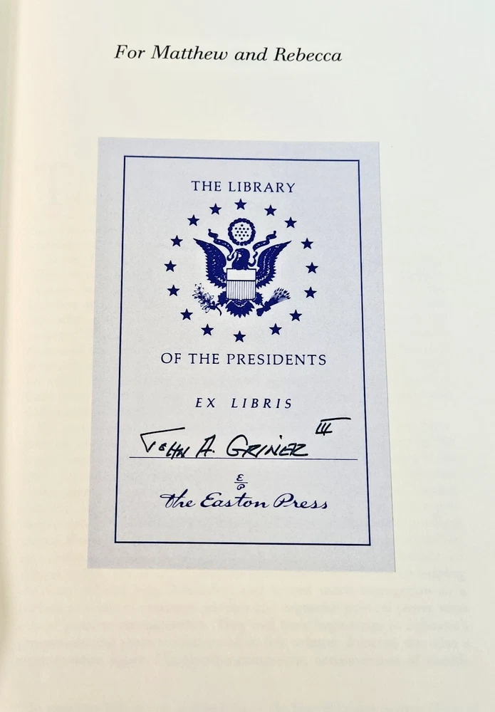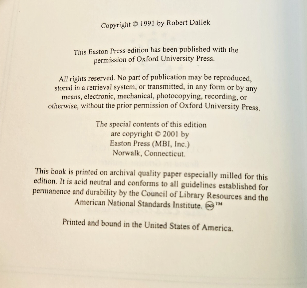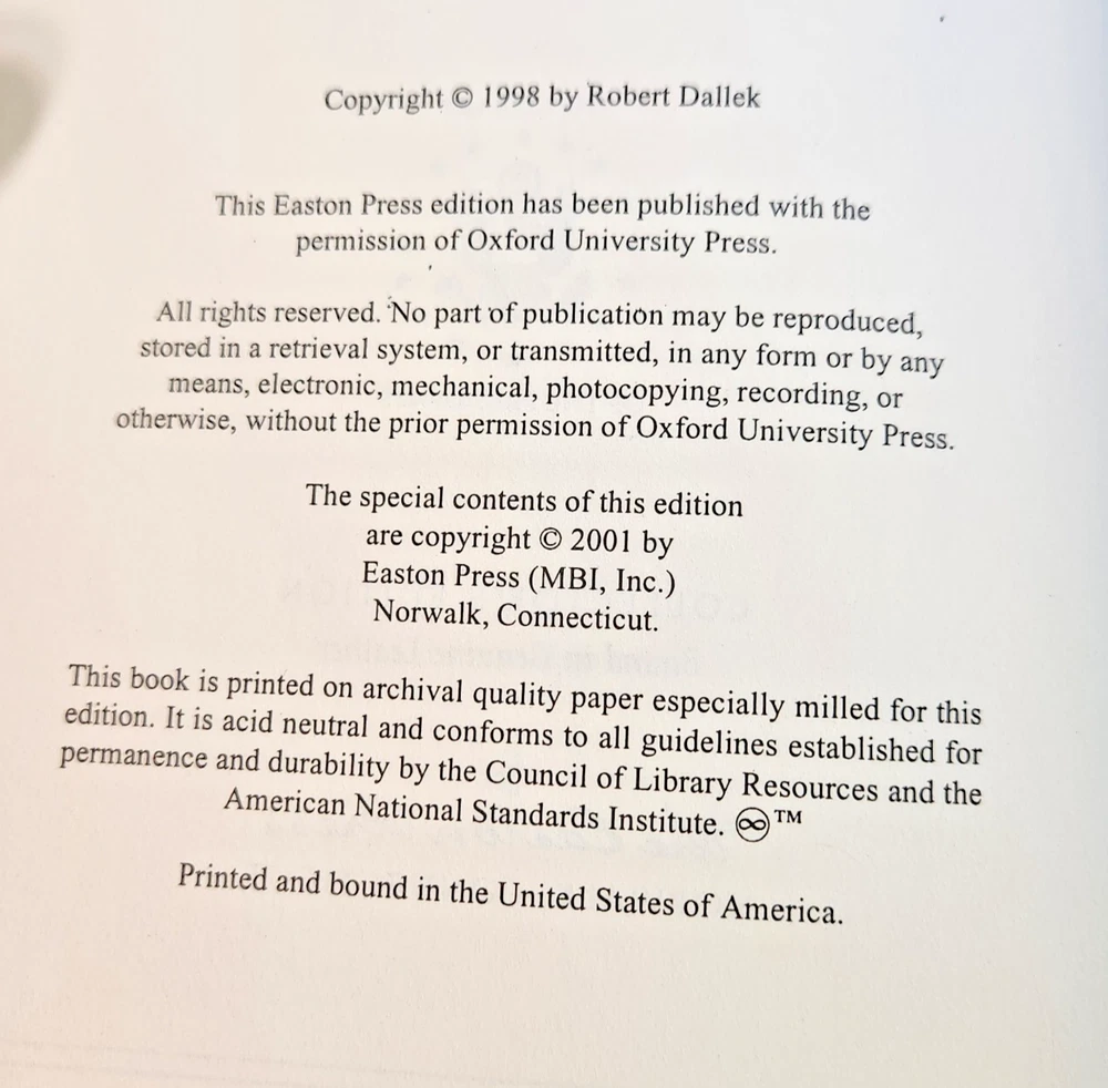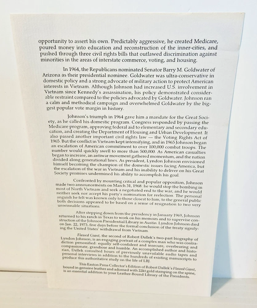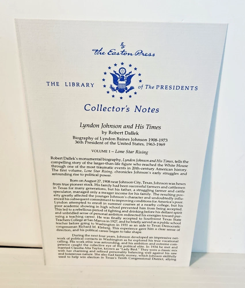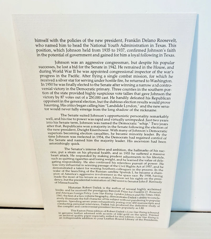 Easton Press Lyndon Johnson and His Times: 1908- 1960 and 1961-1973 (Two Volume Set) by Robert Dallek 2001 Leather-bound Presidents Collector's Edition Series 22kt gold accents deeply inlaid on the "hubbed" spine. Heavy duty binding boards enhance the book’s durability. Superbly printed on acid-neutral paper that lasts for generations. Sewn pages — not just glued like ordinary books. Handsome moiré end pages and a satin-ribbon page marker. Gilded page ends. Printed and bound in the USA using imported materials. Superb craftsmanship and commitment to quality. Condition – Excellent "Like New"; ex Libris attached bookplate; may have some dust from storage. Smoke free history.