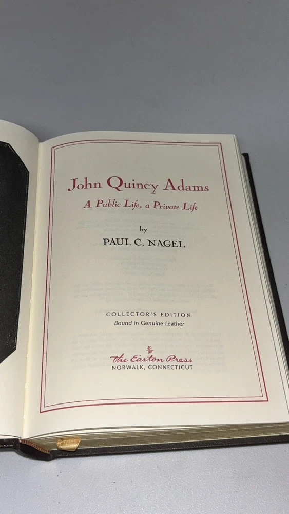 This Easton Press leather-bound book titled "John Quincy Adams" by Paul C. Nagel is a must-have for any collector of presidential history. The book is an original and comes from the Library of the Presidents. It is a two-volume set and is published in English. The book has no signs of wear and tear, making it a great addition to any bookshelf. It has not been personalized and is not signed. The binding is made of high-quality leather and the pages are clean. This book is a great find for anyone interested in the life and career of John Quincy Adams. Feel free to contact me if you have any questions. And follow me on Ebay as I post new and exciting items everyday. FREE 60 day returns!