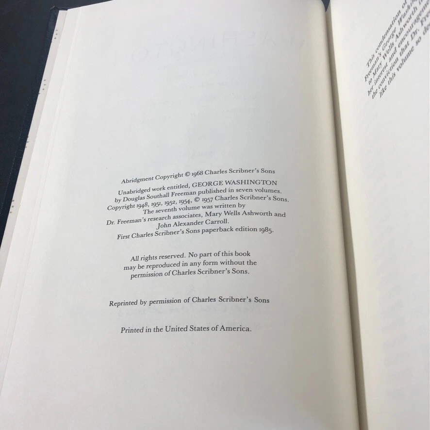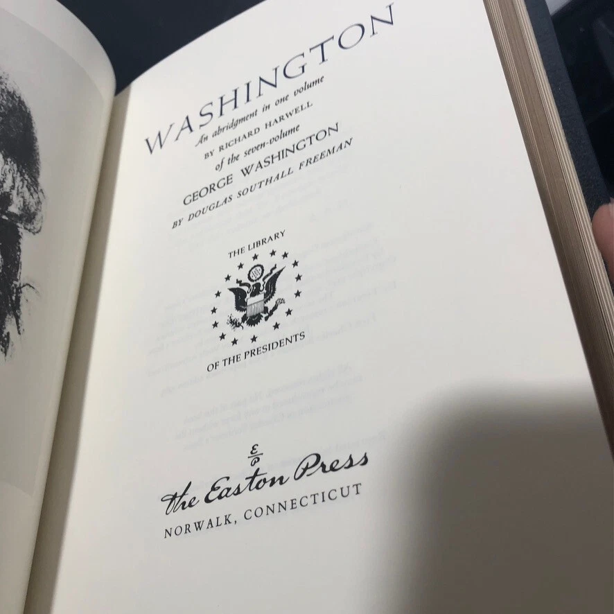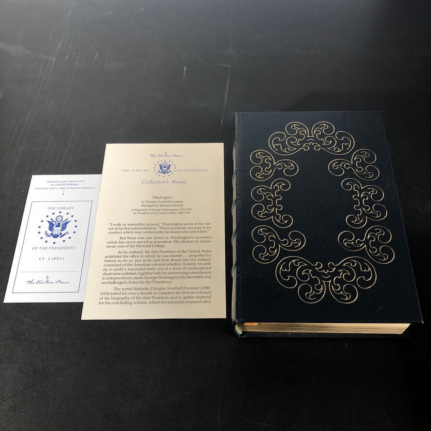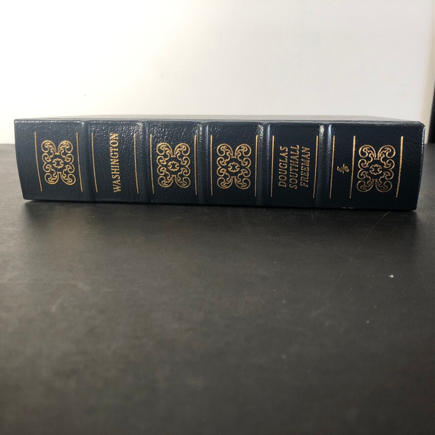 The product is a leather-bound book titled "Washington 1985" by Douglass Southall Freeman, published by Easton Press in Connecticut in 1985. It falls under the subject of Biography & Autobiography, specifically focusing on Presidential History. The book is part of "The Library of the Presidents" series and is a non-modified edition. It is written in English and was published in the United States. This collectible book does not have a signature or any personalized attributes.