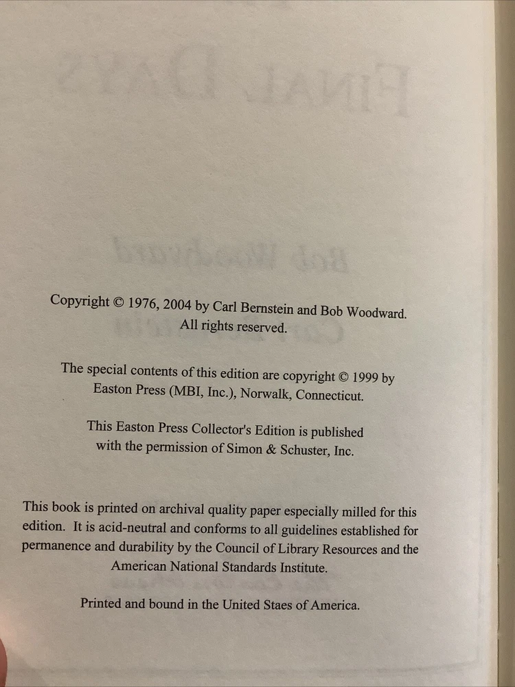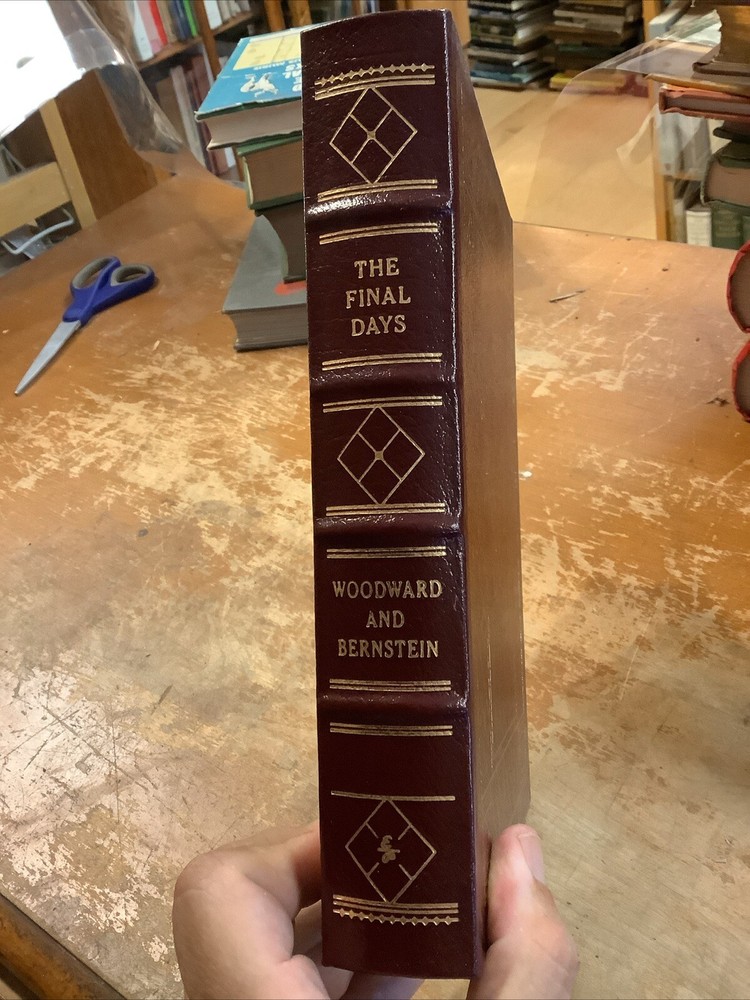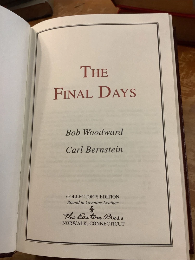 The Final Days by Bob Woodward and Carl Bernstein. Published by The Easton Press, 2004. No markings. Full leather binding with gilt lettering and decorations. Light scratching to gilt page edges.