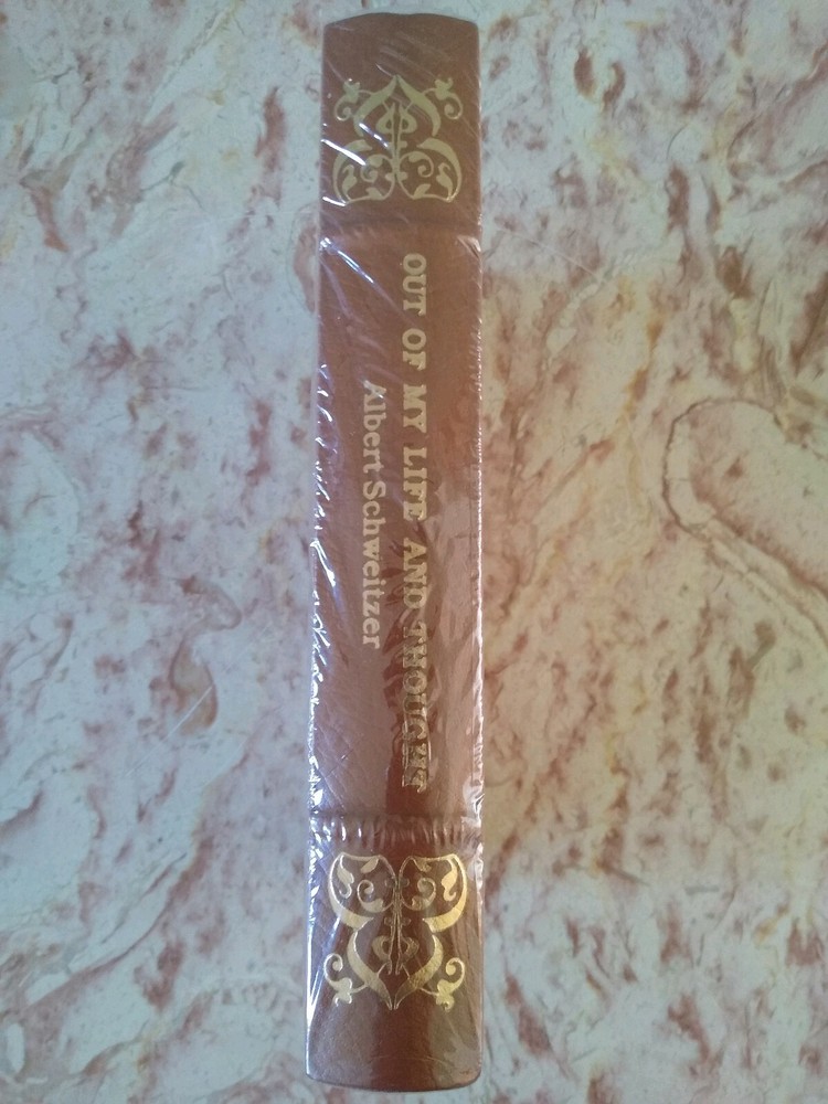 Easton Press Leather New Sealed Out of My Life & Thought Albert Schweitzer 1989 . Selling for a dear friend who had a stroke and lost her vision. She is giving up her books to cover caregiver costs. She has leafed through her library on occasion, but the books have not been read. Some have minor factory imperfections. Please examine all photos and feel free to ask questions. Book is new and has never been opened from it's original packaging. Shipped with USPS Media Mail.