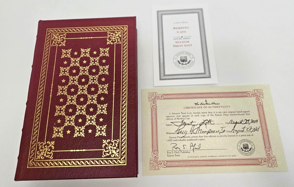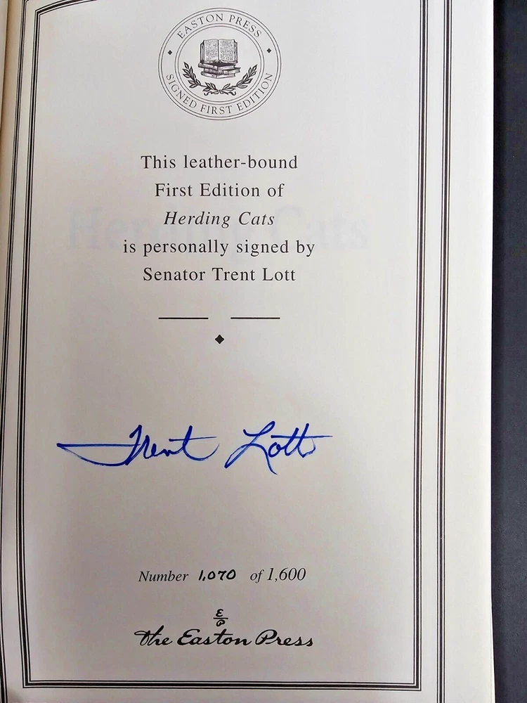 EASTON PRESS HERDING CATS By SENATOR TRENT LOTT WITH CERTIFICATE OF AUTHENTICITY 1070 of 1600 Easton Press ~ Leatherbound SIGNED ~ FIRST EDITION This book is leather bound with gold lettering and gold page edges . It is like new. Please use enlargement feature in order to see closely. We offer combined shipping in order to save $$$. We are listing many signed editions over the next few days. Please be sure to ask any questions BEFORE purchasing! Thank you! We appreciate our buyers and want to do our best to make this a positive eBay experience for you. If there is an issue upon receipt of your purchase please send a message through eBay before opening a return. It is important to us to make it right. Our goal is to satisfy you! See my other listings for more great items! We ask for payment within 3 days. Shipping quoted is for lower 48 states only. We ship through FedEx, UPS and USPS, depending on which is least expensive. We ship ONLY through ebay's global shipping program for international shipments and we do not ship to APO boxes. Also, we do not guarantee the estimated shipping arrival provided by ebay because once the item is placed with the carrier, it is out of our control. txzj pxzj7585 txzj-11 txzj111 txzj115