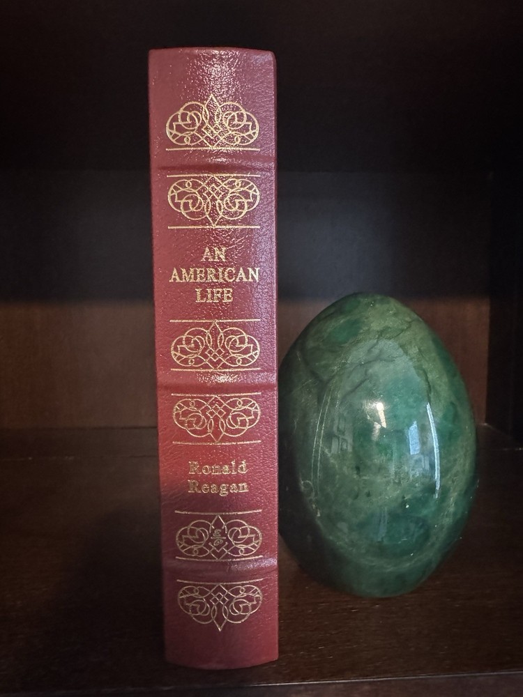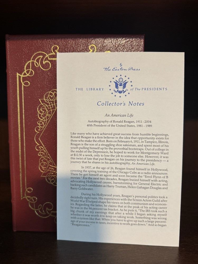 Ronald Reagan: An American Life by Easton Press is a collectible leather-bound edition from the Library of the Presidents. Featuring premium craftsmanship, gilt-edged pages, and intricate embossing, it chronicles Reagan's journey from Hollywood to the White House. Perfect for collectors seeking an elegant rendition of Reagan's autobiography. Includes certificate of authenticity. A timeless masterpiece and must have for collectors and historians!