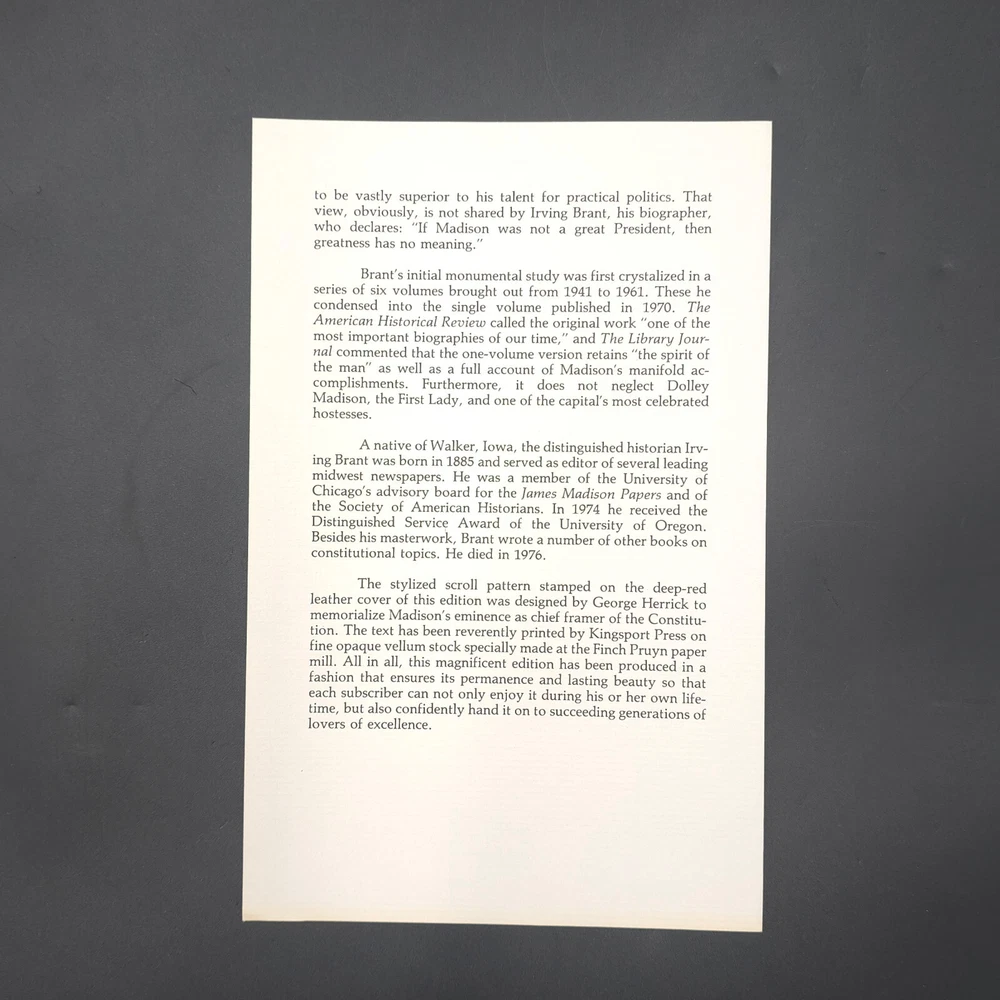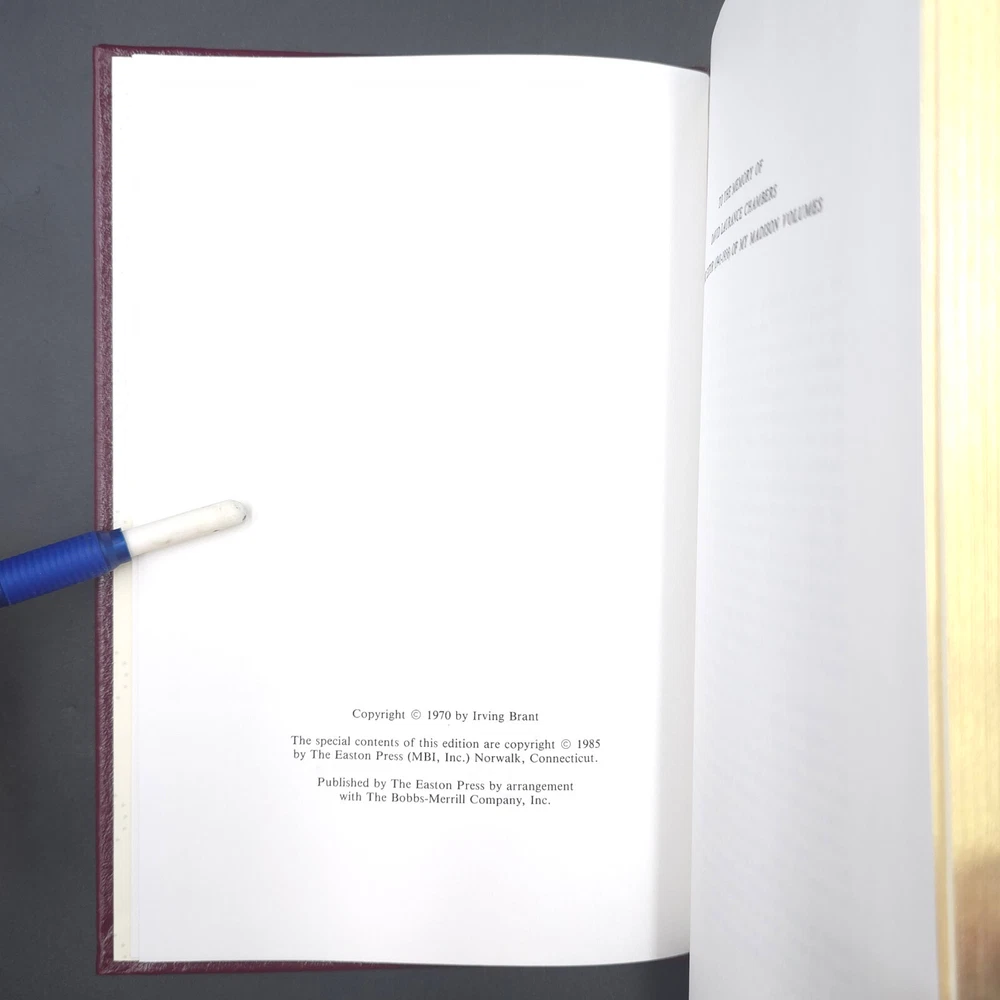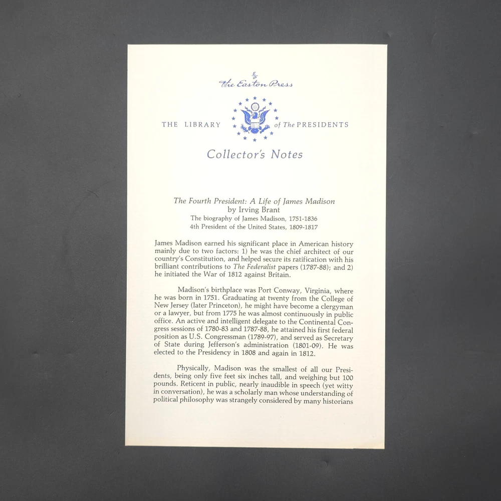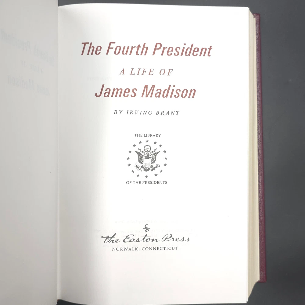 Easton Press Library of the Presidents The Fourth President Irving Brant 1985 Leatherbound, Copyright 1985 Great condition. The book has some minor shelf wear and spots of gilt loss on the page ends as shown. Please refer to photos for complete condition.