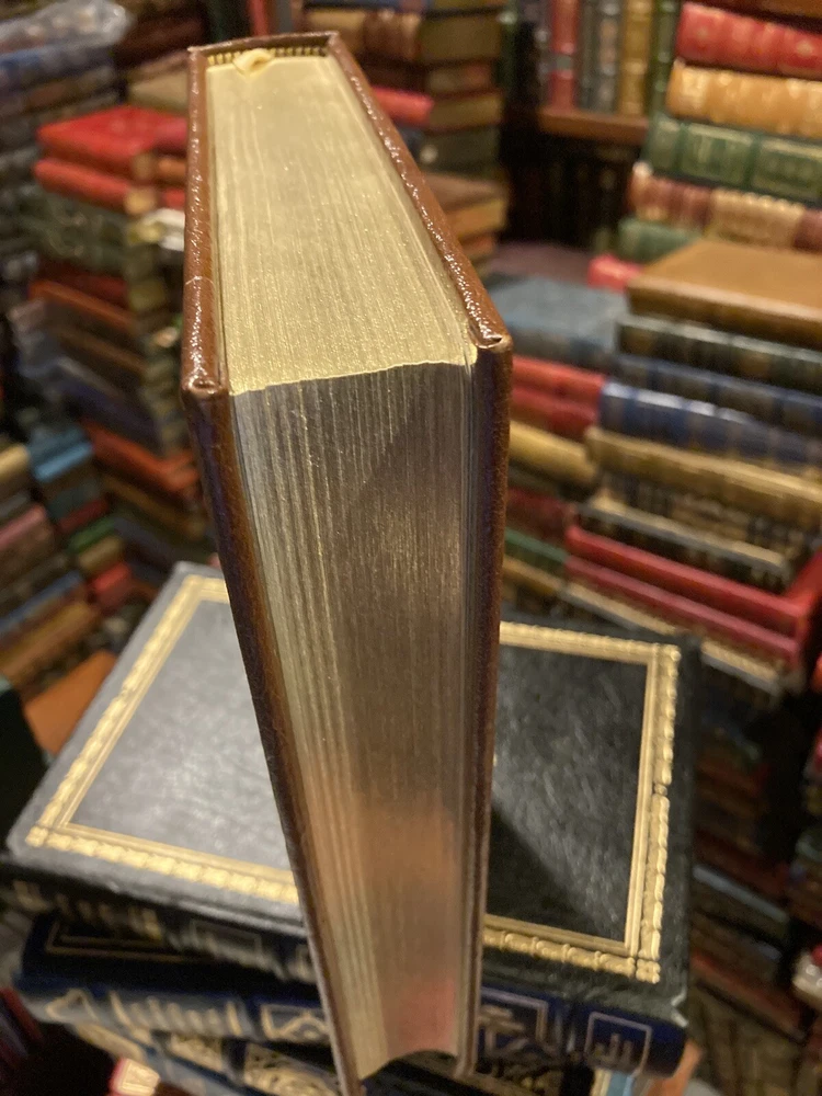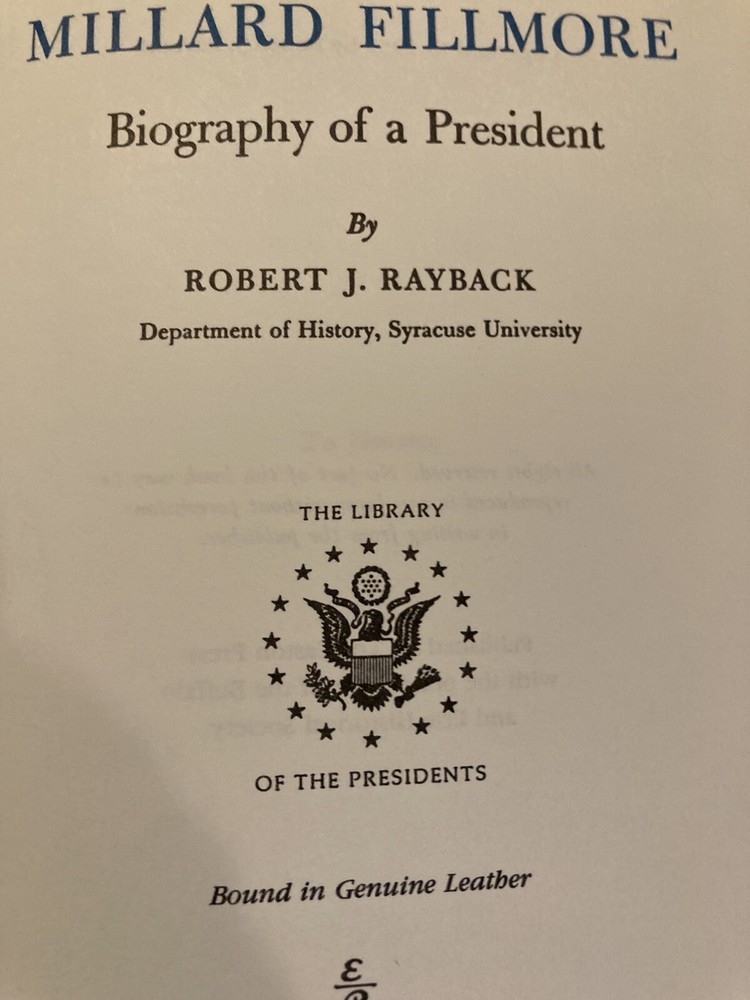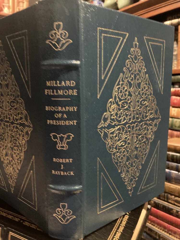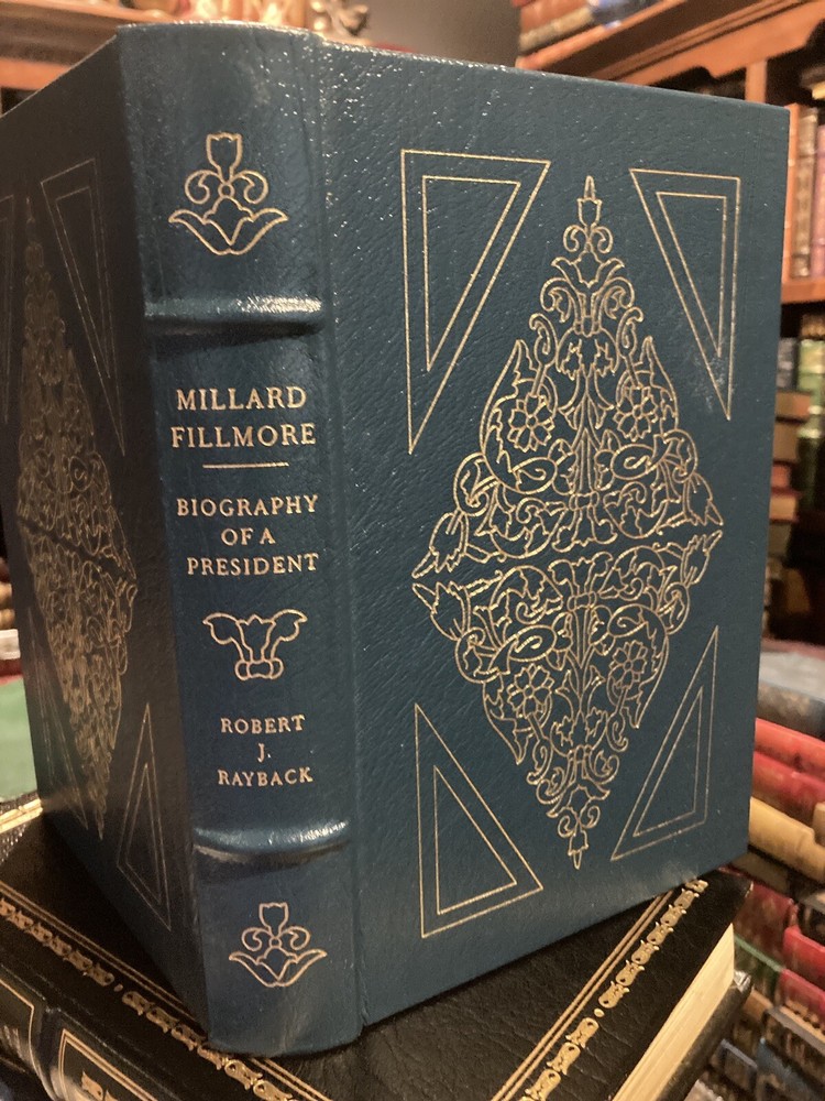 Easton Press leather edition of Robert J. Rayback's "Millard Fillmore: Biography of a President," a COLLECTOR'S edition, one of the LIBRARY OF THE PRESIDENTS series, published in 1959. Bound in hunter green leather, the book has decorative paper end leaves, acid-free paper, Symth-sewn binding, a satin book marker, gold gilding on top edge only---in FINE condition. COLLECTOR'S NOTES included. Millard Fillmore, who lived from 1800-1874, was the 13th President of the U.S., 1850-1853. He was born in Western New York. His father apprenticed his fourteen-year-old son to a cloth-dresser where he grew to manhood. In 1819, he courted Abigail Powers, daughter of a local judge. Eventually, Fillmore studied law but in 1822, he took a teaching position and then moved to Buffalo. In 1858 after the death of Abigail, Fillmore married Caroline McIntosh, a wealthy widow and by marriage contract she turned over to him a handsome estate. In later years, she became an invalid. As Vice President under Zachary Taylor, Fillmore presided with scrupulous fairness over the stormy debates centering on slavery compromise measures. When Taylor died, Fillmore chose to compromise to preserve the Union---despite his personal abhorrence of slavery. He chose DANIEL WEBSTER as Secretary of State in an effort to steer the Ship of State on a course of moderation. Fillmore worked with HENRY CLAY, JOHN QUINCY ADAMS, THURLOW WEED and JOHN C. CALHOUN. Although he was a "strikingly handsome man," Fillmore has often been labeled as "bland" and "colorless." As President, Fillmore sent Matthew Perry to open Japan to trade. Julius Pratt of the University of Buffalo said that "without Fillmore there could have been no Lincoln." Fillmore made a political mistake when he agreed to run on the KNOW NOTHING ticket in 1856. When Fillmore retired he returned to Buffalo and led an active life, working with the medical college, the Historical Society, and serving as the University of Buffalo chancellor. 470 pages, including an Index. I offer combined shipping.
