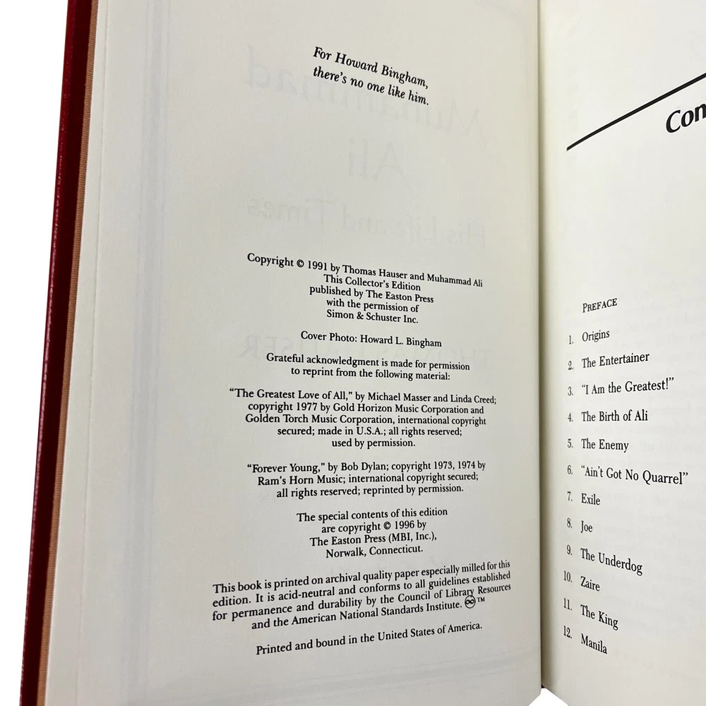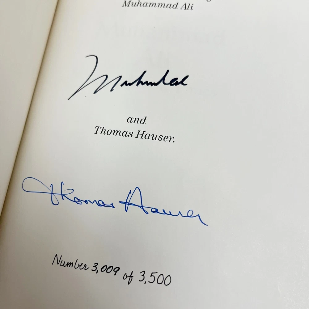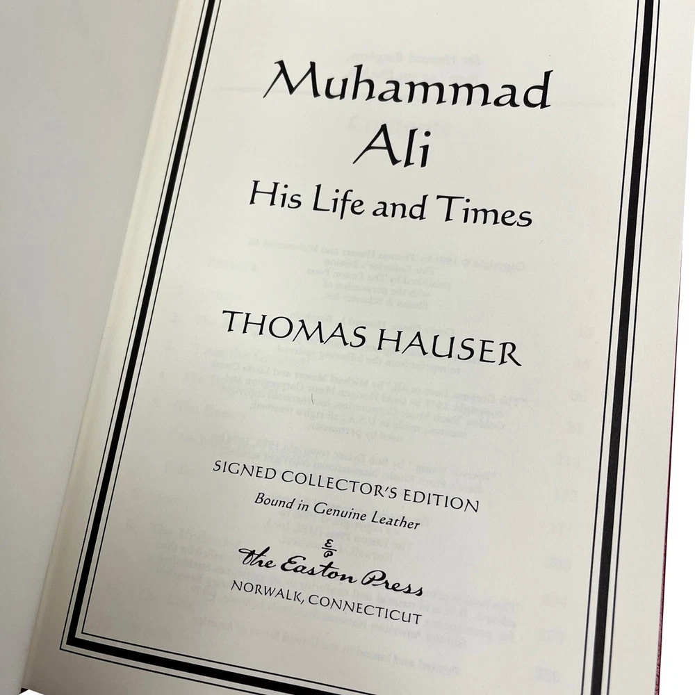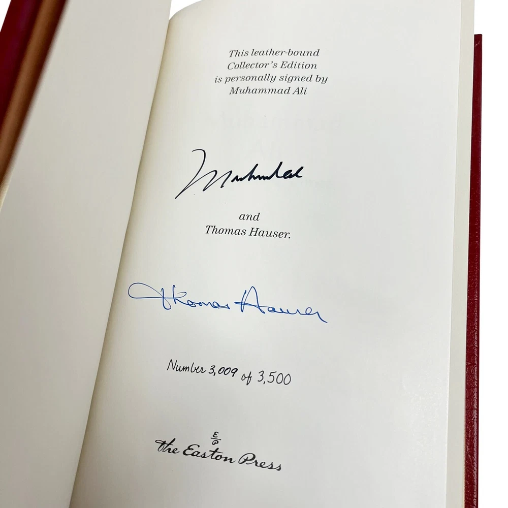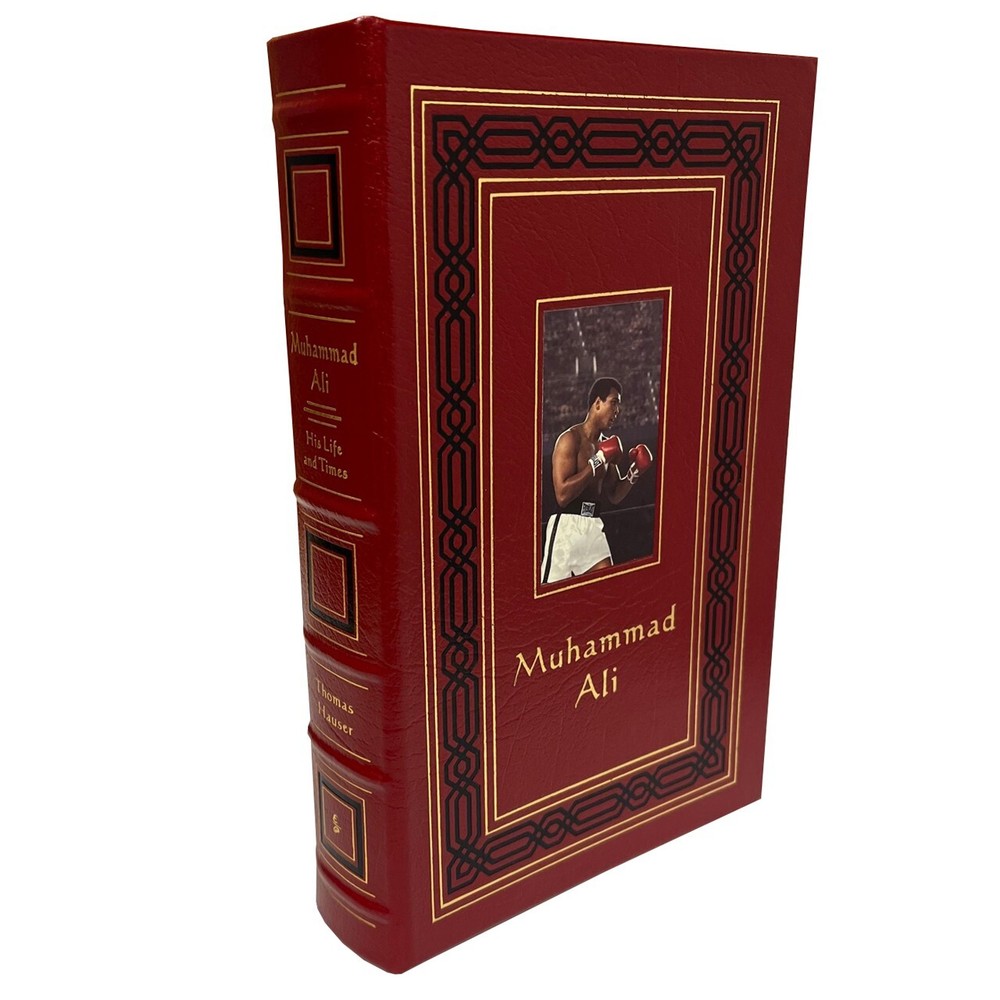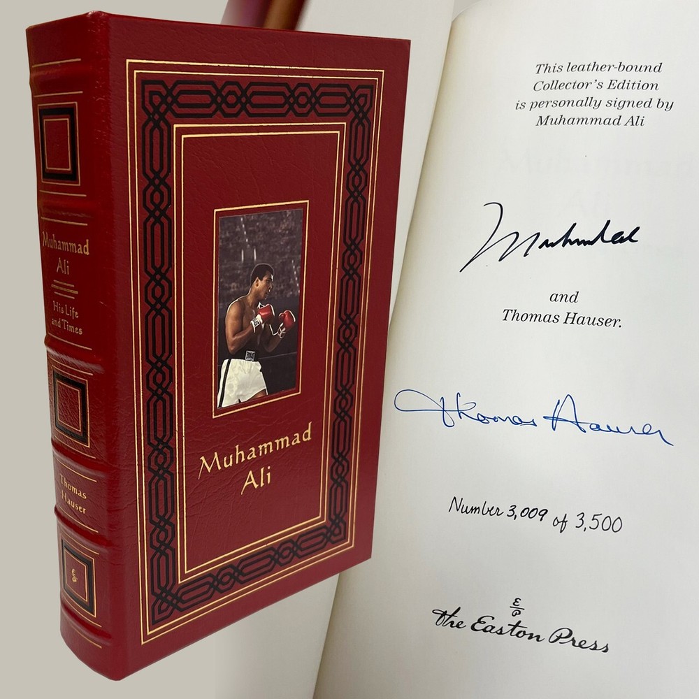FREE EXPRESS SHIPPING WORLD -WIDE Easton Press Leather Bound © 1996 "Muhammad Ali: His Life and Times" Signed Limited Edition #3,009 of only 3,500 (Very Fine) In the words of the great Muhammad Ali: "Success is not achieved by winning all the time. Real success comes when we rise after we fall. Some mountains are higher than others. Some roads steeper than the next. There are hardships and setbacks but you cannot let them stop you. Even on the steepest road you must not turn back". The perfect gift for the collector of rare autographed sports books. A luxurious leather bound collector's edition, published by Easton Press and personally signed by "The Greatest", Muhammad Ali. A gorgeous dark red leather Numbered Limited Edition, also signed by the author, Thomas Hauser. Limited to 3500 signed & numbered copies. Illustrated with numerous historic black & white photographs. Original publication date 1996. Condition VERY FINE- with a couple of very minor marks to the gilded page edges. Otherwise a new copy without any flaws. No bumped corners and free of any writing, marks, scratches or blemishes. A wonderful bright clean copy. The graphics are clear and not faded. About Ali was the first man to win the heavyweight title three times and he revolutionized the sport of heavyweight boxing. In 1990, Muhammad Ali was introduced into the International Boxing Hall of Fame. Widely regarded as one, if not THE, best heavyweight fighters who ever lived, Ali's biography is an important book signed by an important world figure. As Cassius Clay, Ali won the light heavyweight gold medal at the 1960 Olympics and began the road to a highly successful heavyweight career. In 1964, Ali surprised the world by beating Sonny Liston and after the fight he changed his name to Ali after adopting Islam. Ali's title was stripped from him in 1967 when Ali refused the draft but he regained it, eventually, in 1974 by beating George Foreman. Ali successfully defended his title several times until the early 80's when his career was over Editorial Reviews A detailed, if hagiographic, account of Ali's public career and private life. Hauser (author of one of the best books ever on the fight game, 1985's Black Lights) is an obvious and uncritical fan of Ali's, whom he apotheosizes early on as "the most recognizable person on earth.'' In aid of what might be called oral biography, Hauser draws on over 200 sources--acquaintances, associates, opponents, friends, enemies, blood relations, and celebrity observers of the sometime title-holder--to create a composite portrait that's longer on sympathetic assertions than reflective insight. The ranks of the commentators include the oddly coupled likes of: Cassius Marcellus Clay, Sr. (Ali's dad); Joe Martin (the Louisville cop who taught Ali to box); Olympic teammates; Atallah Shabazz (the daughter of Malcolm X who helped convert Ali to the Nation of Islam); trainer Angelo Dundee; Jimmy Carter; Leon Spinks; George Plimpton; Sylvester Stallone; referee Arthur Mercantee; Chuck Wepner (a human punching bag widely known as ``The Bayonne Bleeder''); and Carl Walker (the black assistant attorney general who tried to make the federal case against Ali for draft evasion). Overall, Hauser does a good job of marshaling a wealth of facts into a cohesive whole and providing behind-the-scenes glimpses of a ring lion in the autumn, if not winter, of his years. Throughout, however, the author makes almost no attempt to conceal the genuine regard and admiration he feels for his subject. A walkover for Ali but a disappointment for those with even a passing interest in the sweet science's grittier realities.