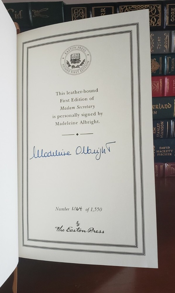 This signed Easton Press edition of *Madam Secretary* is a must-have for collectors and history buffs. Madeleine Albright’s memoir is engaging, insightful, and beautifully presented in this limited release. The personal touch of her signature makes it even more special. A captivating read from a trailblazing leader!