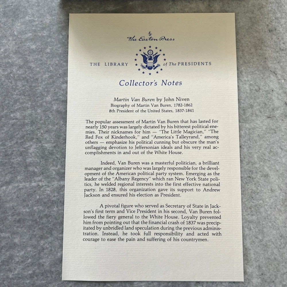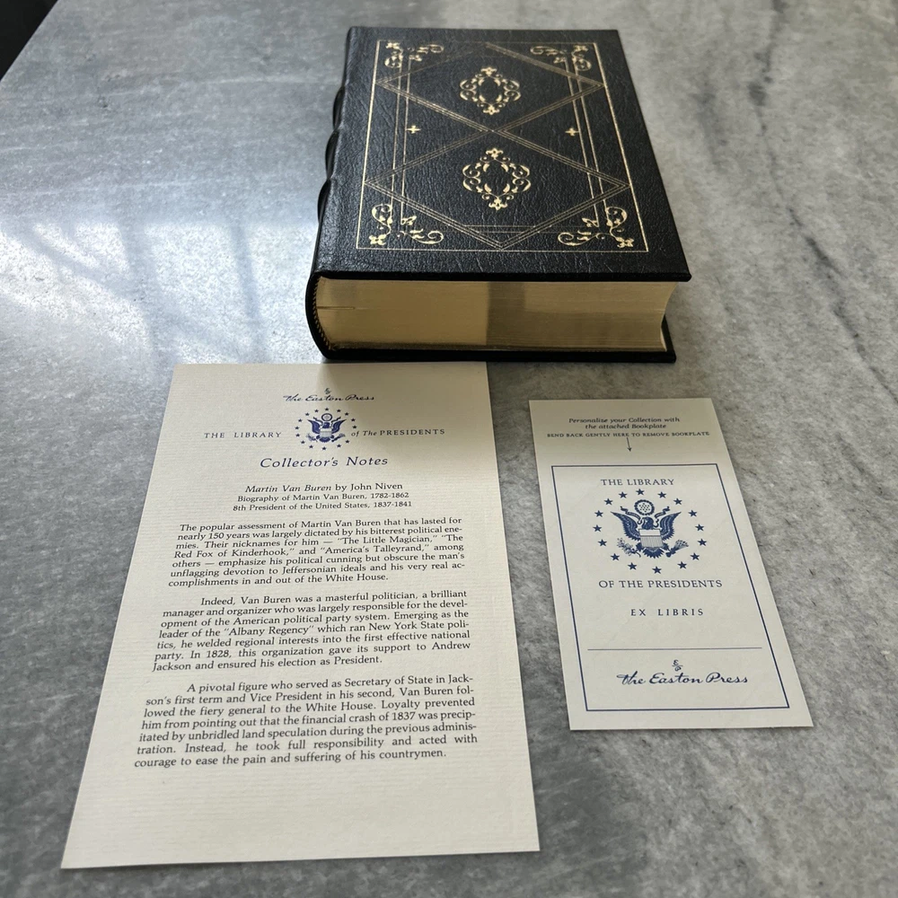 The Easton Press Martin Van Buren by John Niven Leather Library of Presidents 1986 is a highly collectible book with a luxurious leather binding and 22kt gold accents. This biography and autobiography of Martin Van Buren, published by Easton Press, features a ribbon bookmark, Ex Libris sticker, and Collector's Notes. The book, written by John Niven, is a special edition with genuine leather and is a valuable addition to any historical or political book collection.