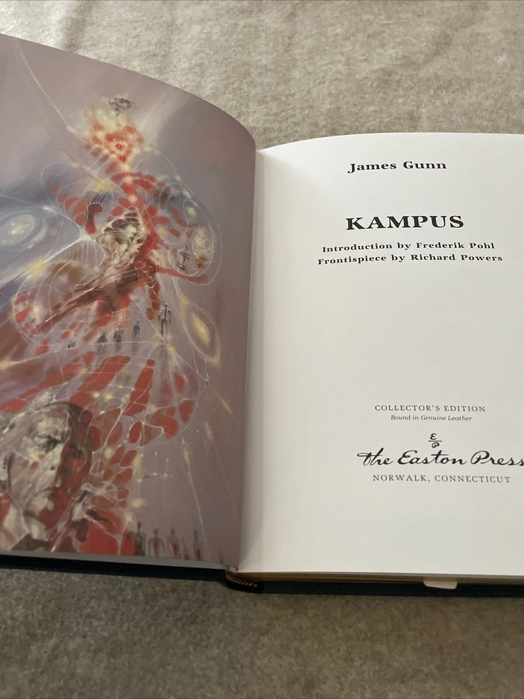 Easton Press Masterpieces of Science Fiction Series Kampus by James Gunn There are no book plates in the book. It comes with the collector's notes This book is in near mint condition with a bumped corner on the front and back cover. The gold on the covers shows no wear. The end pages show no fading. The gilt on the edge of the pages is in almost perfect condition with a scratch on the side. Please see photos. We try to describe as accurately as possible so you will be satisfied with your purchase. We have more books from this set on eBay and we would be happy to combine on shipping to save you money. All books are sent with insurance via USPS Media Mail.