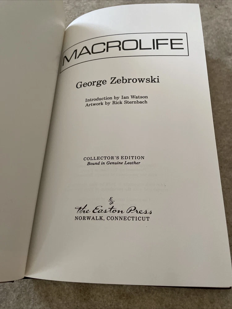 Easton Press Masterpieces of Science Fiction Series Macrolife by George Zebrowski There are no book plates in the book. It comes with the collector's notes. It is signed by the author. This book is in near mint condition with no wear. The gold on the covers shows no wear. The end pages show no fading. The gilt on the edge of the pages is in almost perfect condition with a tiny scratch on the top. Please see photos. We try to describe as accurately as possible so you will be satisfied with your purchase. We have more books from this set on eBay and we would be happy to combine on shipping to save you money. All books are sent with insurance via USPS Media Mail.