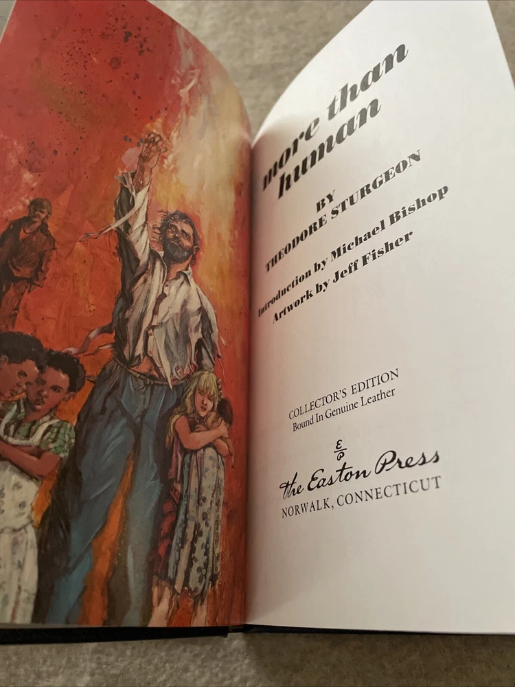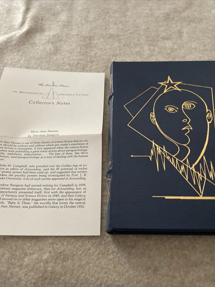 Easton Press Masterpieces of Science Fiction Series More than Human by Theodore Sturgeon There are no book plates in the book. It comes with the collector's notes This book is in near mint condition with a tiny scuff on the back cover. The gold on the covers shows no wear. The end pages show no fading. The gilt on the edge of the pages is in almost perfect condition with a light scratch on the bottom. Please see photos. We try to describe as accurately as possible so you will be satisfied with your purchase. We have more books from this set on eBay and we would be happy to combine on shipping to save you money. All books are sent with insurance via USPS Media Mail.