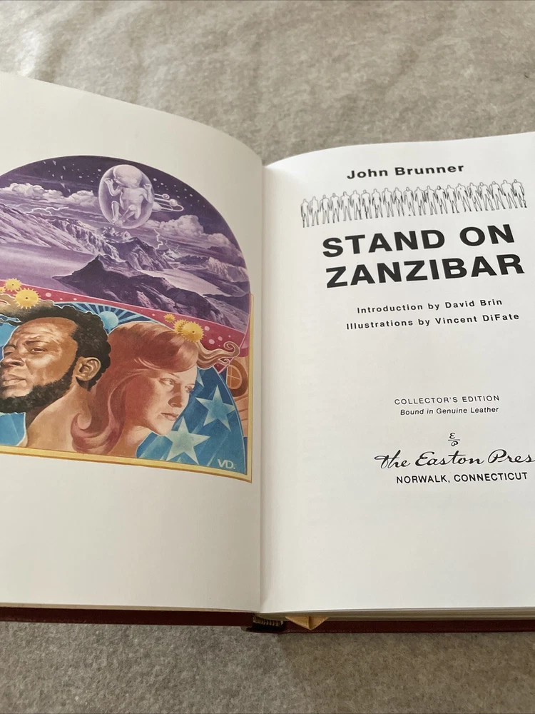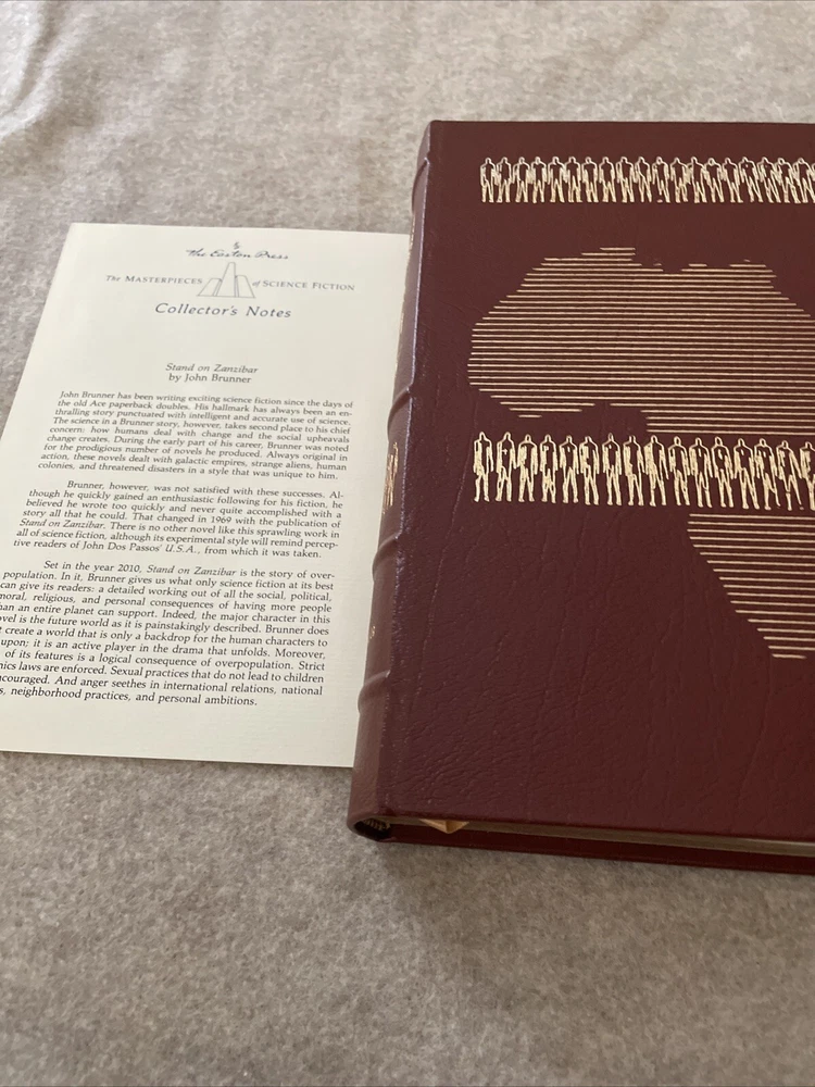 Easton Press Masterpieces of Science Fiction Series Stand on Zanzibar by John Brunner There are no book plates in the book. It comes with the collector's notes This book is in near mint condition with no wear. The gold on the covers shows no wear. The end pages show no fading. The gilt on the edge of the pages is in almost perfect condition with a scratch on each side. Please see photos. We try to describe as accurately as possible so you will be satisfied with your purchase. We have more books from this set on eBay and we would be happy to combine on shipping to save you money. All books are sent with insurance via USPS Media Mail.