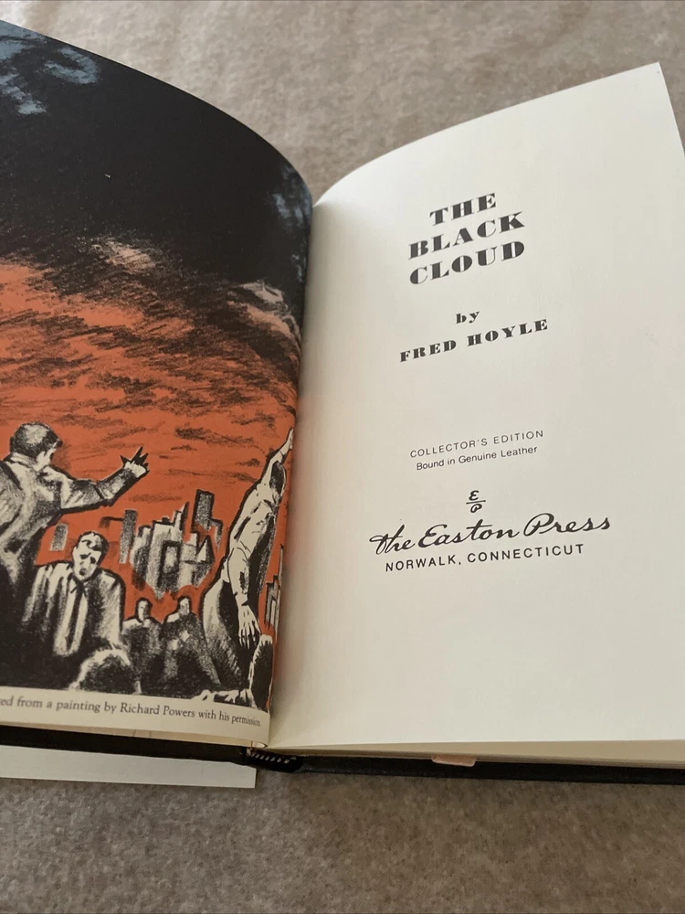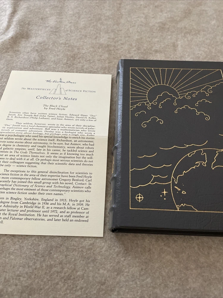 Easton Press Masterpieces of Science Fiction Series The Black Cloud by Fred Hoyle There are no book plates in the book. It comes with the collector's notes This book is in mint condition with no wear. The gold on the covers shows no wear. The end pages show no fading. The gilt on the edge of the pages is in perfect condition. Please see photos. We try to describe as accurately as possible so you will be satisfied with your purchase. We have more books from this set on eBay and we would be happy to combine on shipping to save you money. All books are sent with insurance via USPS Media Mail.