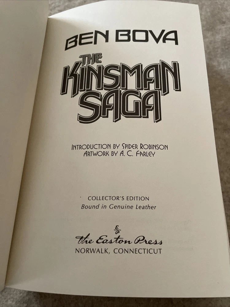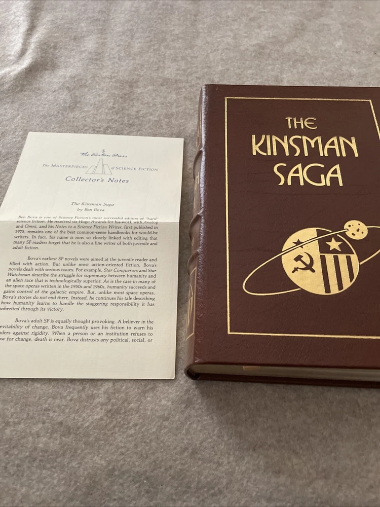 Easton Press Masterpieces of Science Fiction Series The Kinsman Saga by Ben Bova There are no book plates in the book. It comes with the collector's notes This book is in near mint condition with no wear. The gold on the covers shows no wear. The end pages show no fading. The gilt on the edge of the pages is in almost perfect condition with a light scratch on the bottom and side. Please see photos. We try to describe as accurately as possible so you will be satisfied with your purchase. We have more books from this set on eBay and we would be happy to combine on shipping to save you money. All books are sent with insurance via USPS Media Mail.