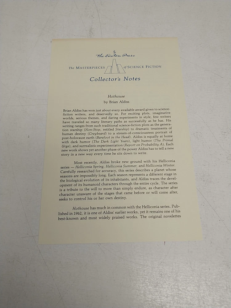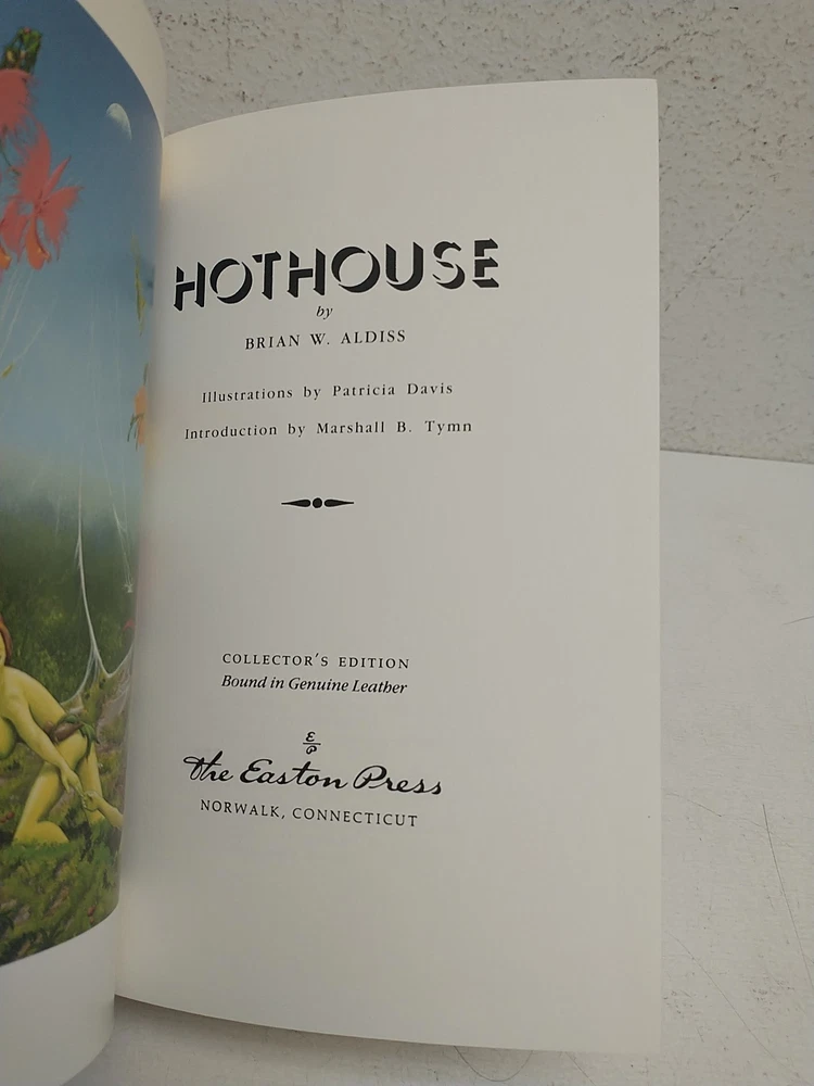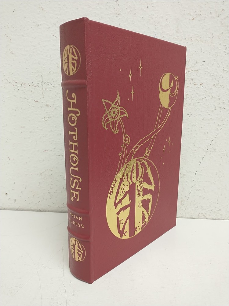 This Easton Press edition of Hothouse by Brian W. Aldiss is part of the acclaimed Masterpieces of Science Fiction series, known for its luxurious presentation and focus on significant works within the genre. Bound in genuine leather with 22kt gold accents, this collector's edition features a hubbed spine, archival-quality paper, gilt page edges, moiré silk endpapers, and a satin ribbon marker. The craftsmanship reflects the publisher’s dedication to preserving great science fiction literature in a format built to last. Originally published in 1962, Hothouse presents a vivid, imaginative vision of Earth's distant future, where the planet has ceased rotating and is overrun by rampant vegetation under a dying sun. Humanity has devolved into a primitive state, struggling to survive in an alien yet eerily beautiful environment dominated by sentient plants and strange creatures. Aldiss’s novel is both an adventure and a meditation on evolution, entropy, and survival, written with lush detail and striking originality. This Easton Press edition celebrates the work’s lasting impact on speculative fiction. Pre-Owned. See photos for condition. Ships via USPS Media Mail. Please message with any questions. We ship Monday-Friday.