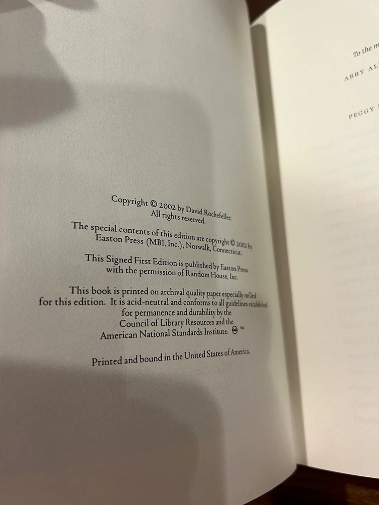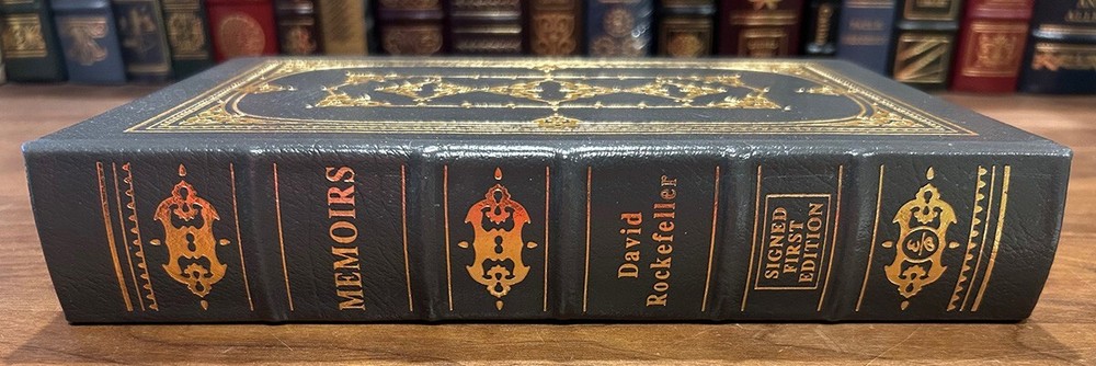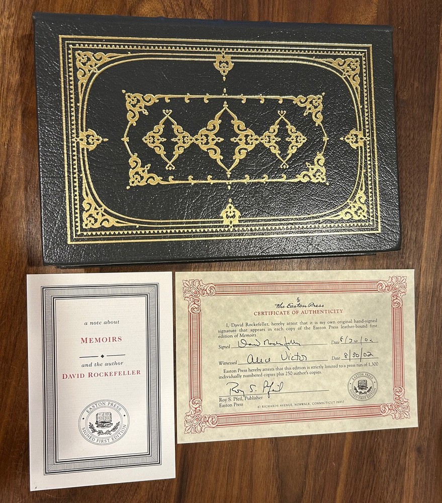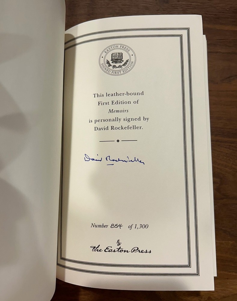 David Rockefeller - Memoirs - Signed and Numbered 1st Edition / Easton Press 1st Printing Hardcover Norwalk, Connecticut Easton Press, Leather Bound Limited Edition Signed by Author - COA and Authors Notes included. Book accented in 22kt gold. Printed on archival paper with gilded edges. The endsheets are of moire fabric with a silk ribbon page marker. Smyth sewing and concealed muslin joints to ensure the highest quality binding. This book is in full leather with hubbed spines. David Rockefeller Memoirs Signed First Edition Bound in Genuine Leather The Easton Press 1990 #854 of #1,300 Author's Notes and COA included