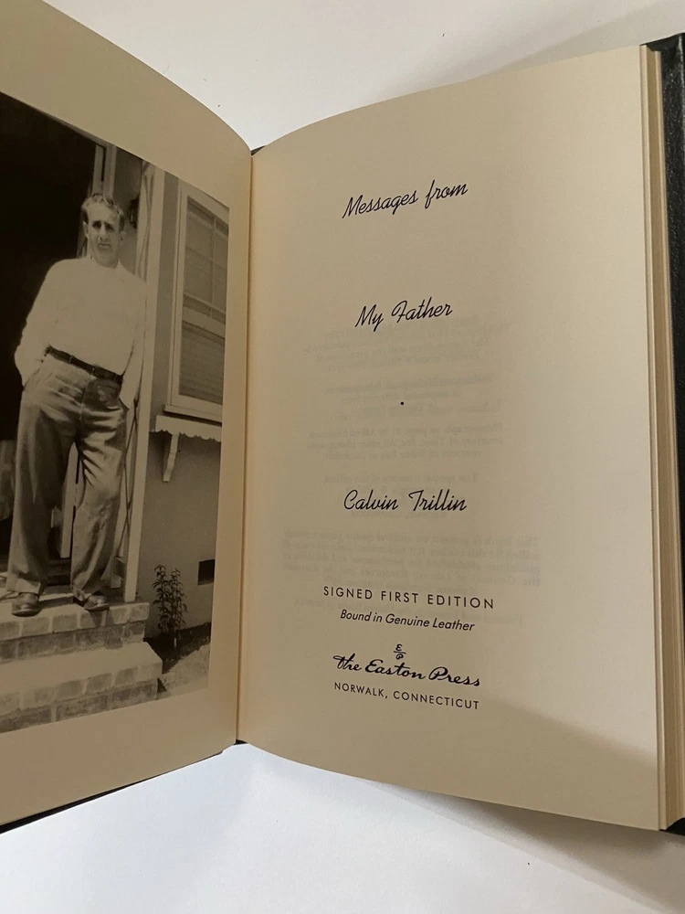 Easton Press leather bound first edition Messages From My Father By Calvin Trillin Signed & numbered 995 of 1600 Great condition- no nameplate, tight binding, gold edges in good condition. Please look closely at photos as they are considered part of the description. Please be aware to expect a slight variation in color due to lighting and your device screen settings. Wrapped in acid free paper and bubble wrap for shipment. From a clean and smoke free home.