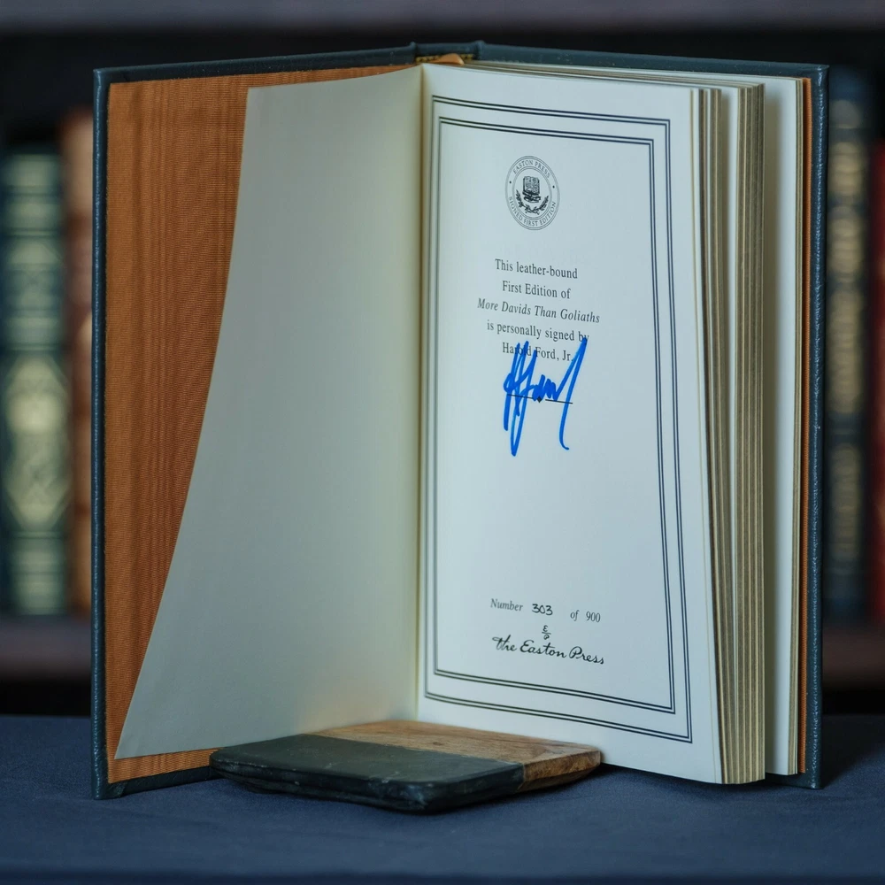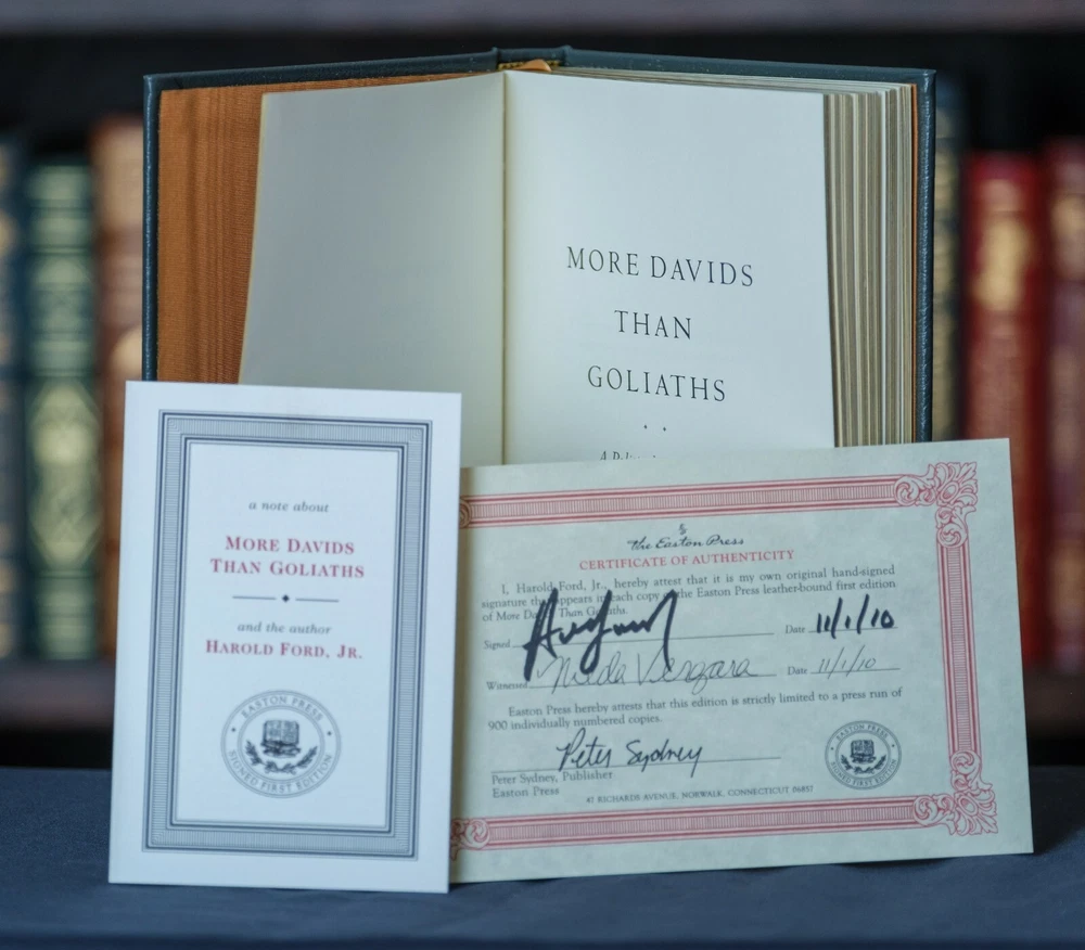 This is a gorgeous, signed first edition of More Davids than Goliaths by Harold Ford, Jr. from the Easton Press Signed First Edition series. This book is in very fine condition. The notes and COA are included with this title. There are no owner's marks, writing, etc. in the book. The book carries no scent from smoking, pets, etc. There are a couple of minor scratches on the gold gilt page edges. See the photos for the actual condition of the book and please message us with any questions about the condition of this title. Thanks for looking! We have multiple listings of Franklin Library and Easton Press books and we can combine shipping on multiple books.