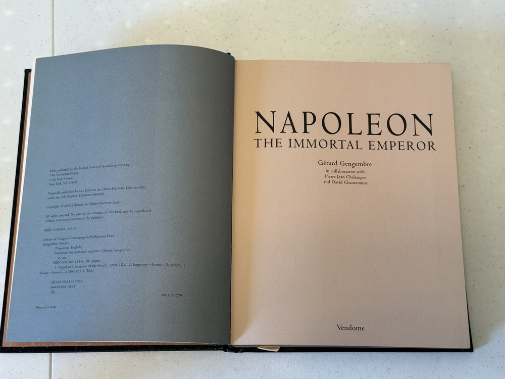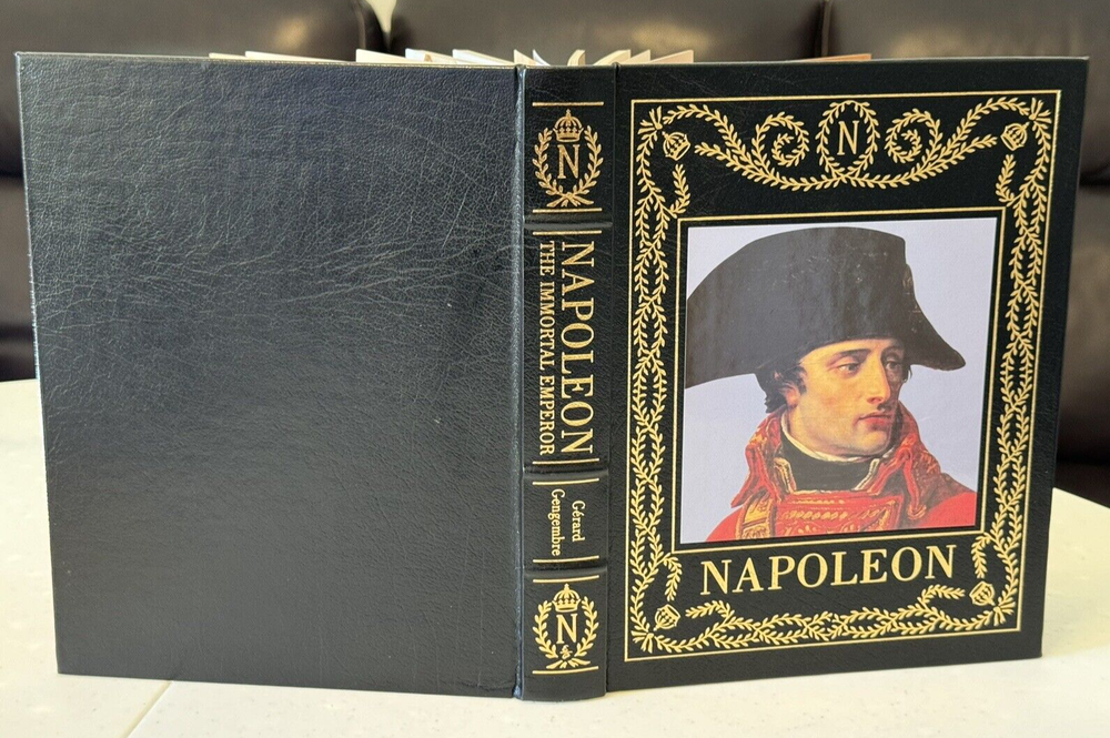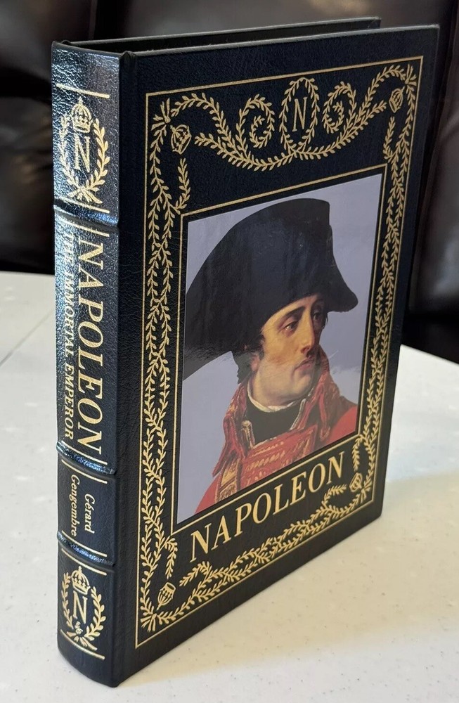 Title : Napolean the Immortal Emperor Authors : Gerard Gengembre Publisher : The Easton Press Copyright : 2002 Collector’s Edition Condition : Fine. Contains attached bookplate from previous owner. Large "Coffee Table" size book. Externals : Full leatherbound hardcover edition. No marks on front or back boards. No bumped corners. Gold page edge gilding has a small mark to top edge and also long edge has small bump. Please see photos. Internals : This book contains an affixed Easton Press bookplate from previous owner. Crisp, clean pages with no marks or writing anywhere. Easton Press Features Include : Full Genuine Leather Binding w/ 22kt Gold Inlay Design 22kt Gold Outside Page Edges Smyth Sewn Binding Acid Neutral Paper Silk Moire End Sheets Satin Ribbon Page Marker Your purchase will be packed out well protected to ensure it arrives in its beautiful condition. Ships promptly in 1-2 business days via USPS Media Mail (USPS Priority Mail also available). Comes from a smoke free home with no pets. This item is guaranteed to be as described so you may buy with confidence. Thank you for looking!