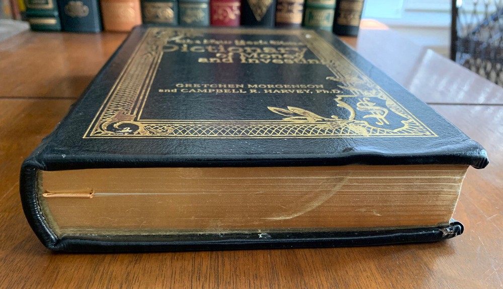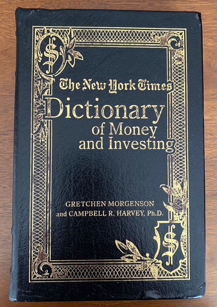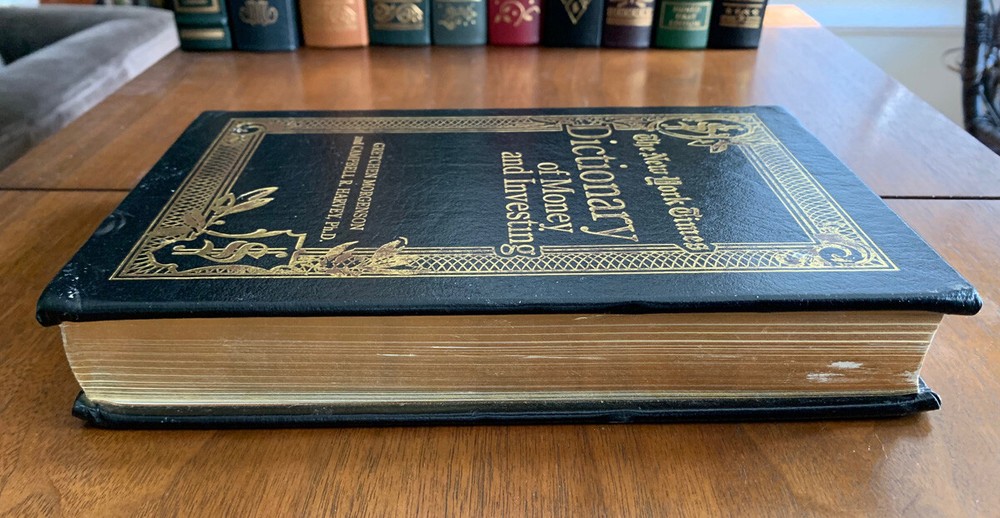 New York Times Dictionary of Money and Investing, published in a collectors edition by Easton Press. "The Essential A-Z Guide to the Language of the New Market" ; "...special contents of this edition copyright 2005" An encyclopedic dictionary of terms used in the world of finance. See pics for details. Book has some wear. Leatherbound, golden gilt edging, sewn in ribbon marker, hubbed spine. The deluxe Easton Press treatment of a classic business reference.