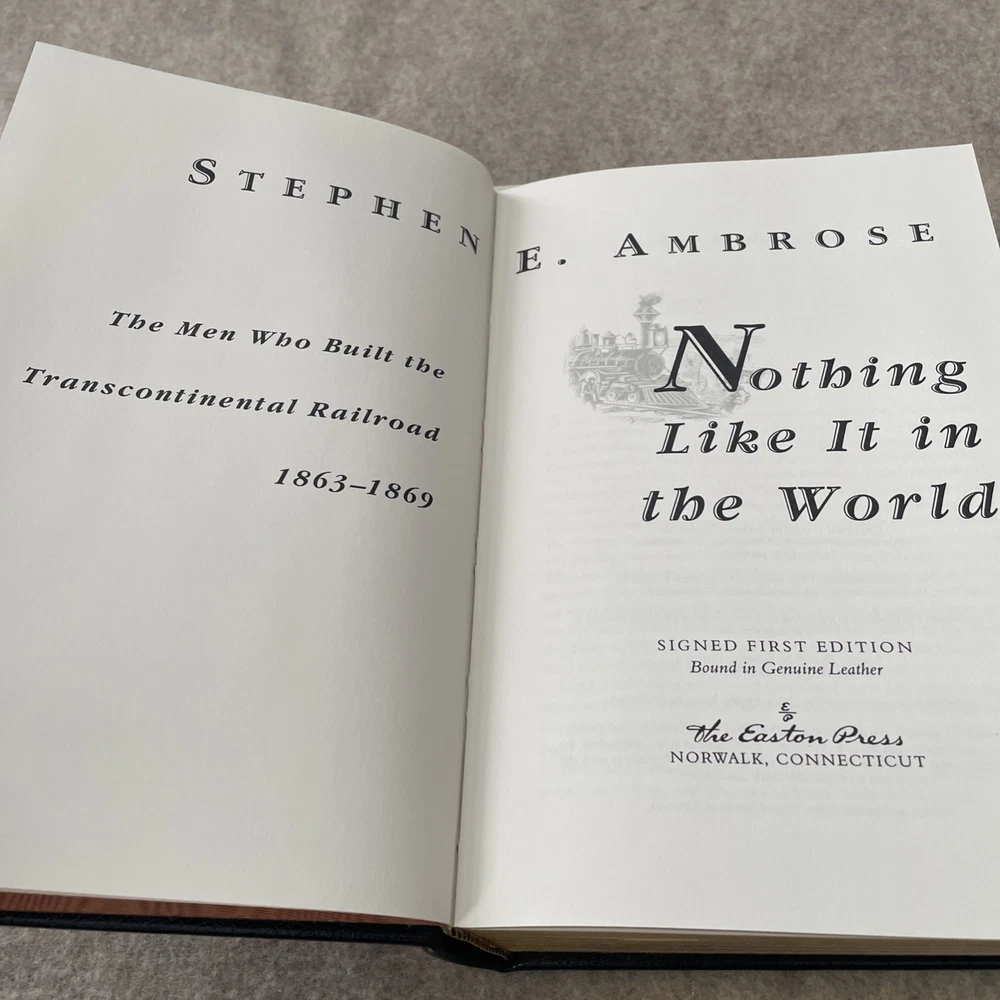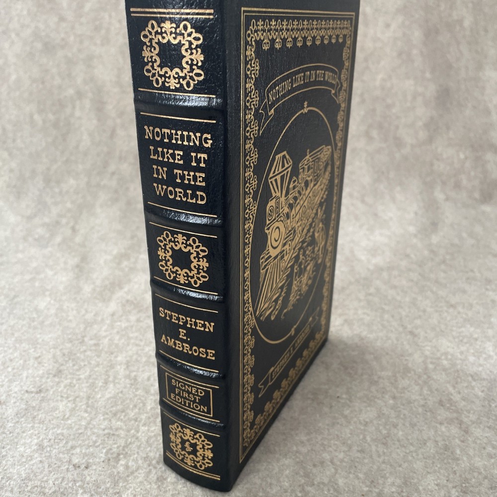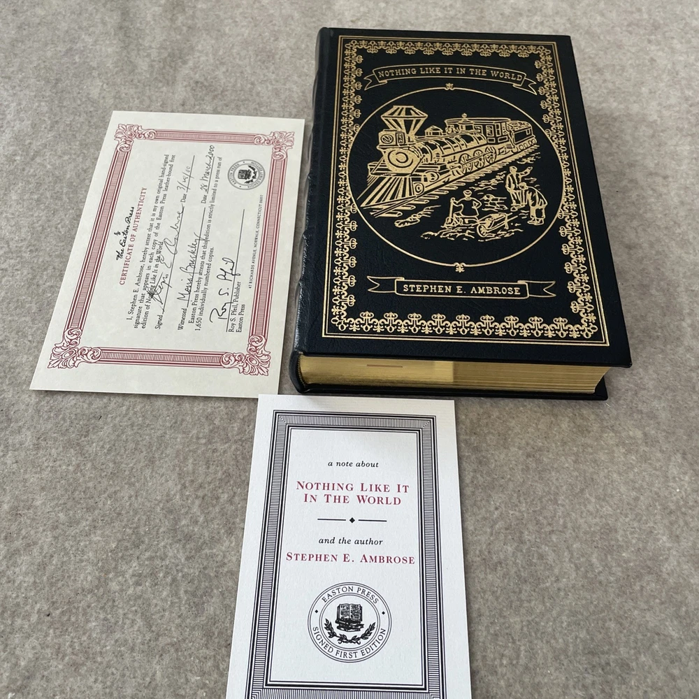 Easton Press Signed First Edition Nothing Like It in the World by Stephen E. Ambrose The book is full leather. It is signed by the author and comes with a COA. This book is in near mint condition with no wear. The gold on the covers looks like new. The end pages show no fading. The gilt on the edge of the pages is in almost perfect condition with a scratch on the bottom. Please see photos. We try to describe as accurately as possible so you will be satisfied with your purchase. We have more books from this set on eBay and we would be happy to combine on shipping to save you money. All books are sent with insurance via USPS Media Mail.