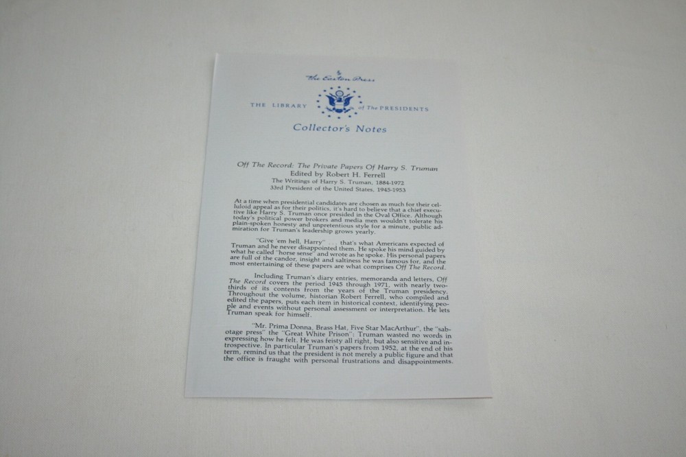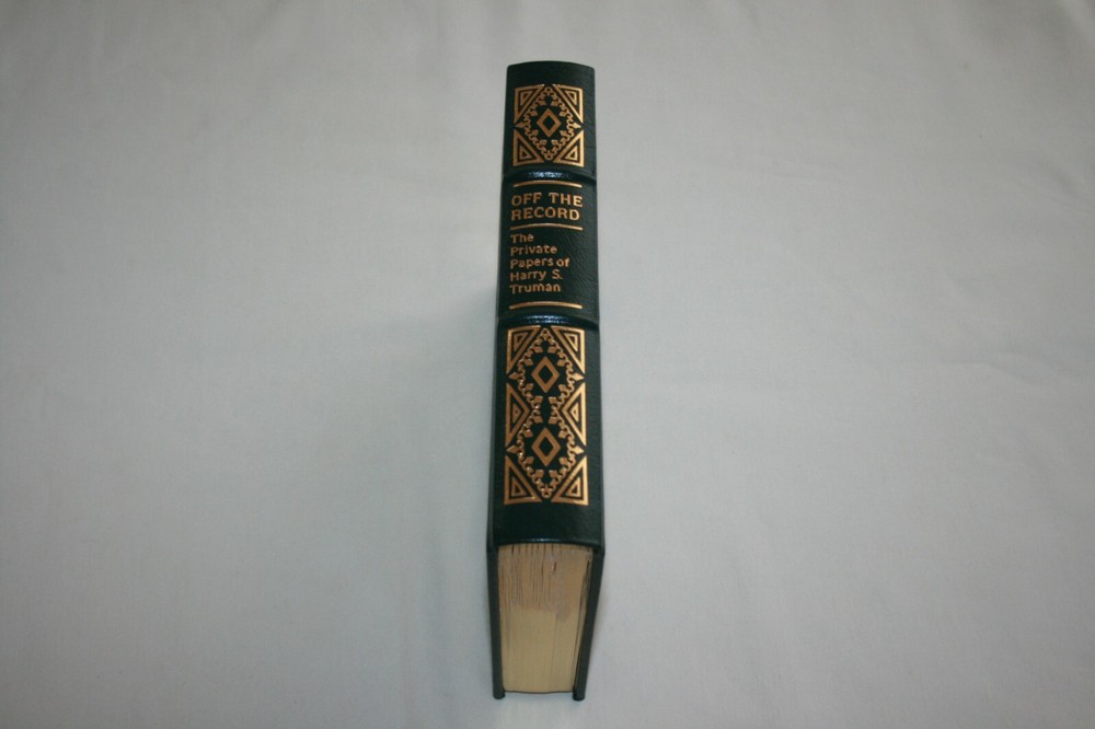 From the Easton Press Library of the Presidents Collector's Edition Series... Off the Record - The Private Papers of Harry S. Truman Edited by Robert H. Ferrell Copyright 1989 by The Easton Press Bound in Premium Full Leather Collector's Edition This volume contains all of the classic Easton Press trimmings: Premium Leather Decorated Endleaves Distinctive Cover Design Hubbed Spine, Accented in Real 22KT Gold Satin Ribbon Page Marker Gilded Page Edges Long-lasting, High Quality Acid-neutral Paper Smyth-sewn Pages for Strength and Durability A very scarce title in any condition, this copy is in Excellent condition. The front and back covers are both in Perfect condition. The bottom gold gilded page edges and pages show some wear from water damage, and the top gilded page edges show some minor wear as well. The binding is tight and square without spine lean. There are no marking, bookplates, or other signs or prior ownership. This book is part of the Library of Presidents published by Easton Press and comes complete with the Collector's Notes. It would be a beautiful addition to your Easton Press collection. Overall, this copy is a grade collector's book. This book is very elusive in this superior condition, as only a limited number of them were ever published, so now is the time to act. Hopefully you can add this book to your collection and enjoy it in the years to come... Please Email Me With Any Questions You Might Have! Shipping Info: Buyer to Pay Shipping and Handling International Bidders Pay Extra Shipping Forms of Payment Accepted: Paypal Good luck and happy bidding! Powered by eBay Turbo Lister The free listing tool. List your items fast and easy and manage your active items.