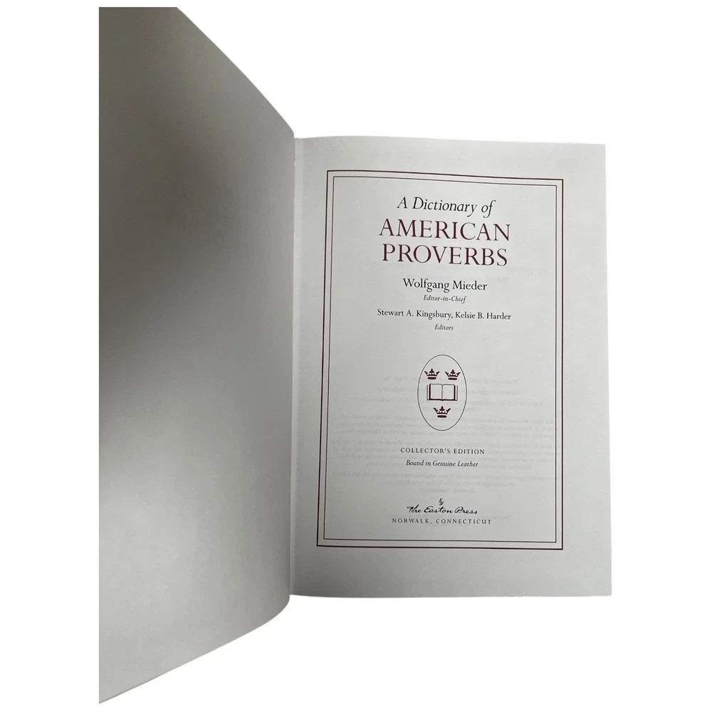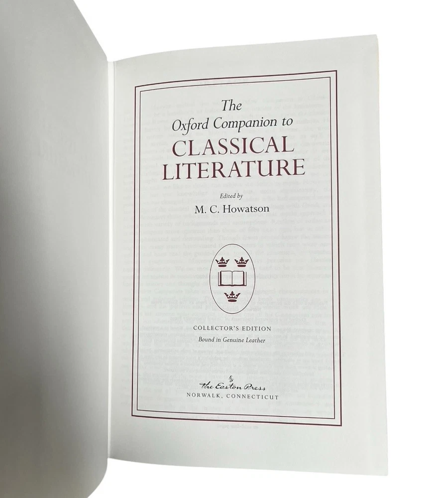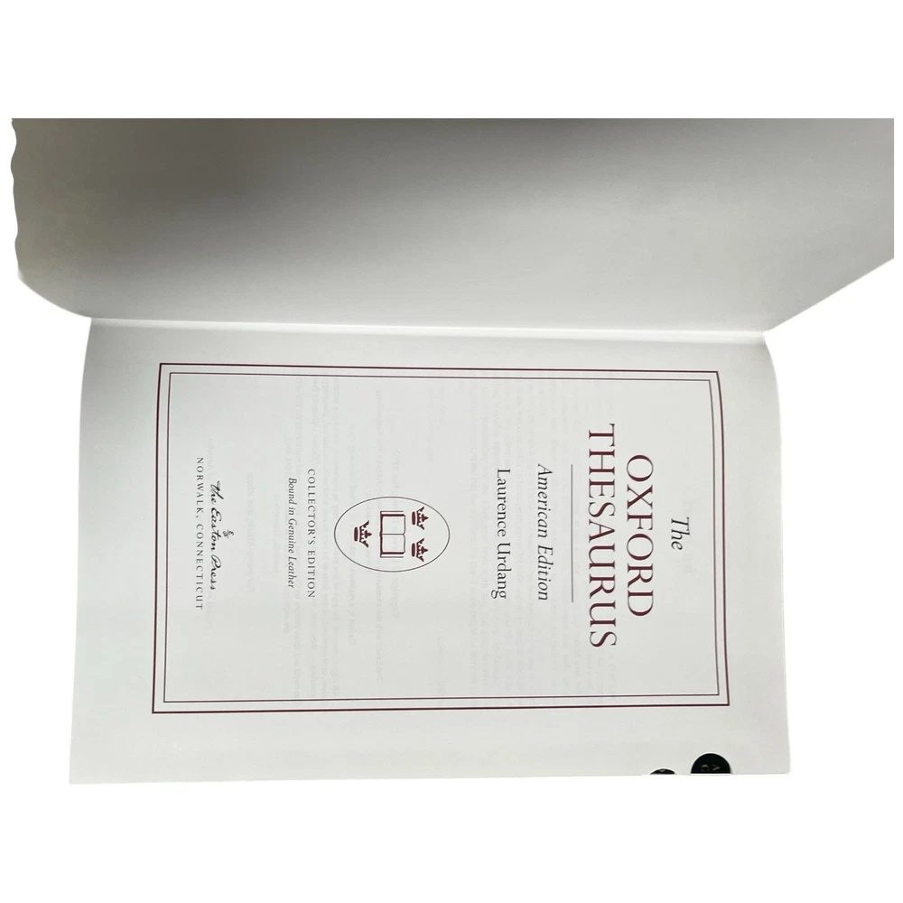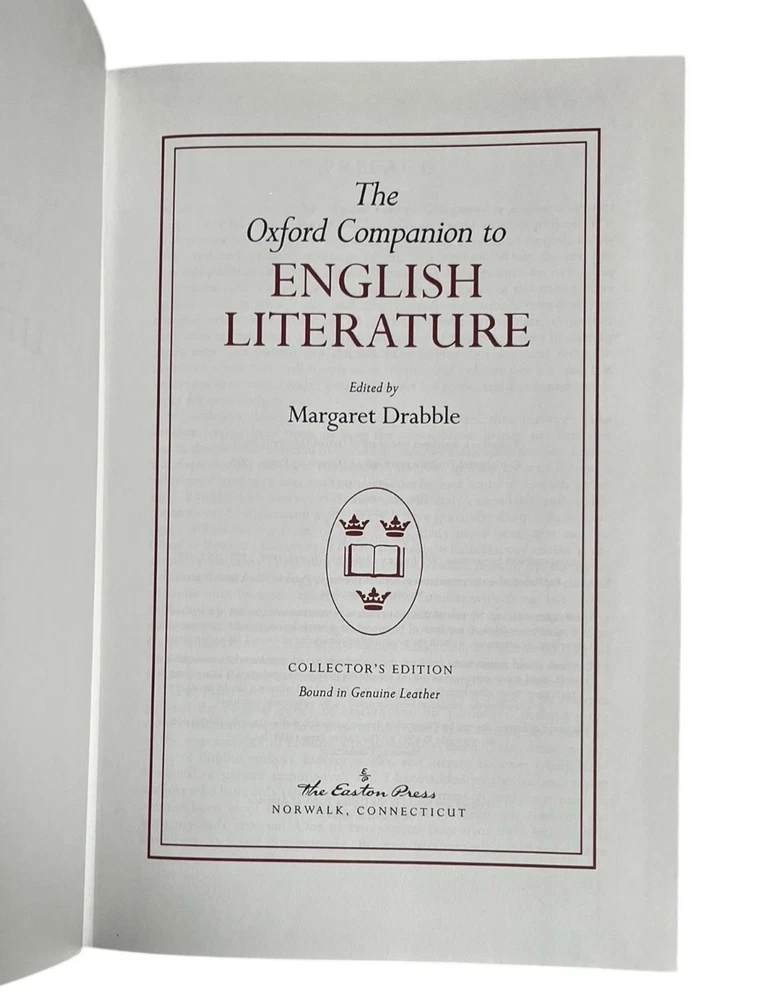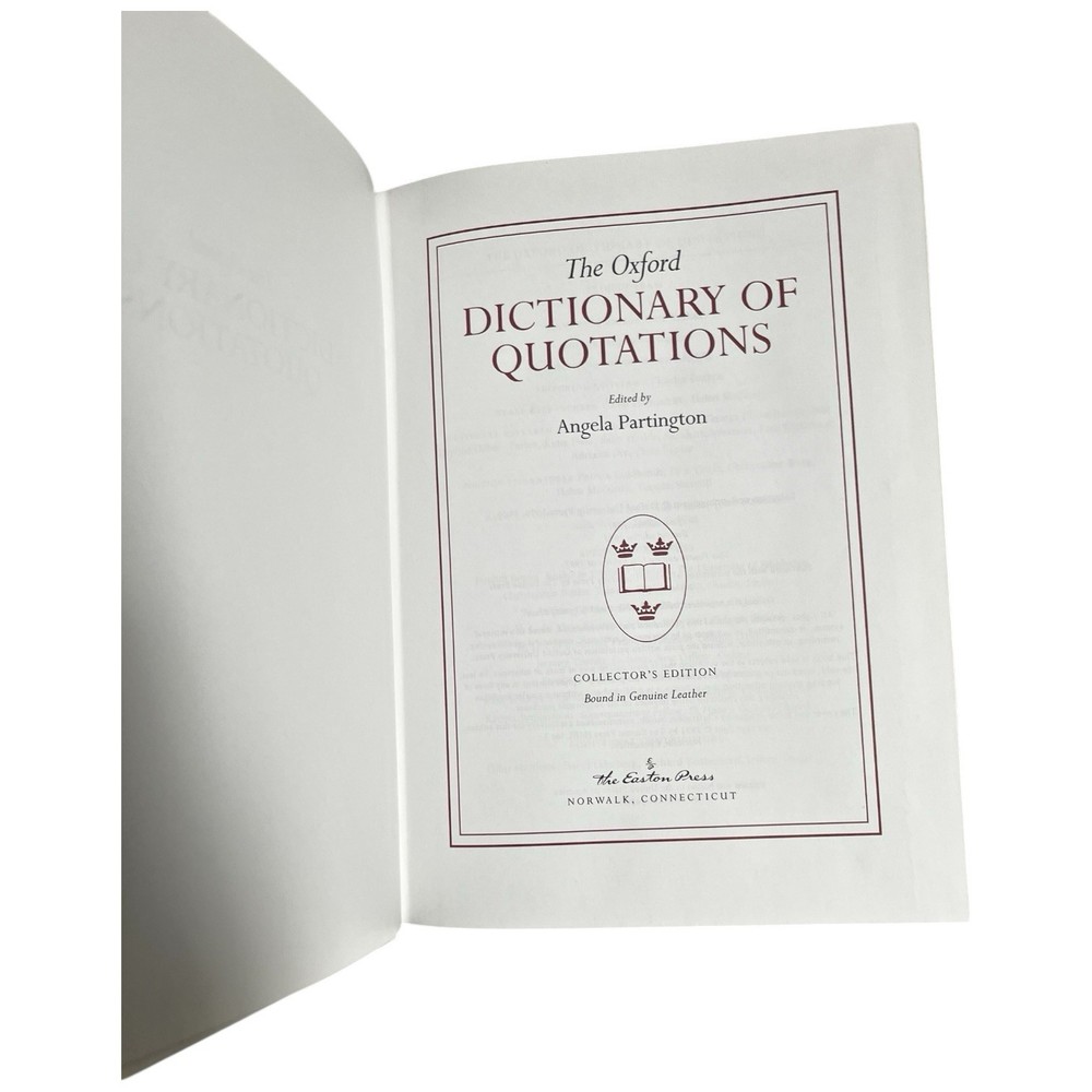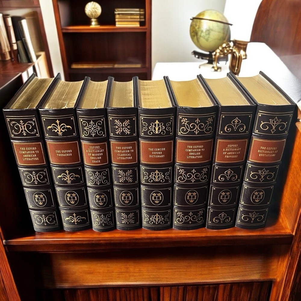 Easton Press Genuine Full Leather Bound Book Hardcover Pre-owned, unread in like new condition appropriate for gift giving All volumes have an unpasted bookplate in front One volume has a small scuff on the long edge in the gilding Uniform brown leather bindings, distinct front cover stamped designs with orange leather title label on spine, including: 1. THE OXFORD DICTIONARY OF QUOTATIONS, edited by Angela Partington 2. THE OXFORD COMPANION TO AMERICAN LITERATURE, by James D Hart 3. OXFORD A DICTIONARY OF AMERICAN PROVERBS, Wolfgang Mieder, Editor-in-Chief 4. THE OXFORD COMPANION TO ENGLISH LITERATURE, by Margaret Drabble5 5. THE OXFORD COMPANION TO CLASSICAL LITERATURE, by M C Howatson 6. THE CONCISE OXFORD DICTIONARY OF CURRENT ENGLISH , First Edited by H W and F G Fowler, 8th Ed. edited by R E Allen 7. THE OXFORD THESAURUS, American Edition, by Laurence Urdang 8. OXFORD A DICTIONARY OF MODERN ENGLISH USAGE, by H W FOWLER, Second Edition revised by Sir Ernest Gowers Some typical features of Easton Press Leather Bound Books include: Fully bound in genuine leather Illustrated 22kt gold deeply inlaid on the "hubbed" spine Superbly printed on acid-neutral paper Handsome moiré end pages and a satin-ribbon page marker Sewn pages not just glued like ordinary books Inspection at every stage ensures adherence to exacting standards Superb craftsmanship and commitment to quality
