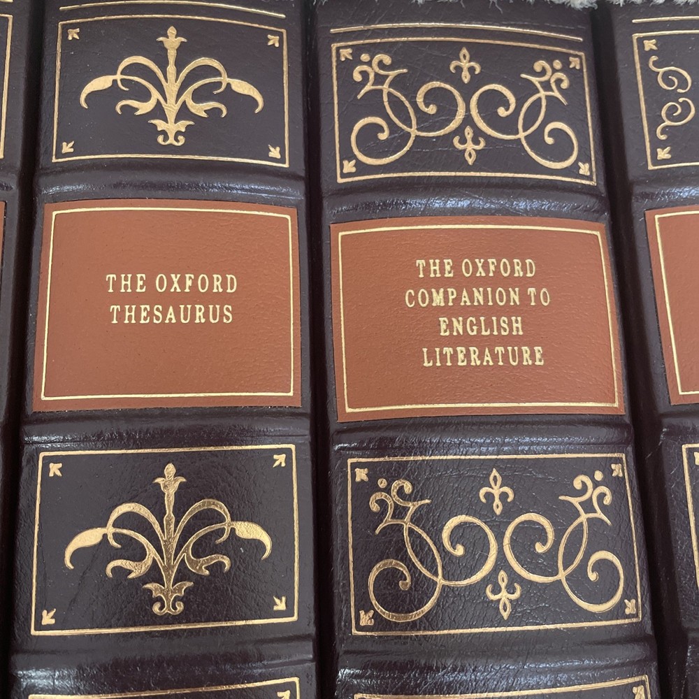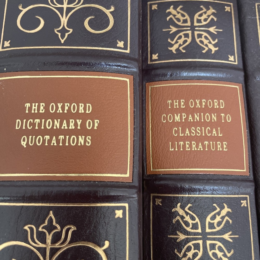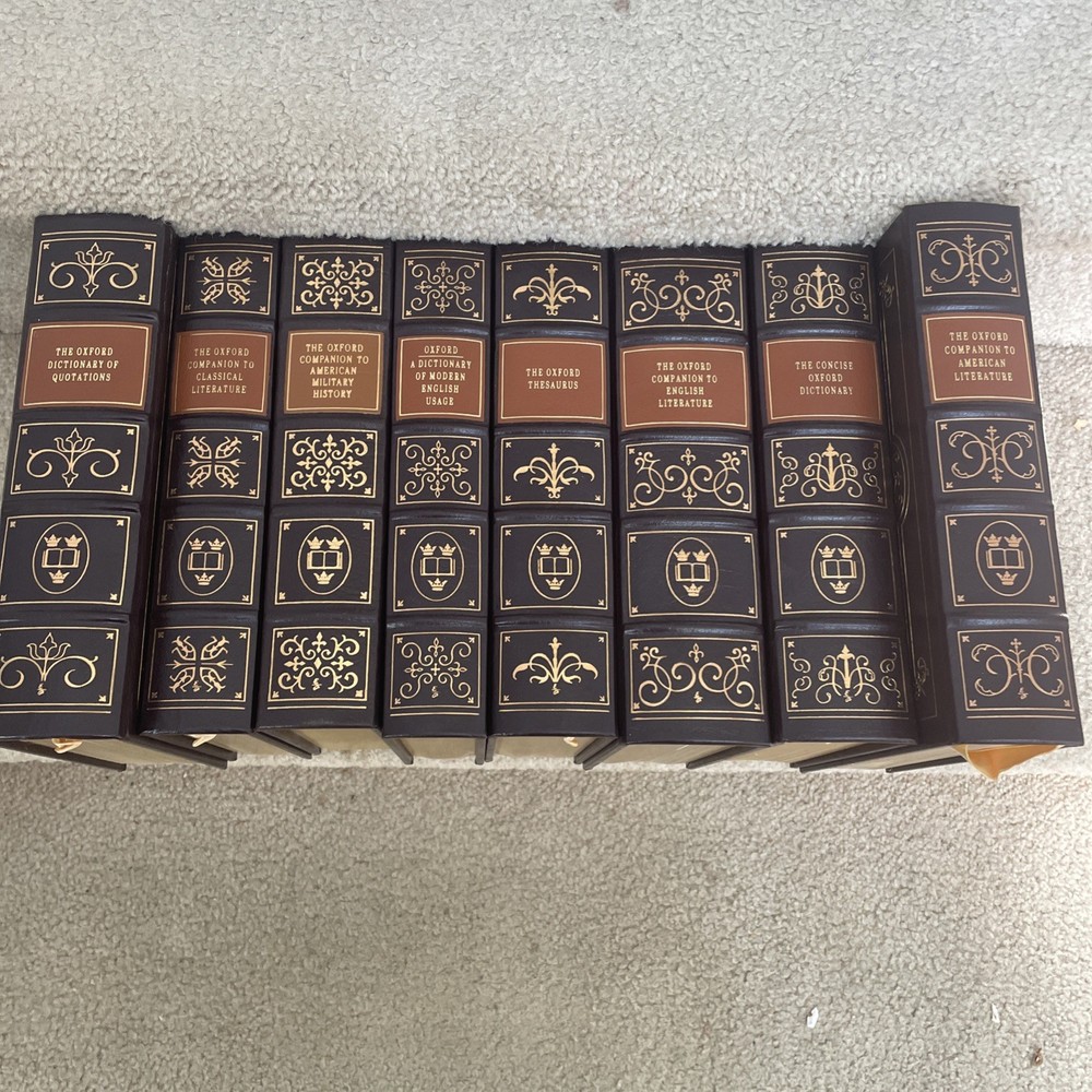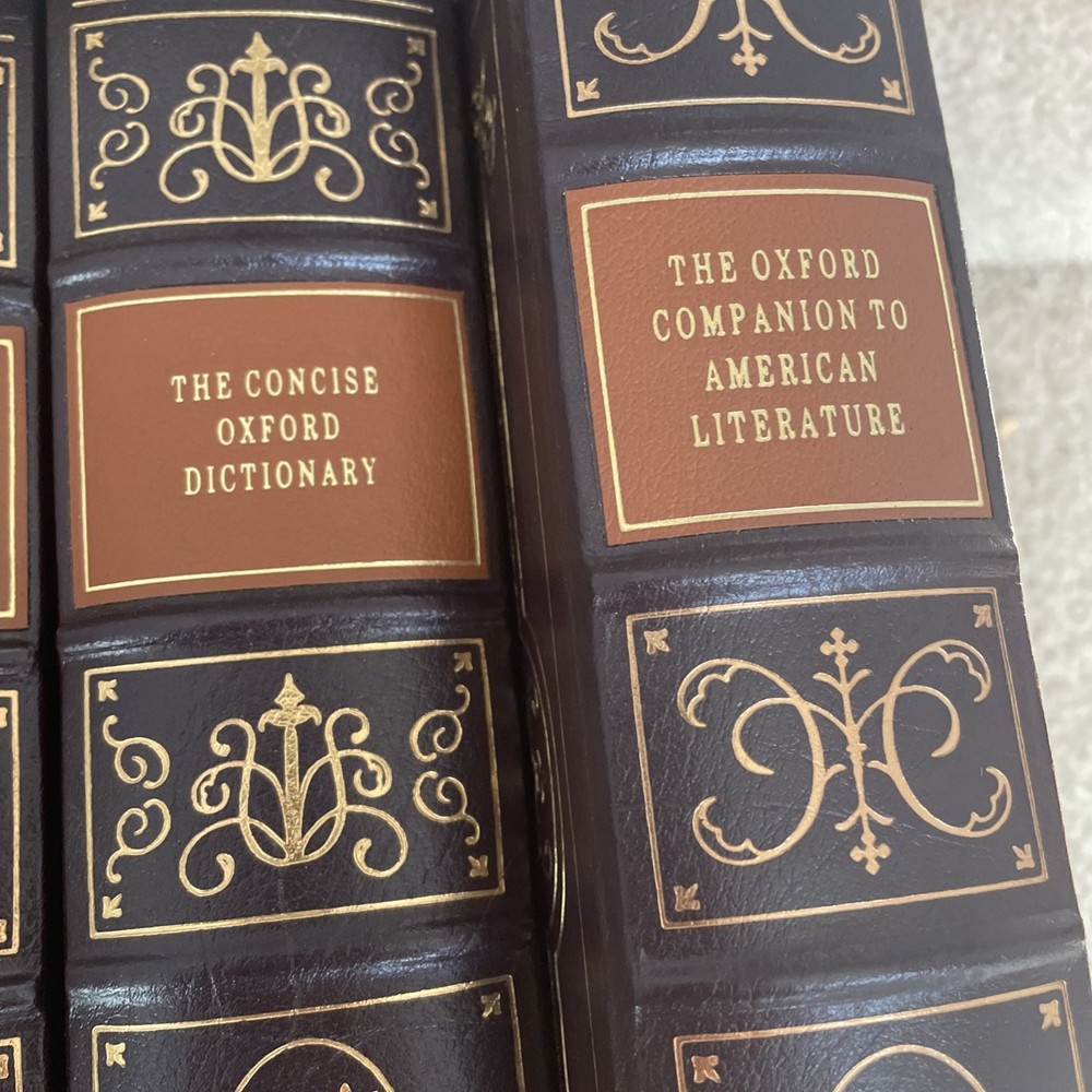 Easton Press Collector's Edition 8 Volumes of Oxford Dictionaries, Companions, etc., to include: The Concise Oxford Dictionary The Oxford Thesaurus The Oxford Companion to American Military History The Oxford Dictionary of Quotations Oxford - Fowler's Modern English Usage The Oxford Companion to English Literature The Oxford Companion to American Literature The Oxford Companion to Classical Literature The book is full leather. There are no bookplates in the book. This books are in near mint condition with no wear. The gold on the covers looks like new. The end pages show no fading. The gilt on the edge of the pages is in almost perfect condition with only a couple scratches to be found and a little shelf wear to the gilt on the corners of a couple volumes. Please see photos. We try to describe as accurately as possible so you will be satisfied with your purchase. We have more books from this set on eBay and we would be happy to combine on shipping to save you money. All books are sent with insurance via USPS Media Mail.