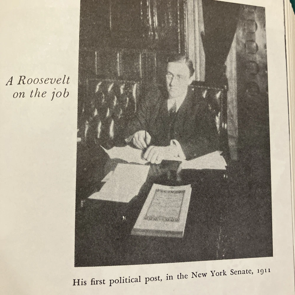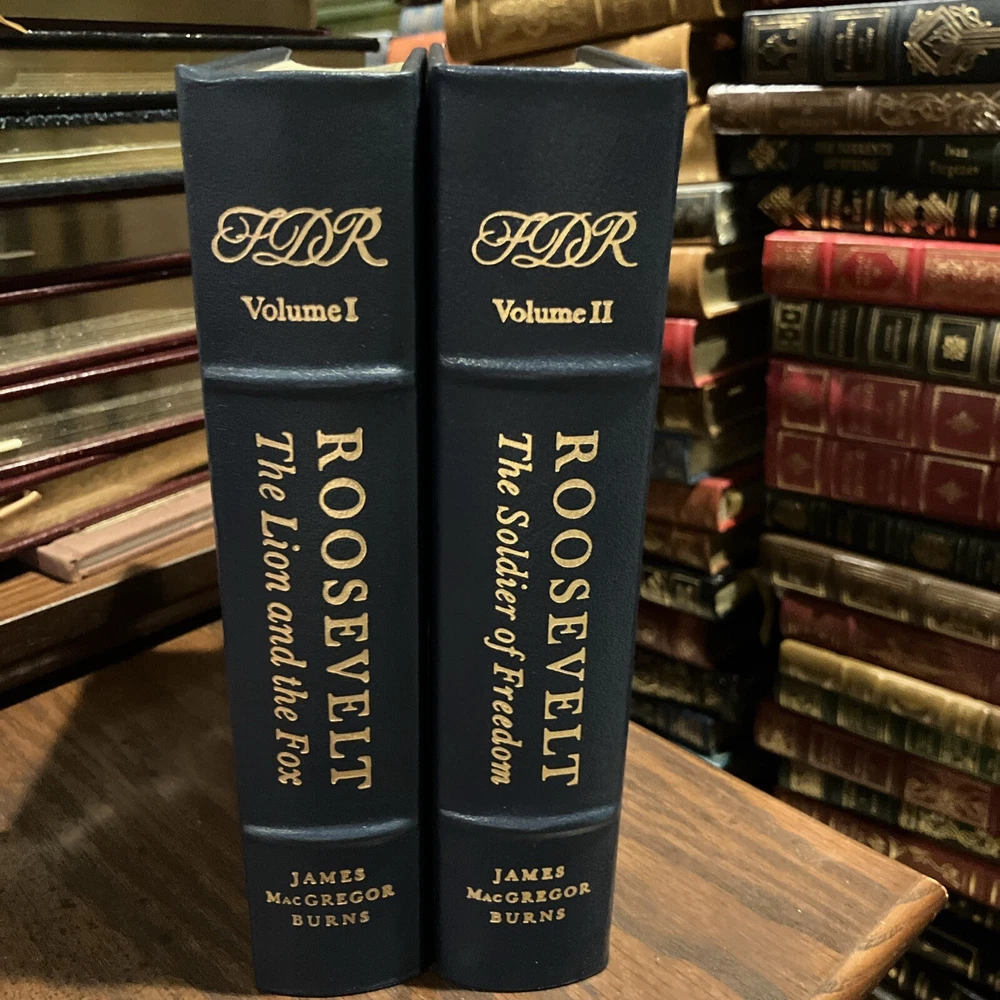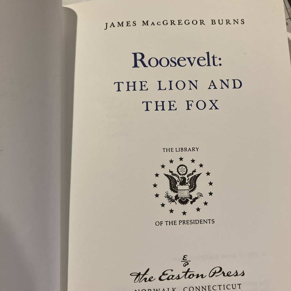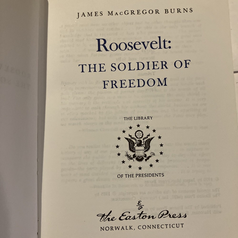 Easton Press leather edition of James MacGregor Burns's "Roosevelt: The Lion and the Fox, Volume one and "Roosevelt: The Soldier of Freedom," Volume two, COLLECTOR'S editions, part of the LIBRARY OF THE PRESIDENTS series, published in 1985. Bound in navy blue leather, the books have decorative paper end leaves, hubbed spine, acid-free paper, Symth-sewn binding, a satin book marker, gold gilding on three edges---in near FINE condition. COLLECTOR'S NOTE is included. Franklin Delano Roosevelt, who lived from 1882-1945, was an only child and born into an affluent Hudson River Valley family. "My son Franklin is a Delano, not a Roosevelt at all," Sara used to say. FDR attended GROTON and graduated from HARVARD, a "mild and liberal school which sent young men into the world as respectable citizens." Roosevelt married his fifth cousin, Eleanor, in 1905. The Roosevelts' marriage was complicated from the beginning by Franklin's controlling mother, Sara. The Roosevelts, who lived in Sarah's house in Hyde Park, became parent to five children in 10 years: Anna in 1906, James in 1907, Elliott in 1910, FDR, Jr. in 1914, and finally John in 1916. When Eleanor learned that her husband was having a sexual affair with her social secretary, LUCY MERCER RUTHERFORD, Eleanor agreed to stay married---but her bedroom door was CLOSED! She persuaded Franklin to stay in politics after he was stricken with debilitating polio in 1921, which cost him the use of his legs, and Eleanor Roosevelt began giving speeches and appearing at campaign events in his place. Following Franklin's election as Governor of New York in 1928, and throughout the remainder of Franklin's public career in government, Eleanor Roosevelt, reshaped and redefined the role of "first lady," for her outspokenness, particularly her stance on racial issues. She was the first presidential spouse to hold regular press conferences, write a daily newspaper column, write a monthly magazine column, host a weekly radio show, and speak at a national party convention. She advocated for expanded roles for women in the workplace, the civil rights of African Americans and Asian Americans, and the rights of World War II refugees. Roosevelt was a New York State Senator when WOODROW WILSON appointed him Assistant Secretary of the Navy, and in 1920 he was nominated for the Vice Presidency. In 1932, Roosevelt was swept into office, determined to restore American confidence. The New Deal that roosevelt easily persuaded the Congress to implememt altered the structure of society, particularly the WPA program that put people back to work building, roads, national parks, libraries, etc. His SOCIAL SECURITY has proven to be a popular program. FDR is the only man elected four times to the Presidency. Boundless energy, combined with pragmatic and adventurous nature, enabled him to end the major depression of the 1930s and to help defeat the Axis power in World War II. In 1940, FDR pleaded with Congress for moral and financial assistance to help Britain and her allies defeat the Axis powers. America's response was the Lend-Lease program. On December 7, 1941, FDR told Congress that it was a "date which will live in infamy," a reference to the attack by the Japanese on Pearl Harbor. By the time of the 1945 YALTA conference, when FDR met with STALIN and CHURCHILL, he was physically an old man. MacGregor concludes that "he was indeed, in all the symbolic and ironic senses of the term, "a soldier of freedom." I offer Combined shipping.