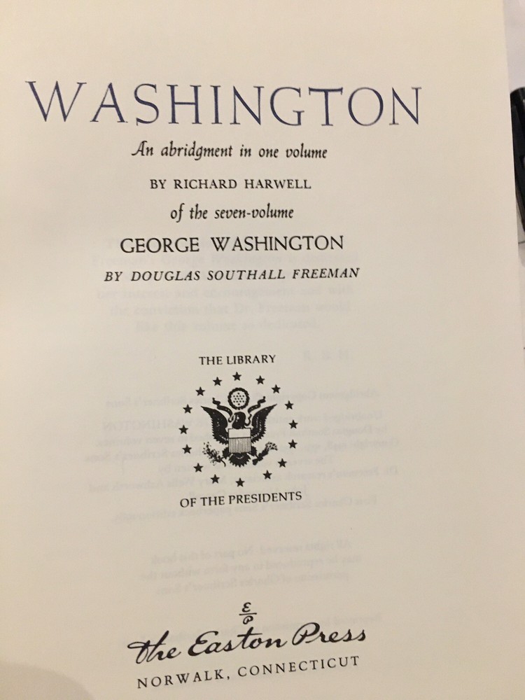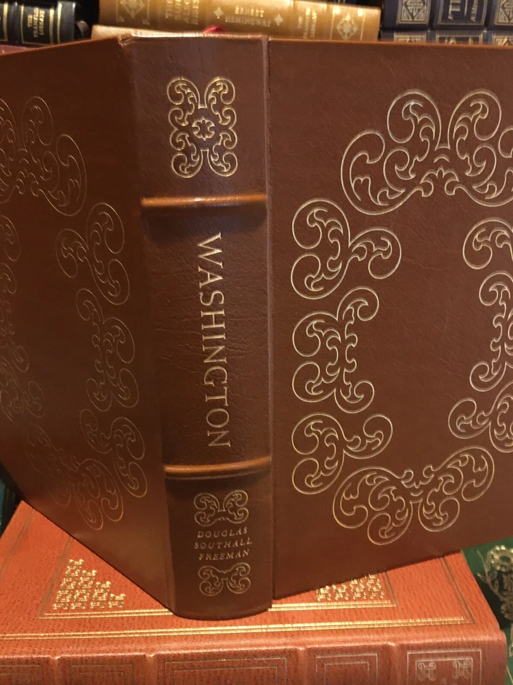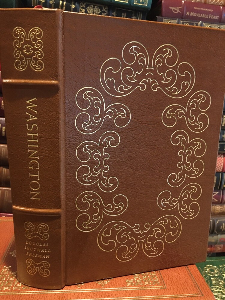 Easton Press leather edition of Douglas Southall Freeman's "Washington: An Abridgment in one Volume of the original Seven" by RICHARD HARWELL, one of the LIBRARY OF THE PRESIDENTS series, published in 1985. Bound in camel tan leather, the book has decorative paper end leaves, acid-free paper, Symth-sewn binding, a satin book marker, gold gilding on top edge only---in near FINE condition. George Washington, who lived from 1732---1799, was born on a plantation on the Potomac River in Westmoreland County, Virginia. He served as President of the U.S. from 1789-1797. His father died in 1743, leaving an estate of 10,000 acres and 50 slaves. The largest portion was bequeathed to George's brother, Lawrence. Washington became a surveyor in 1749 and with his money he began purchasing land, including 1,459 acres in the Shenandoah Valley in 1750. In 1752, Lawrence died and left the bulk of his estate to his wife, Ann. George W was appointed an adjutant of militia with the rank of major. In 1759, he married MARTHA CUSTIS, a wealthy widow who owned thousands of acres and hundreds of slaves. In 1761, he inherited MOUNT VERNON after the death of his sister in law, Ann. GW was involved in the French and Indian War and was later chosen as one of seven Virginia delegates to the Second Continental Congress in 1775 and ultimately the leader during the REVOLUTIONARY WAR. This volume includes his letters to Robert Dinwiddie, John Augustine Washington, Lund Washington, Benedict Arnold, Martha Washington, Joseph Reed, Alexander Hamilton, Marquis de Lafayette, Benjamin Franklin, Thomas Jefferson, James Madison, Bushrod Washington, his First, Second, Third, Fourth, Fifth, Six and Seventh Annual Messages to Congress, Address to the Cherokee Nation, his Proclamation Concerning the "Whiskey Rebellion," his First and Second Inaugural Address, his Farewell Address in May 1796, his Retirement, 1797-1799, and His Last Will and Testament. Douglas Southall Freeman was a native of Lynchburg, Virginia, and a graduate of Richmond College. He received his LL.D. at JOHNS HOPKINS in 1908. For the next thirty-five years he served as the Editor of the Richmond Free News. Dr. Harwell was chief librarian for several colleges and curator of rare books and manuscripts at the University of Georgia. 780 pages, including an Index. I offer Combined shipping.