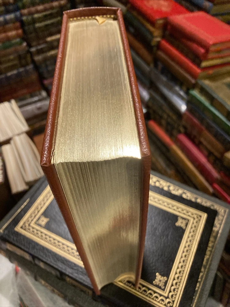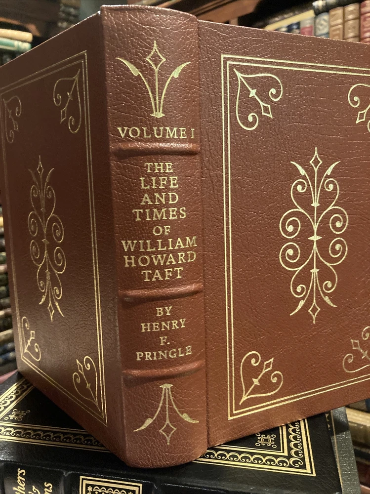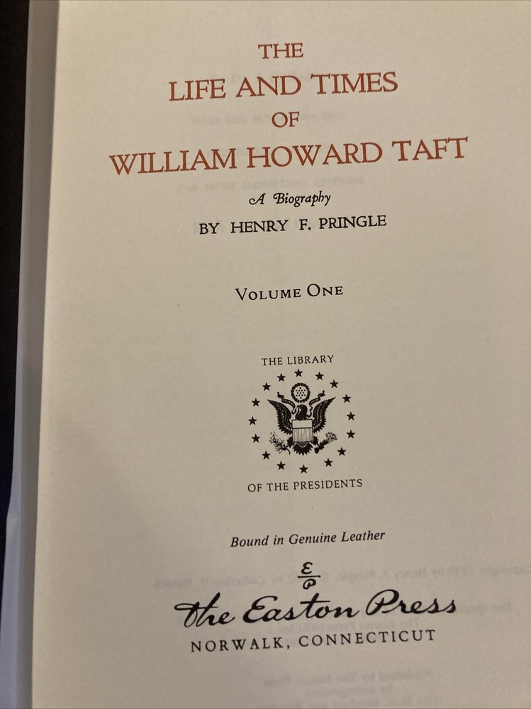 Easton Press leather edition of Henry F. Pringle's "The Life and times of William Howard Taft," Volume 1, a COLLECTOR'S edition, one of the LIBRARY OF PRESIDENTIAL HISTORY series, published in 1986. Bound in camel tan leather, the book has decorative acid-free paper end leaves, Symth-sewn binding, satin book marker, hubbed spine, gold gilding on three edges---in near FINE condition---except for 'blank' attached bookplate on inside fly leaf and a small crimped book press on title page. COLLECTOR'S NOTES is included. William Howard Taft, who lived from 1857-1930, was born in Ohio; he graduated from Yale and Cincinnati Law School and rose rapidly in the legal profession. Taft holds a unique place in American history in that he was the only man ever to be both President of the U.S. and later, Chief Justice of the Supreme Court. Pringle wrote: "A big, burly, good natured Midwesterner, Taft was a man of singular integrity and great accomplishment." Taft served as THEODORE ROOSEVELT's appointed governor of the Philippines but was recalled to Washington to become Secretary of War. Taft was Roosevelt's choice to succeed him, but the two men disagreed on issues and Roosevelt formed the "Bull Moose" Party and split the Republican vote and Taft was resoundingly defeated for a second term. William Howard Taft, the twenty-seventh president of the United States, and his wife Helen Louise Herron, had three children: Robert, Helen and Charles. All of them were born in Cincinnati, Ohio; their parents were married there in 1886, and the family kept close ties to the city. As children, though, the three Taft youngsters were citizens of the world, who accompanied their parents throughout the United States, and lived in the Philippines, where their father served as Governor-General from 1901-1903. Only one child—the youngest, Charles—lived in the White House during William Howard Taft’s 1909-1913 presidency. These experiences, and their parents’ commitments to learning and self-improvement, insured that each of the three would differentiate himself in adulthood—brilliantly. However, Taft's wife, Helen, "made waves" when she hired Chinese servants for the White House. Later, President Warren Harding named Taft as Chief Justice of the Supreme Court. Volume one takes the reader through the first half of Taft's term as President. 555 pages, plus Notes, a Bibliography and an Index. I offer combined shipping.
