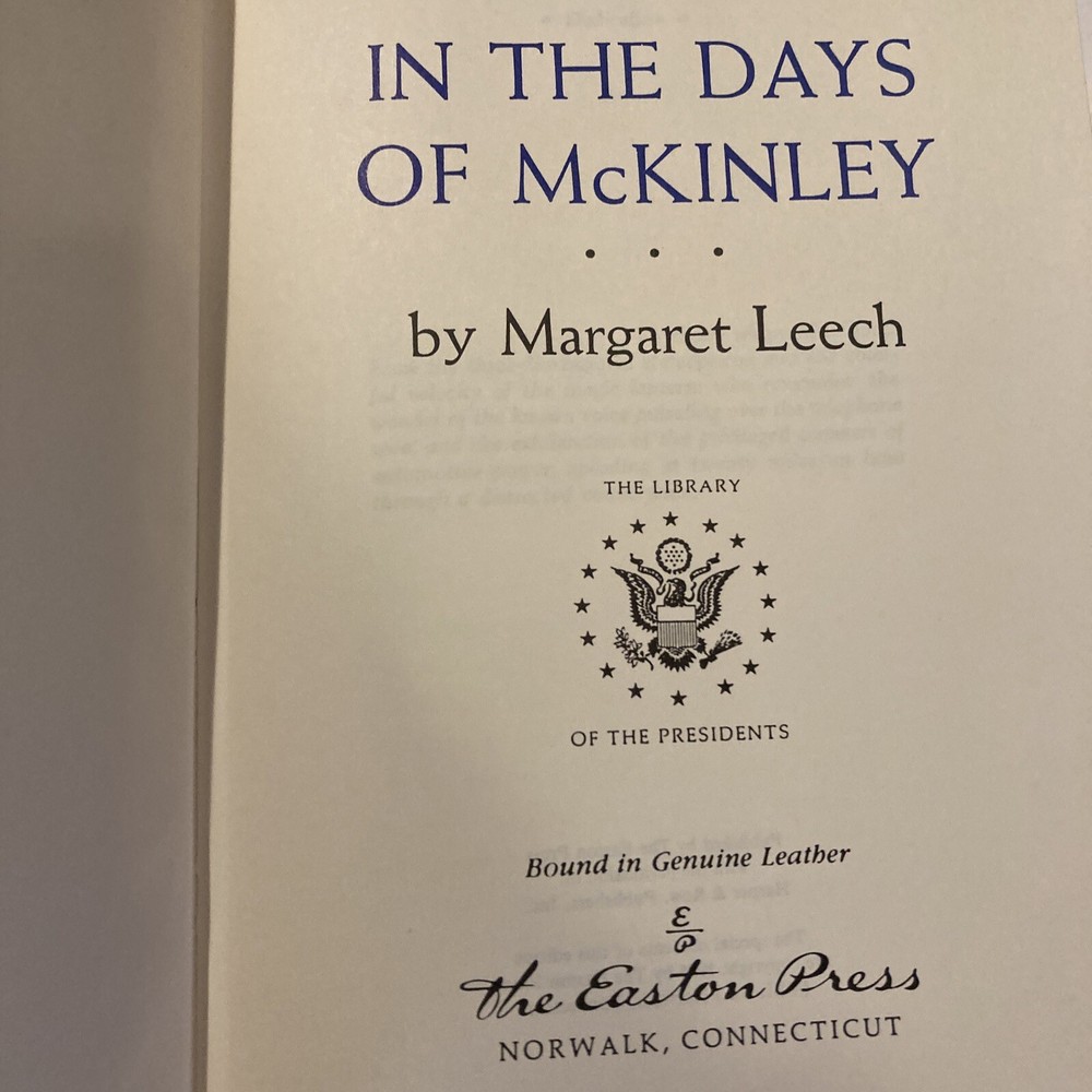 Easton Press leather edition of Margaret Leech's "In the Days of McKinley," a COLLECTOR'S edition, one of the LIBRARY OF THE PRESIDENTS series, published in 1986. Bound in deep hunter green leather, the book has decorative paper end leaves, acid-free paper, Symth-sewn binding, a satin book marker, gold gilding on top edge only---in FINE condition. William McKinley, who lived from 1842---1901, was born in Niles, Ohio, the seventh son of nine children. He attended Allegheny College in Pennsylvania. He fought with the Union Army and was on the bloody field at Antietam in Maryland. McKinley was described as a "handsome, bright, gallant boy" and at twenty-two had matured into vigorous manhood. McKinley left the army with an abiding hatred of war. He married IDA SAXTON to whom he was madly, devotedly in love. McKinley, a lawyer, became governor of Ohio at age forty-nine, and was elected to Congress, 1876-82, 1884-1890. McKinley was elected President and presided during the Spanish-American War. His presidency also saw the annexation of Hawaii and certain Samona Islands, intervention in China, and agitation for a Panama Canal. He was assassinated by anarchist, Leon Czolgosz in Buffalo, New York, at the Pan-American Exposition. Vice President THEODORE ROOSEVELT assumed the Presidency in 1901. 686 Pages. I offer combined shipping.