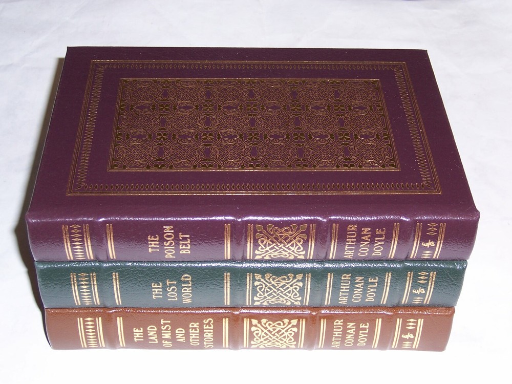 Heirloom edition Easton Press PROFESSOR CHALLENGER SERIES in 3 volumes by Conan Doyle Multi-color hardcover binding stamped pattern design on the front hardcover with frontispieces that reproduce illustrations from an early dust jacket. do not miss out this good deal Copyright by The Easton Press hubbed spine, bound in premium full leathers distinctive cover design, beautiful illustrations handsome, readable typefaces, permanent satin ribbon page marker elegant gilded page edges, endsheets of rich moire fabric thread-sewn pages for durability and strength, long-lasting high quality, acid-neutral paper LIST OF TITLES: a series in 3 volumes: 1. The Lost World 2. The Poison Belt 3. The Land of Mist and Other Stories CONDITION DESCRIPTION: Like new and unread condition, binding is tight and gold page edging still shiny, beautiful bright endleaves and satin ribbon page marker. This set could be a precious addition to your family library. SHIPPING / HANDLING: Book(s) will be handled/packed very safely, and shipped via USPS media mail with delivery confirmation.