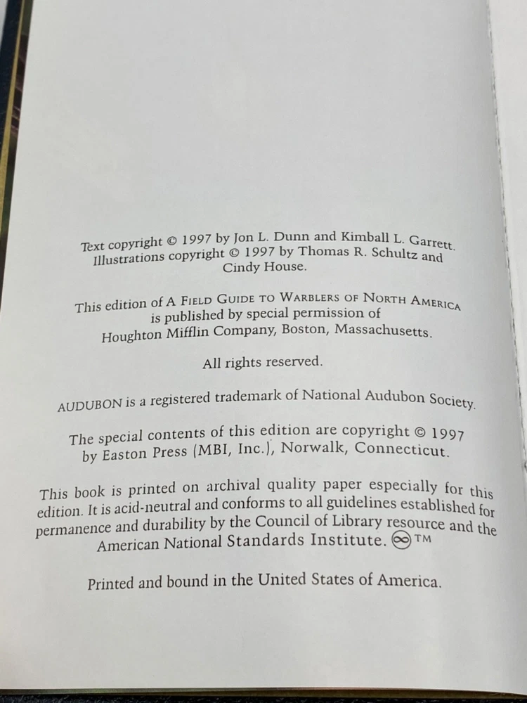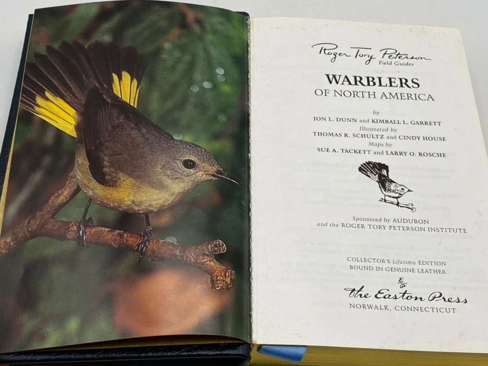 MAKES THE PERFECT GIFT FOR ANY BIRD LOVER ** PLEASE READ : Mahalo for taking the time to look at our listing. We truly appreciate it. We always do our BEST to give you the most accurate description of these beautiful books. If, however, you have any SPECIFIC questions about the SIZE of the book, NUMBER of pages, TYPE of leather, SMELL or FEEL of the book, PLEASE email us through EBay’s mail system BEFORE you bid, and we will be HAPPY to give you more information. We want you to be completely happy with your purchase and keep you as our customers for years to come!** DESCRIPTION: Easton Press’s FULL LEATHER edition, LONG out of print. THIS IS AN HEIRLOOM EASTON EDITION WITH BEAUTIFUL ILLUSTRATIONS. IT IS ONE OF THE MOST HIGHLY PRIZED EDITIONS OF THIS GREAT FIELD GUIDE. THE ORIGINAL UNATTACHED BLANK BOOKPLATE IS INCLUDED. ABOUT THE BOOK: The first comprehensive field guide to North American warblers describes all 60 species in detail, from field marks and vocalizations to mating habits and preferred habitats. The 32 color paintings use the unique Peterson Identification System to indicate what distinguishes one bird from another. 141 color photographs show various plumages for each species, and 60 large color maps show species' ranges. Description CONDITION: Book is in LIKE NEW condition for its age with only a few faint rubs to the gilt endpages (SEE PICS FOR FURTHER DETAILS). NO WRITING FROM PREVIOUS OWNER, ETC. It is truly a SPECTACULAR EDITION. SHIPPING: FREE to US ADDRESSES ONLY. INTERNATIONAL $ based on location. WE SHIP PRIORITY MAIL & PACK VERY WELL. Please check out our other listings of Easton Press, Franklin Library, and Limited Editions Club, First Edition Library, Folio Society, Heritage Press and International Collectors Library editions. WE DO COMBINE SHIPPING IF YOU PURCHASE MORE THAN ONE COPY. Mahalo for looking at our listings! By bidding/purchasing this item, you are helping a very grateful family who sends you our WARMEST ALOHA & MAHALO!