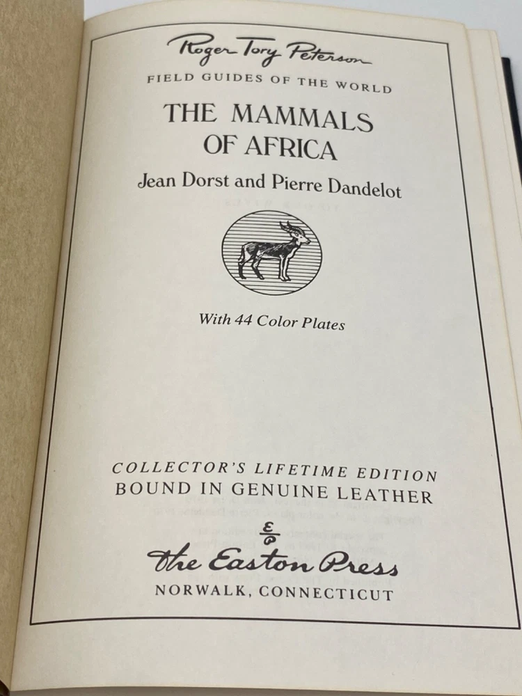 MAKES THE PERFECT GIFT FOR ANY FAN OF THE RARE MAMMALS OF AFRICA / FIELD GUIDES / VINTAGE LEATHER-BOUND BOOKS ** PLEASE READ : Mahalo for taking the time to look at our listing. We truly appreciate it. We always do our BEST to give you the most accurate description of these beautiful books. If, however, you have any SPECIFIC questions about the SIZE of the book, NUMBER of pages, TYPE of leather, SMELL or FEEL of the book, PLEASE email us through EBay’s mail system BEFORE you bid, and we will be HAPPY to give you more information. We want you to be completely happy with your purchase and keep you as our customers for years to come!** DESCRIPTION: Easton Press’s FULL LEATHER PETERSON’S FIELD GUIDES of MAMMALS OF AFRICA, long OUT OF PRINT. THIS IS A SCARCE, ONE OF THE MOST DIFFICULT TO FIND VINTAGE HEIRLOOM EASTONS WITH LAVISH GILT IMPRESSIONS TO THE BOARDS AND SPINE with INCREDIBLE ILLUSTRATIONS AND COLOR PHOTOS. THIS IS ONE OF THE MOST HIGHLY-PRIZED & MOST BEAUTIFUL EDITIONS OF THIS PETERSON FIELD GUIDES YOU CAN FIND. ORIGINAL UNUSED, UNATTACHED BLANK BOOKPLATE IS INCLUDED. 🍍 NOT INCLUDED… 😃 ABOUT THE BOOK: A Field Guide to the Mammals of Africa will help to inform and equip the reader for a true-life adventure or library safari to this magnificent continent. The true wealth of the continent is in its vast and varied landscape, teeming with wild animals which African wildlife conservation requires worldwide passion, knowledge, and action. CONDITION: Book is in LIKE NEW condition for its age with only a couple of faint negligible rubs to the gilt page ends, barely worth noting ( SEE PICS FOR BETTER DETAILS). NO ATTACHED BOOKPLATES, WRITING FROM PREVIOUS OWNER, ETC. It is a BEAUTIFUL EDITION. SHIPPING: FREE TO US ADDRESSES ONLY. INTERNATIONAL $ based on location. WE SHIP PRIORITY MAIL & PACK VERY WELL. Please check out our other listings of Easton Press, Franklin Library, Limited Editions Club, Heritage Press, International Collectors Library, Heritage Press, First Edition Library, and Folio Society editions. WE DO COMBINE SHIPPING IF YOU PURCHASE MORE THAN ONE COPY. Mahalo for looking at our listings! By bidding/purchasing this item, you are helping a very grateful family who sends you our WARMEST ALOHA & MAHALO!