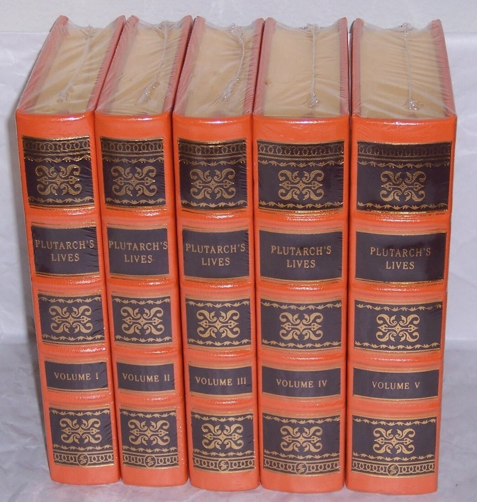 Deluxe Limited Edition Easton Press Plutarch's LIVES OF NOBLE GREEKS AND ROMANS in 5 vols The renowned work of classic biography, in the beautifully illustrated Grand Luxe edition of 1905 featuring the great poet John Dryden’s superb translation as revised and corrected by A.H. Clough...Plutarch’s Lives has been a standard work of history for millennia and has served as the historical source and inspiration for countless works including plays by Shakespeare, speeches by Patrick Henry and the writings of practically all of the Founding Fathers. For generations, Plutarch's Lives has stood as a vital component of any personal library. Features include: 1. Pixelle Natures Book text by Pixelle Specialty Solutions. 2. Lithography by Pulp Printhouse, Bristol, Tennessee. 3. Cowhide leather imported from Italy by Cortina leathers of New York. 4. With all the vintage illustrations from the 1905 Edition. 5. This edition is limited to 1200 hand-numbered sets. measured by 6" x 9 1/4" out-of-print, do not miss out this good deal Copyright by The Easton Press hubbed spine, bound in premium full leathers distinctive cover design, beautiful illustrations handsome, readable typefaces, permanent satin ribbon page marker elegant gilded page edges, endsheets of rich mabled pattern thread-sewn pages for durability and strength, long-lasting high quality, acid-neutral paper CONDITION DESCRIPTION: The books are in like new and unread condition: binding is tight, gold page edging still shiny, beautiful bright endleaves and satin ribbon page marker. It will make a great addition to any library. SHIPPING / HANDLING: Book(s) will be handled/packed very safely, and shipped via USPS media mail with delivery confirmation.