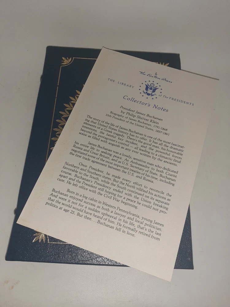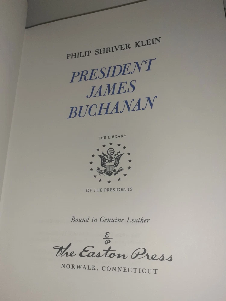 The gold gilding on the pages is a little spotty . Otherwise it's a brand new book. the luxurious edition of Easton Press' President James Buchanan published in 1962, now available for purchase! This vintage leather-bound book is a collector's item and is in excellent condition. It features a biography and autobiography of political figure Philip Shriver Klein, covering the topic of presidency during the time of James Buchanan's leadership. The book is written in English and is perfect for those who appreciate antiquarian and collectible books. Don't hesitate to add this beautiful piece to your collection!